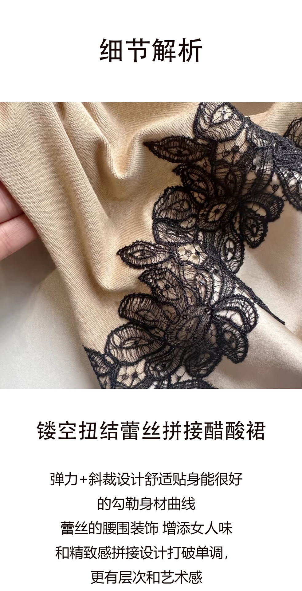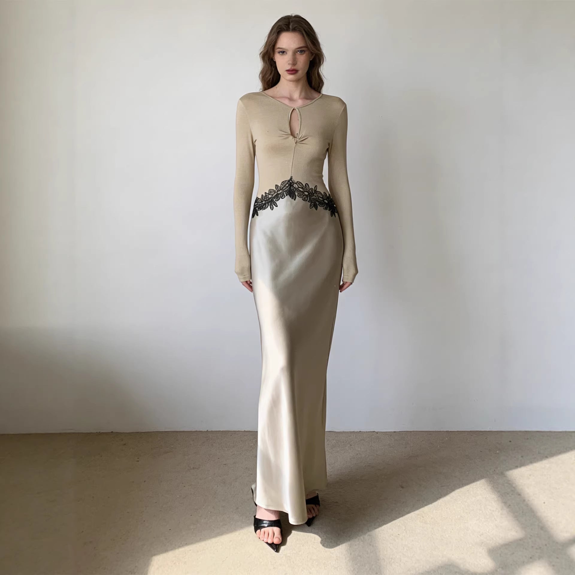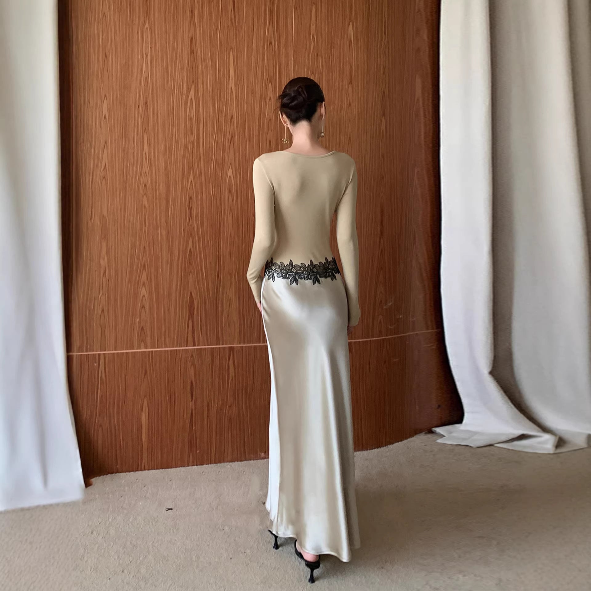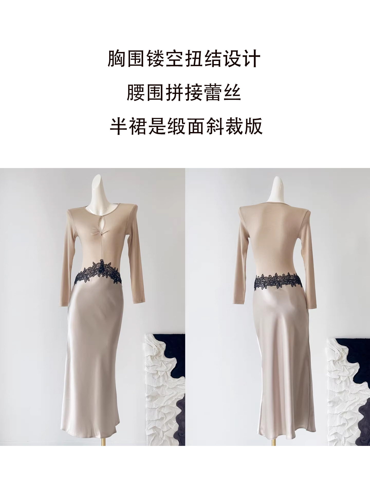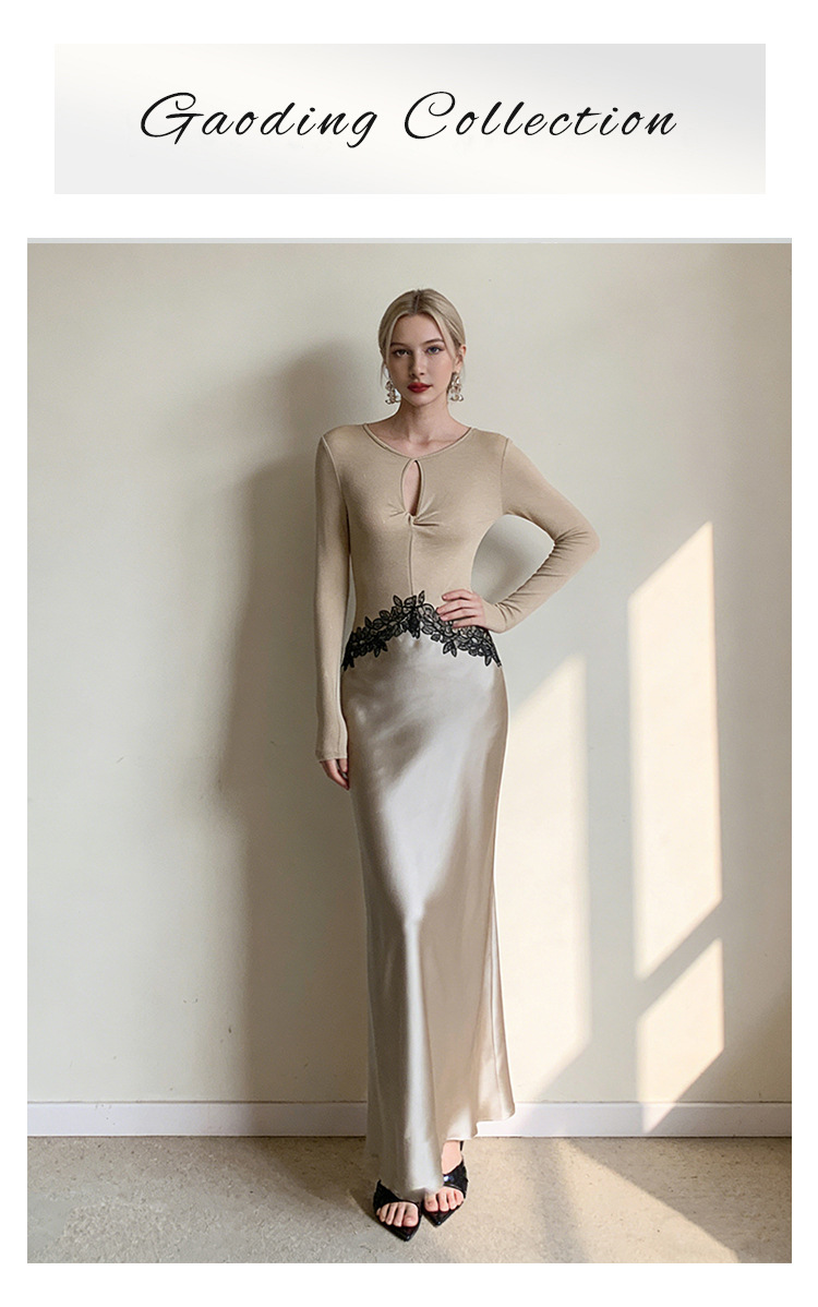 Haute couture new waist embroidered lace splicing imported acetic acid holiday banquet design round neck long sleeve dress