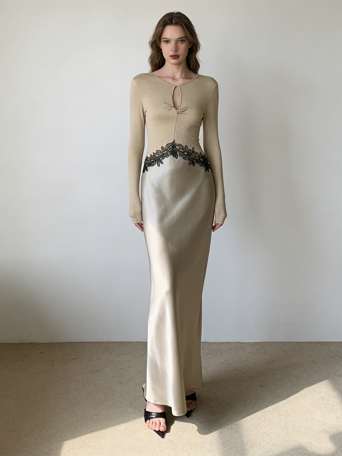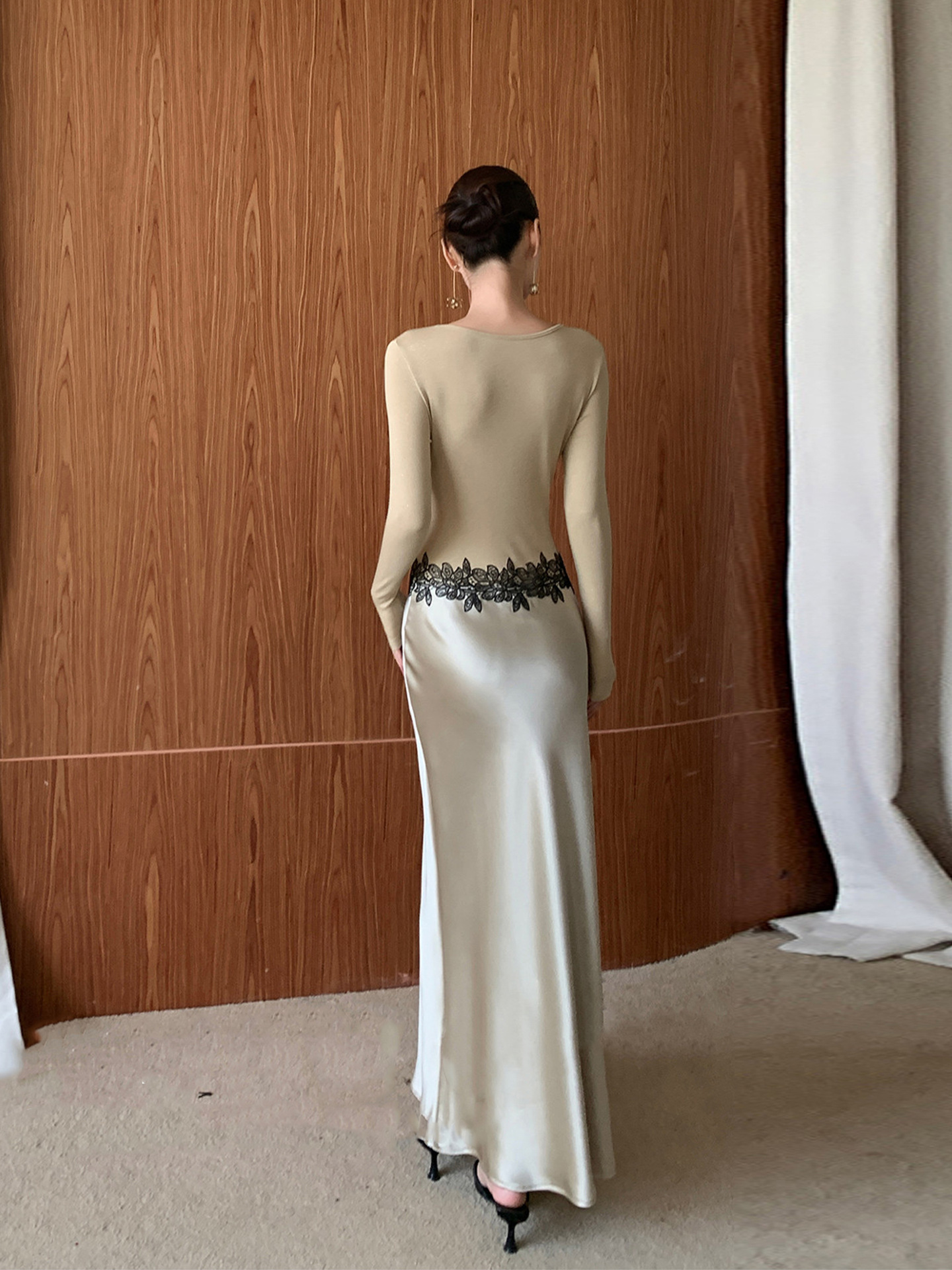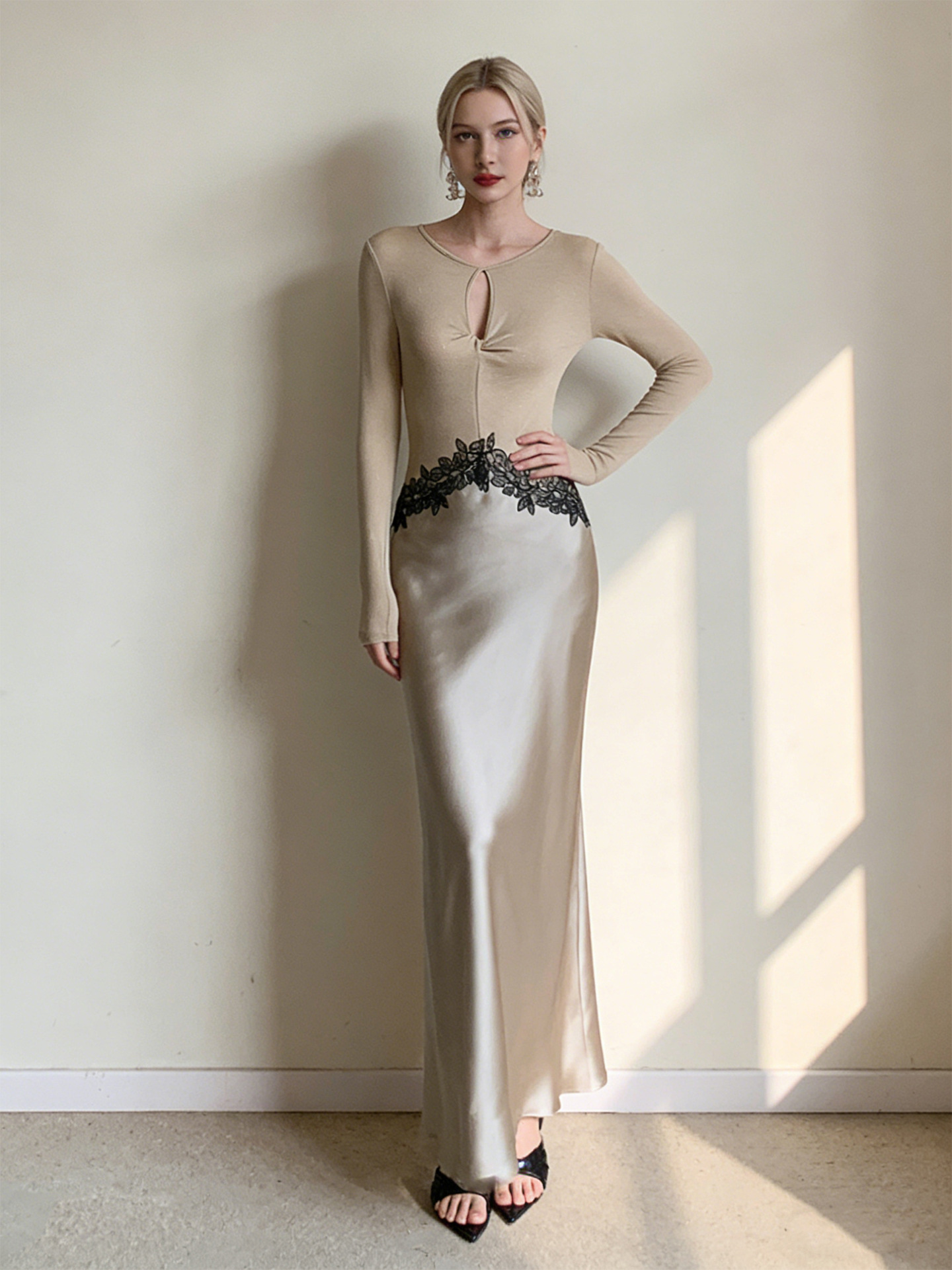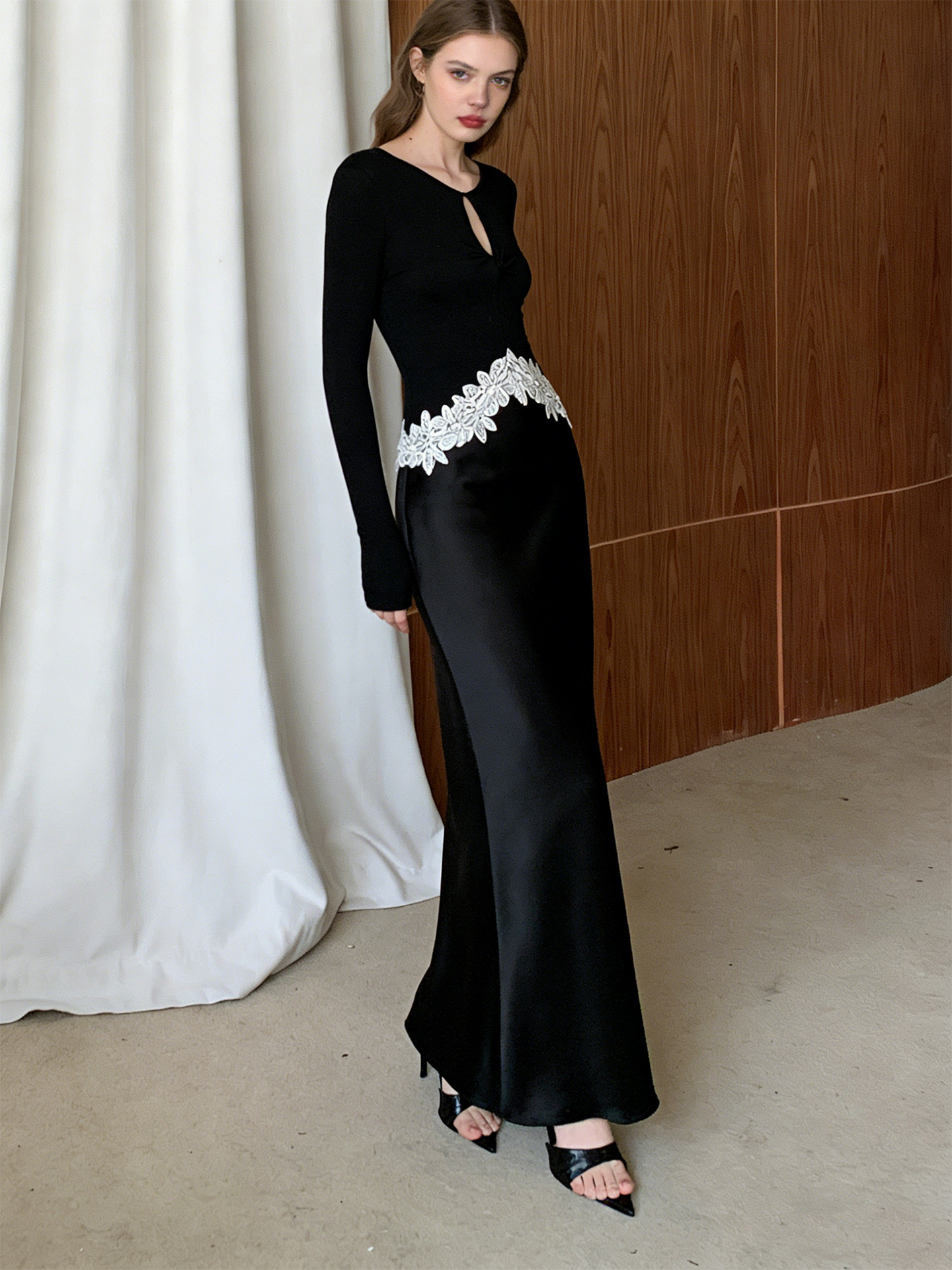 Haute couture new waist embroidered lace splicing imported acetic acid holiday banquet design round neck long sleeve dress
