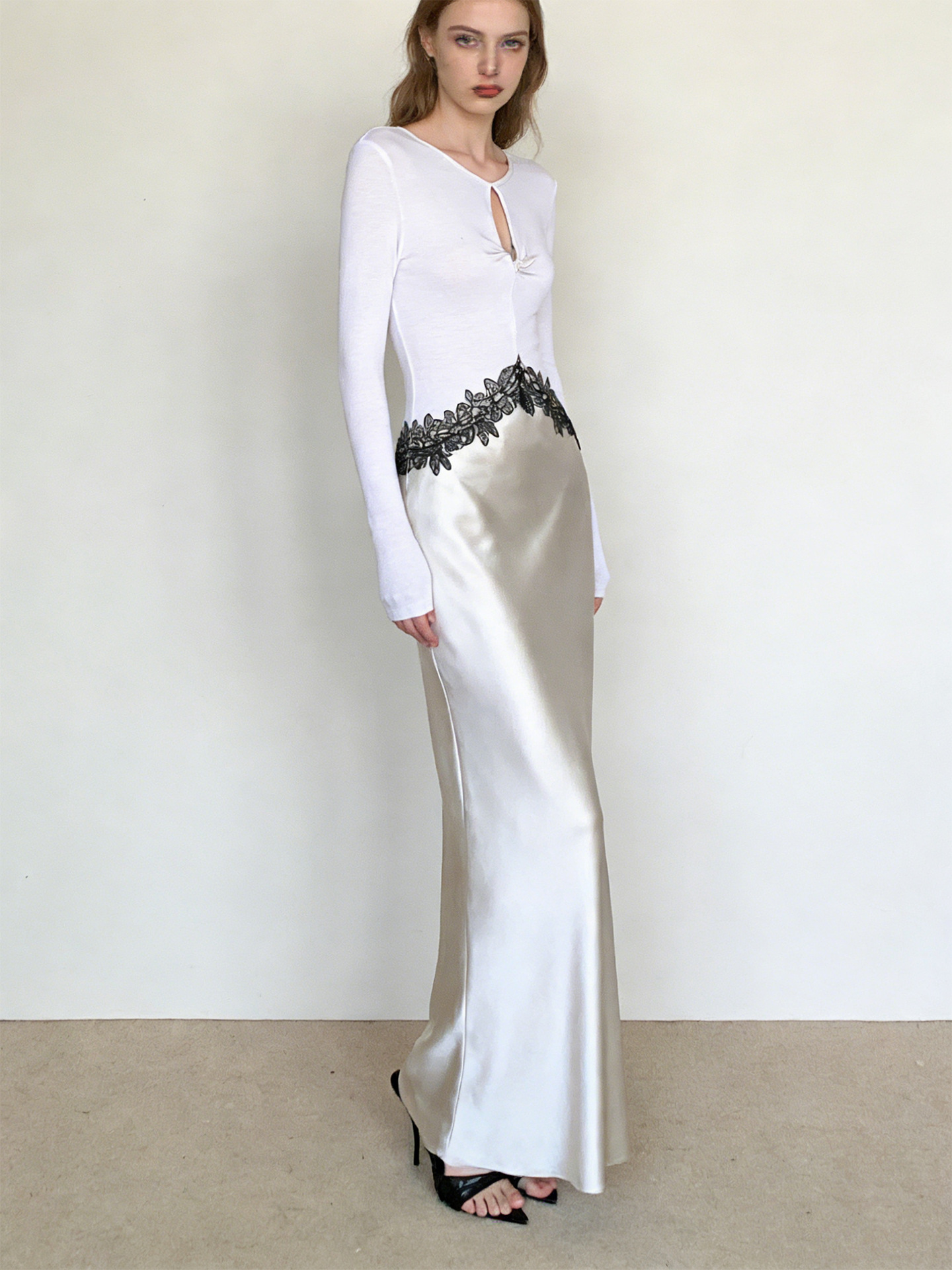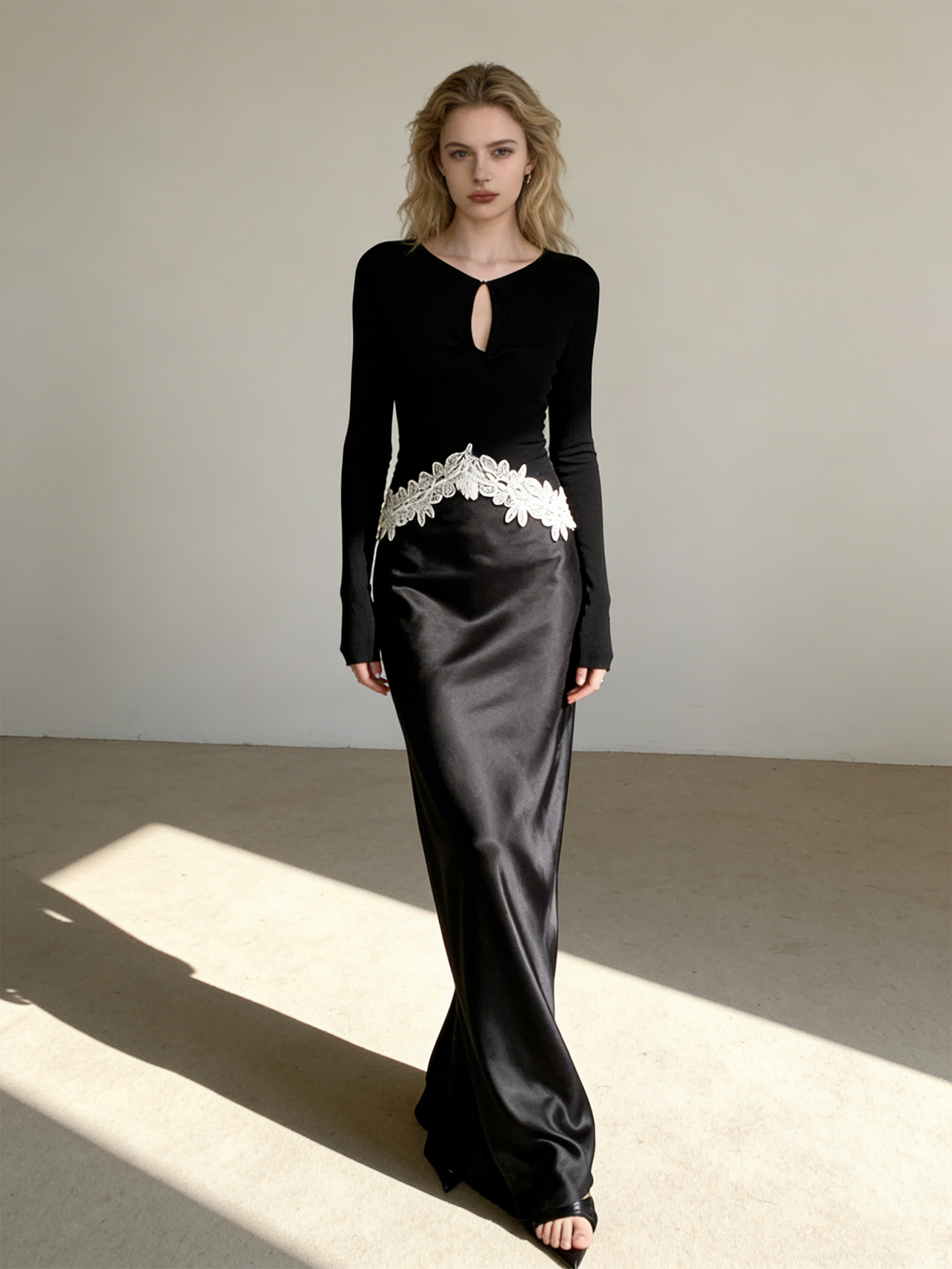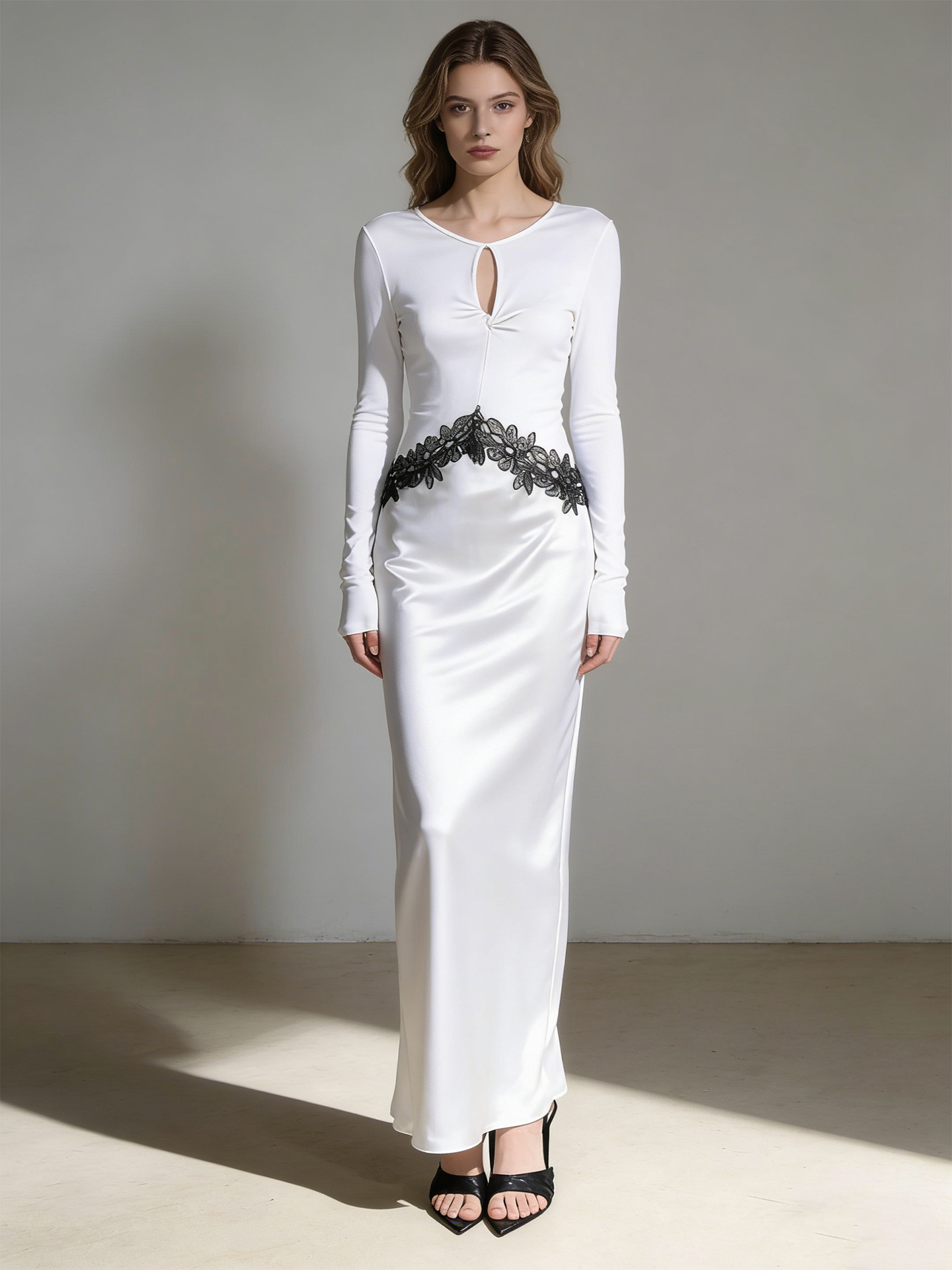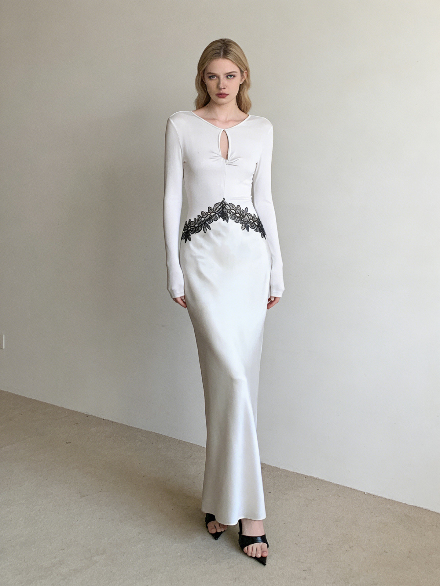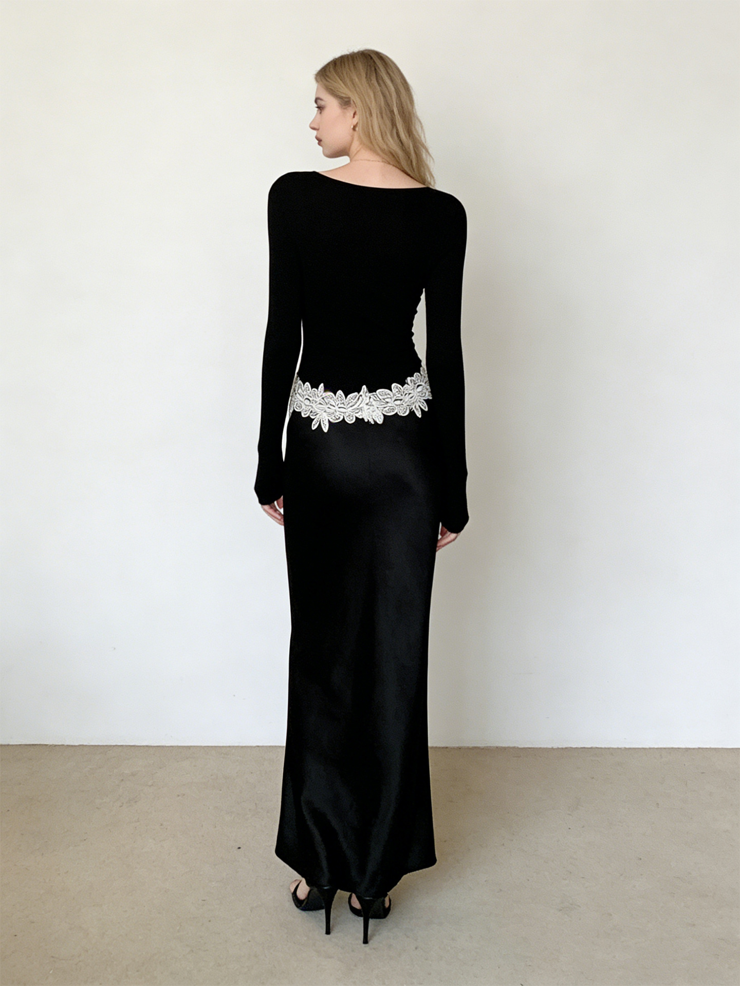 Haute couture new waist embroidered lace splicing imported acetic acid holiday banquet design round neck long sleeve dress