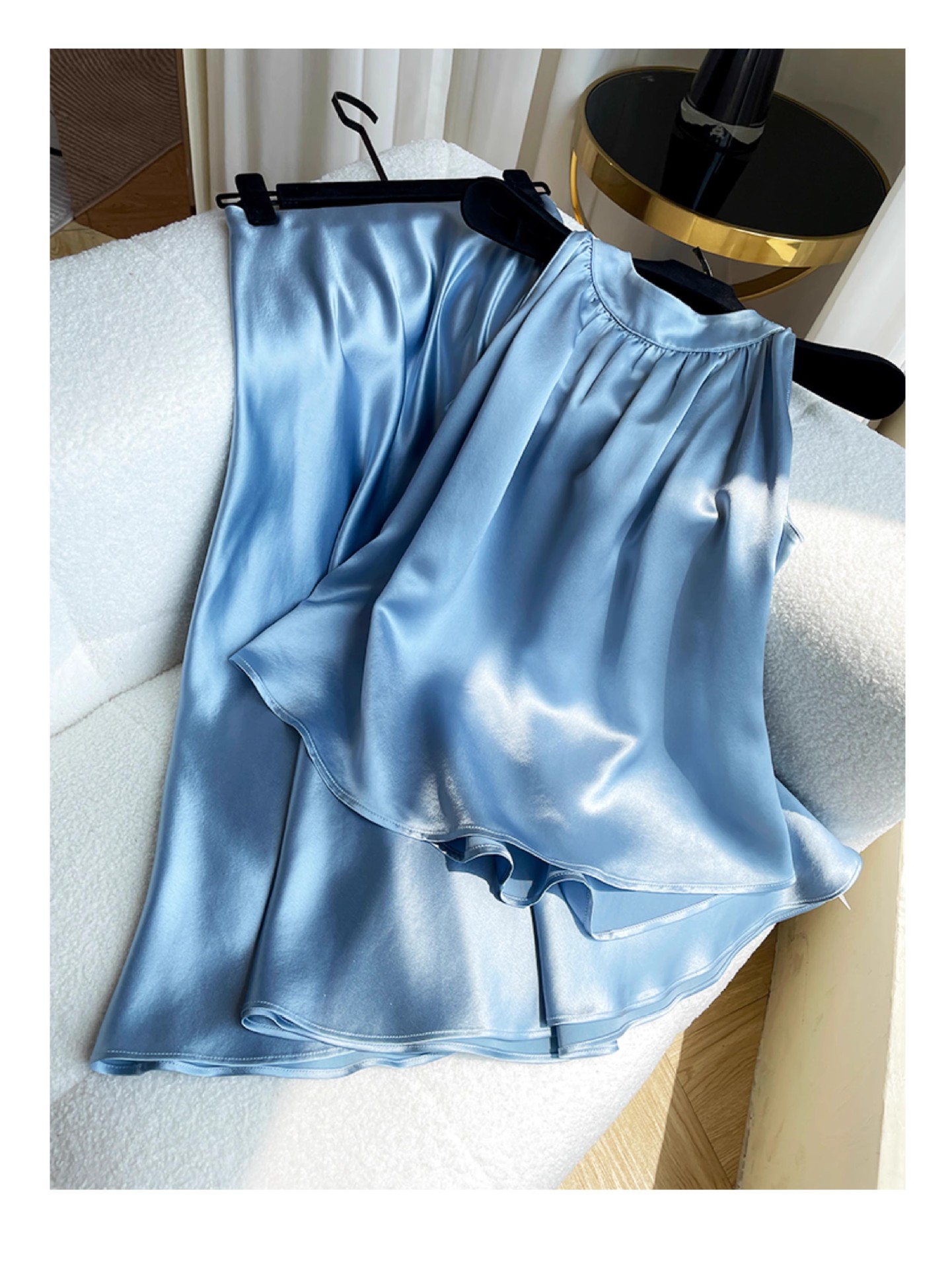 Haute couture real acetic acid satin texture silky off-shoulder top women's summer high-end sense with skirt two-piece suit commute