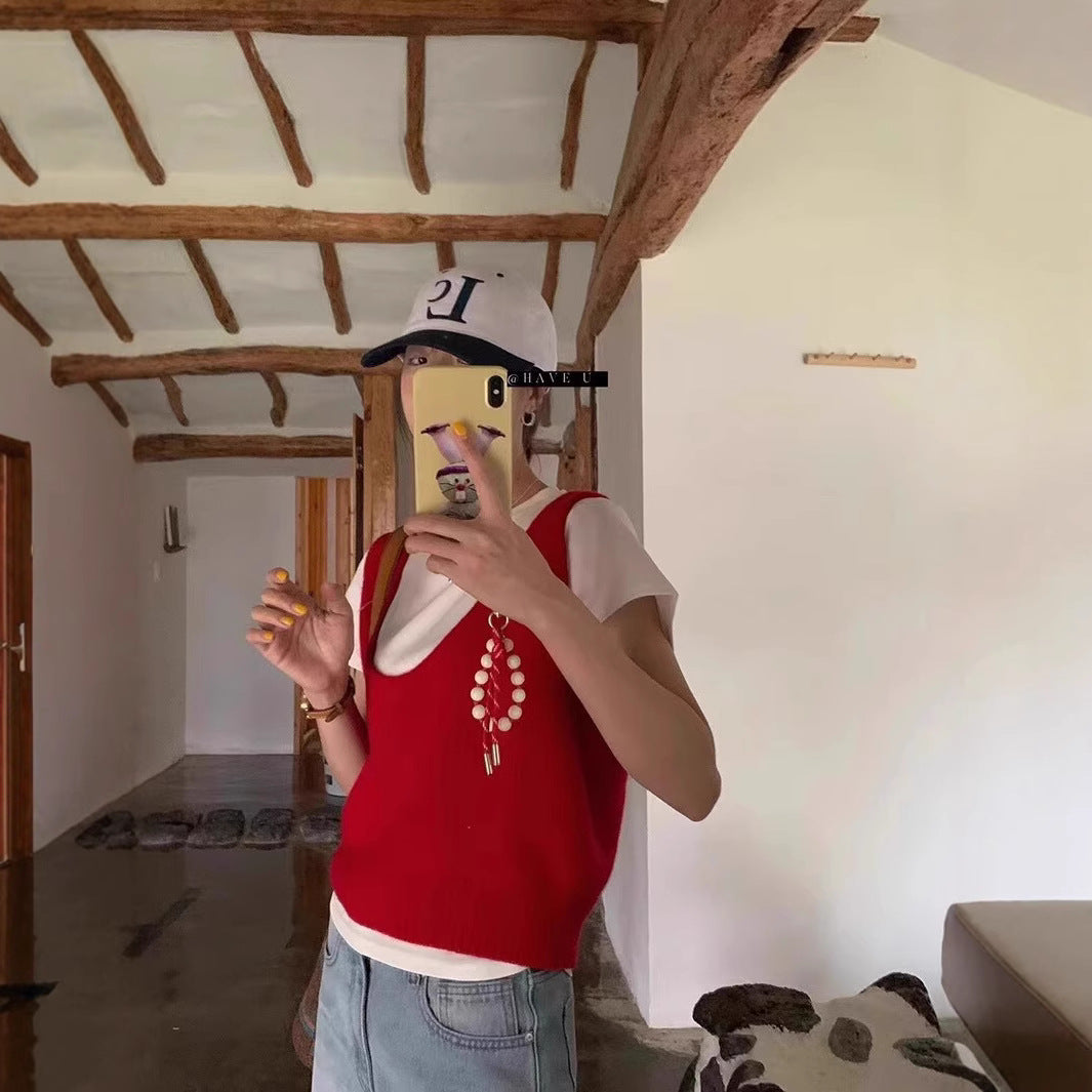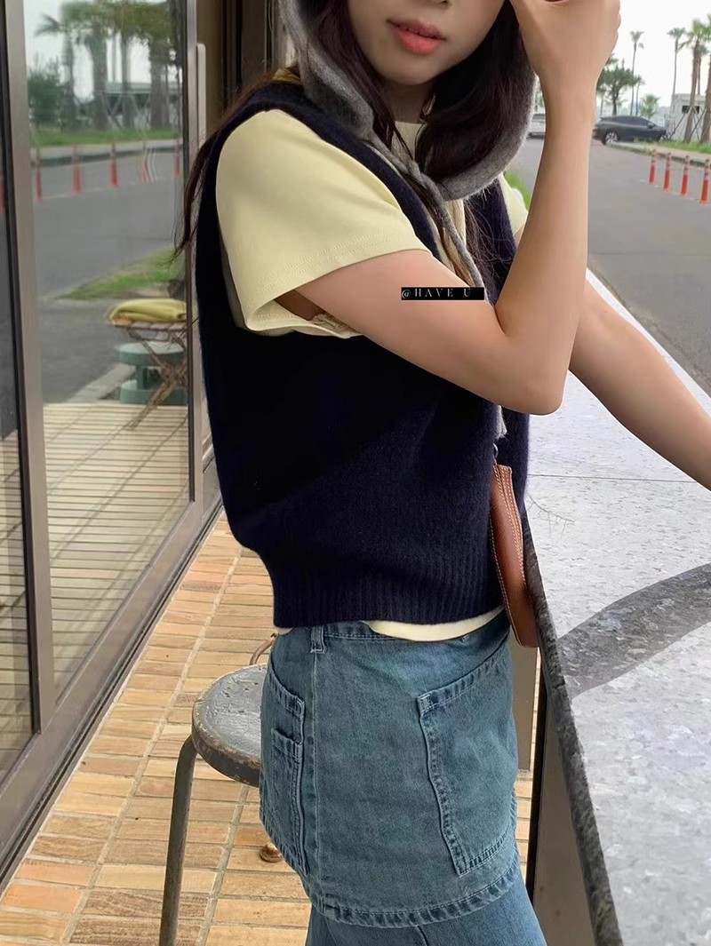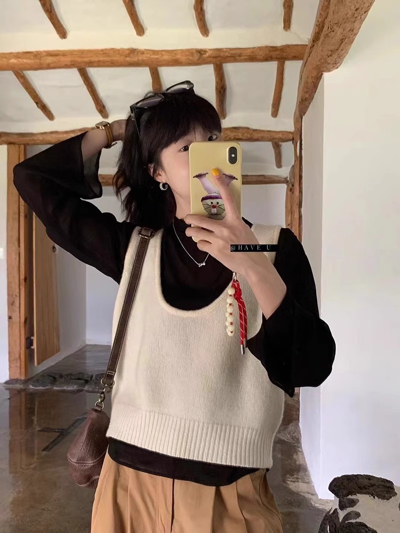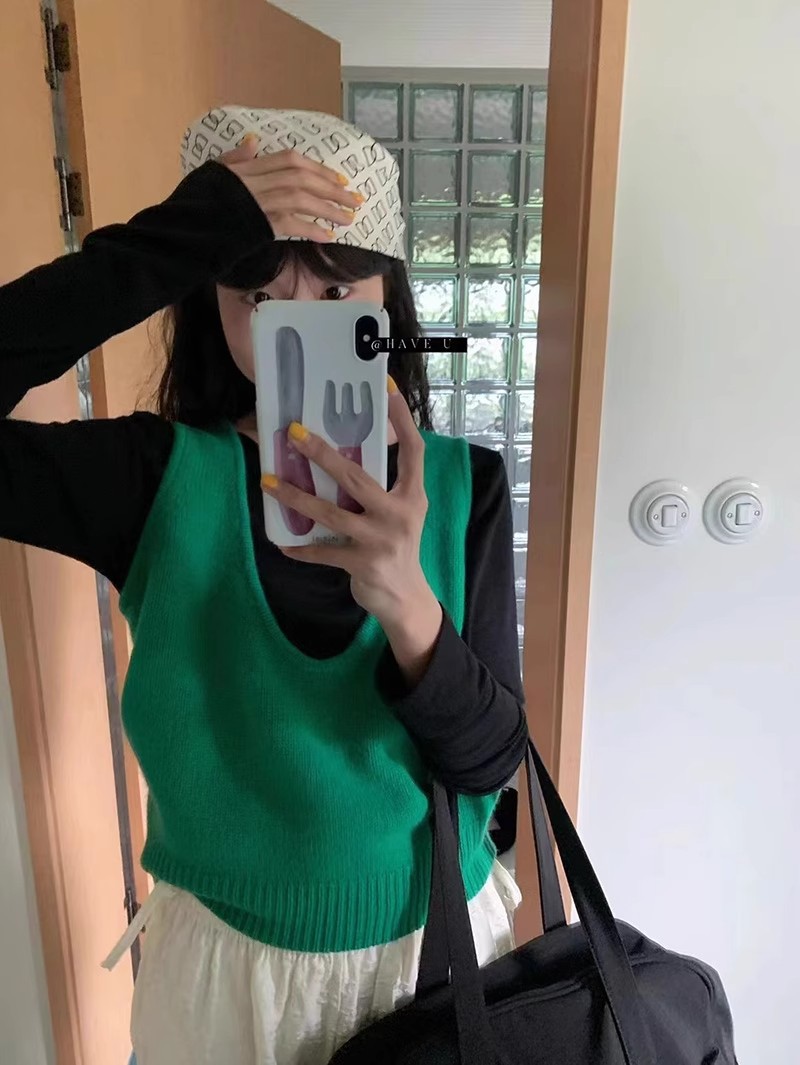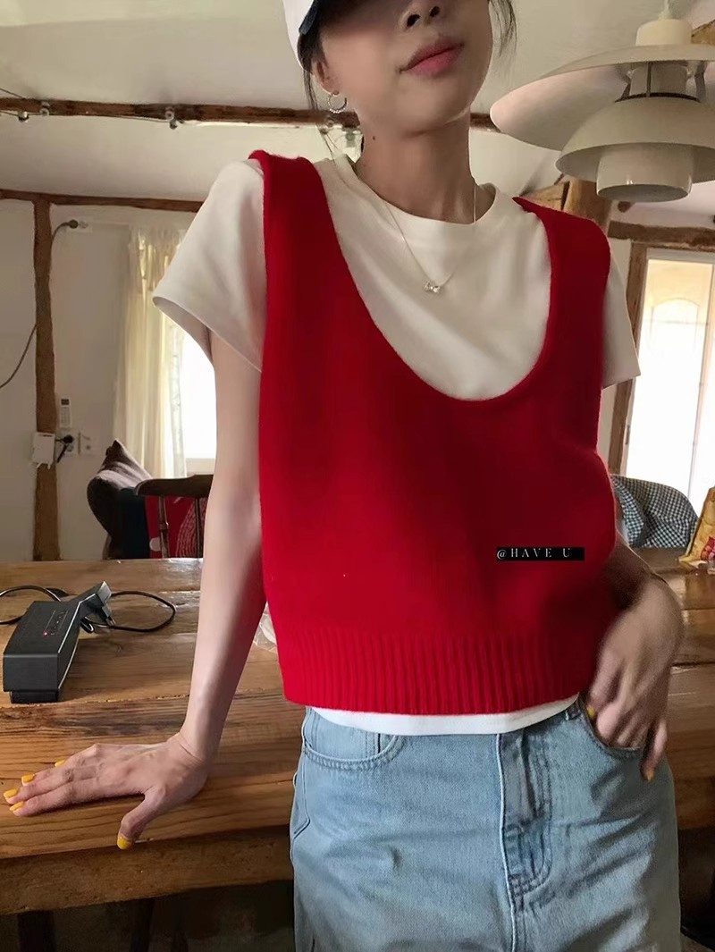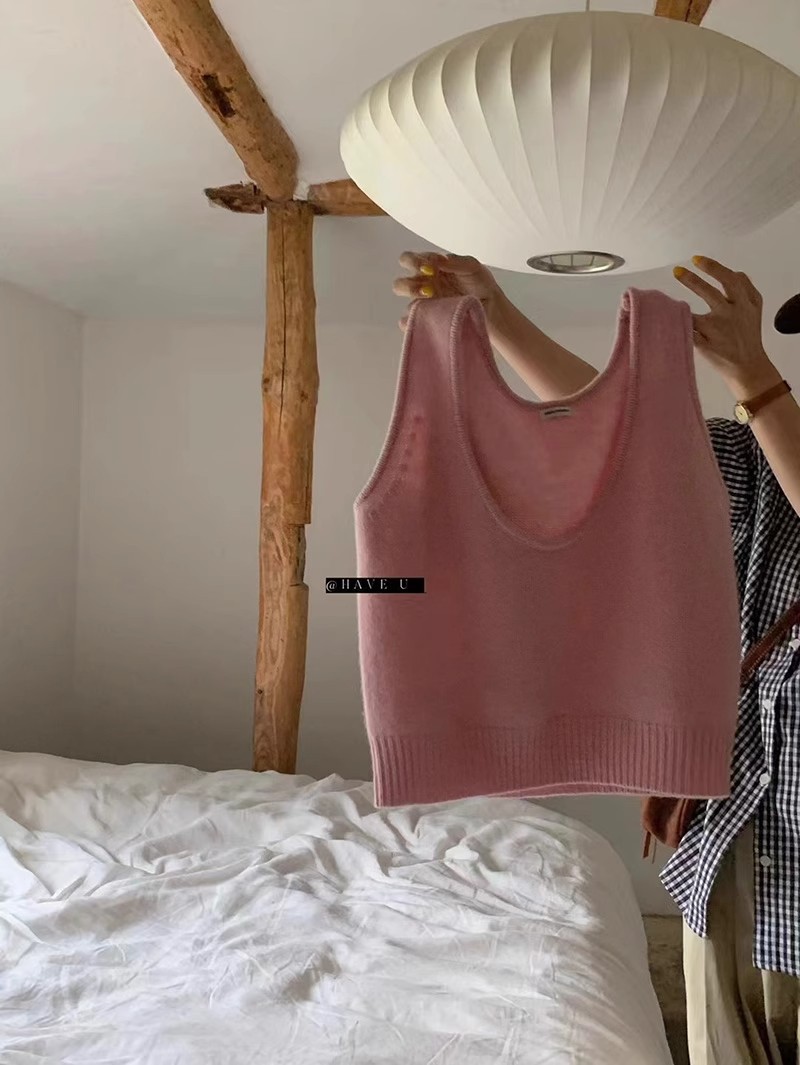 HAVE U wool knitted vest u neck elastic short small Korean ins wind wide shoulder strap stacked vest women