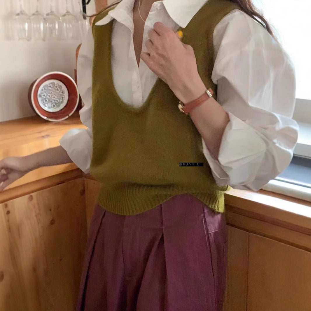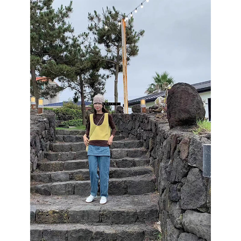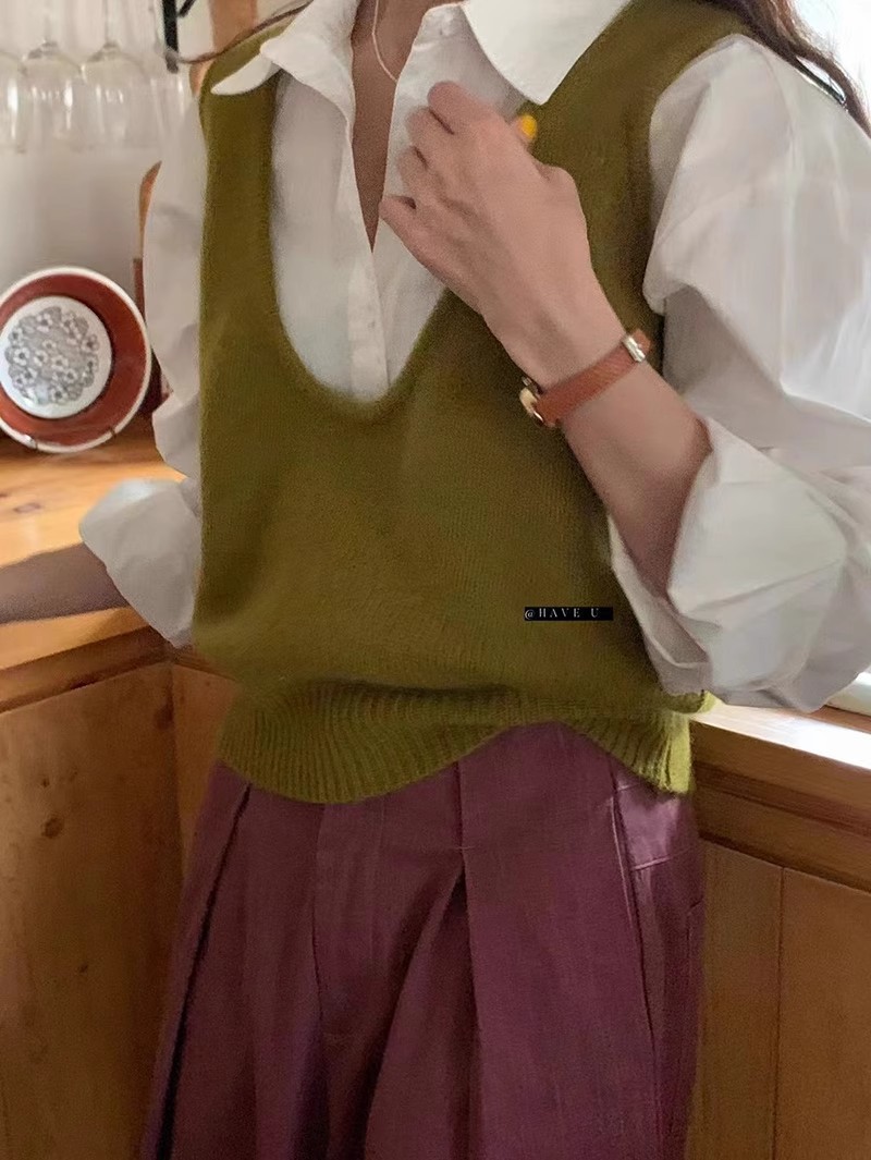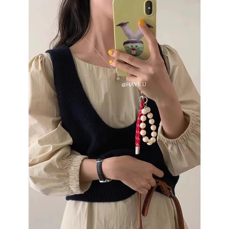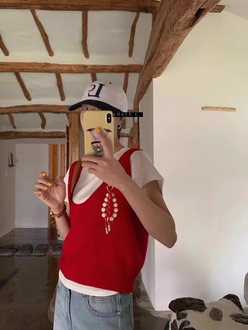 HAVE U wool knitted vest u neck elastic short small Korean ins wind wide shoulder strap stacked vest women