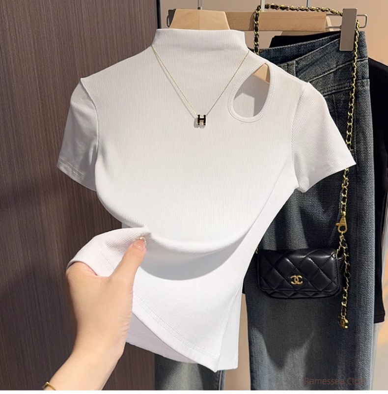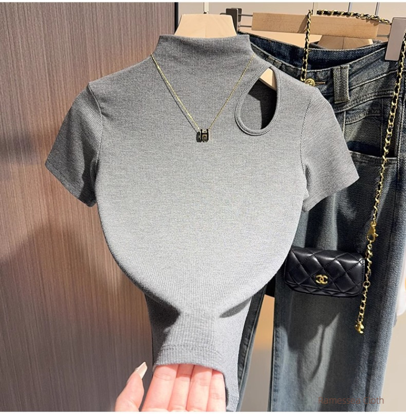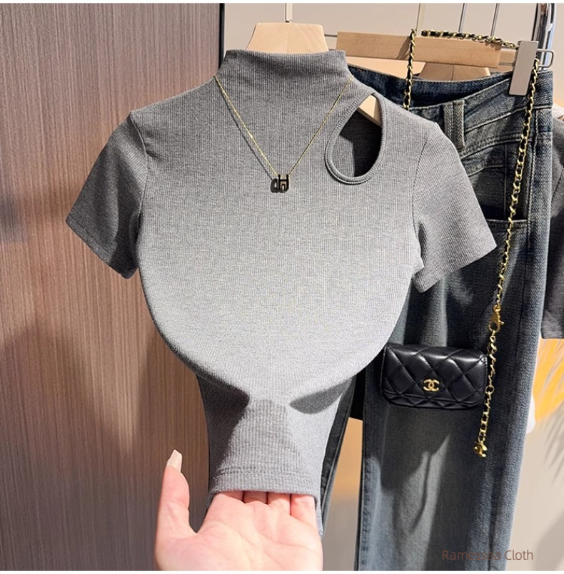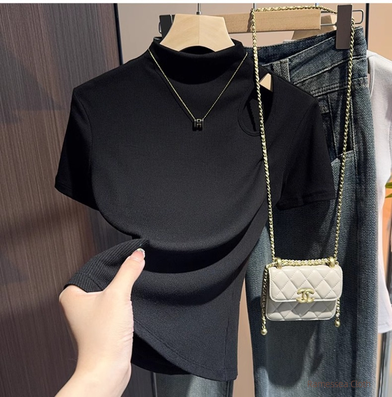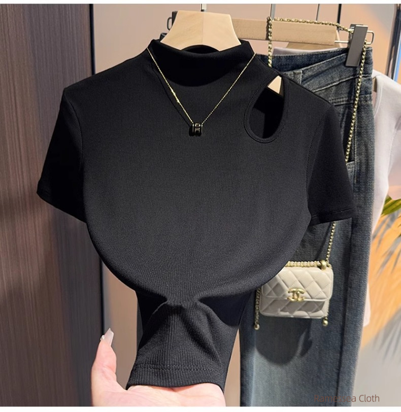 High-end black semi-turtleneck short-sleeved t-shirt women's 2025 new summer hollowed-out knitted front shoulder thin top trendy