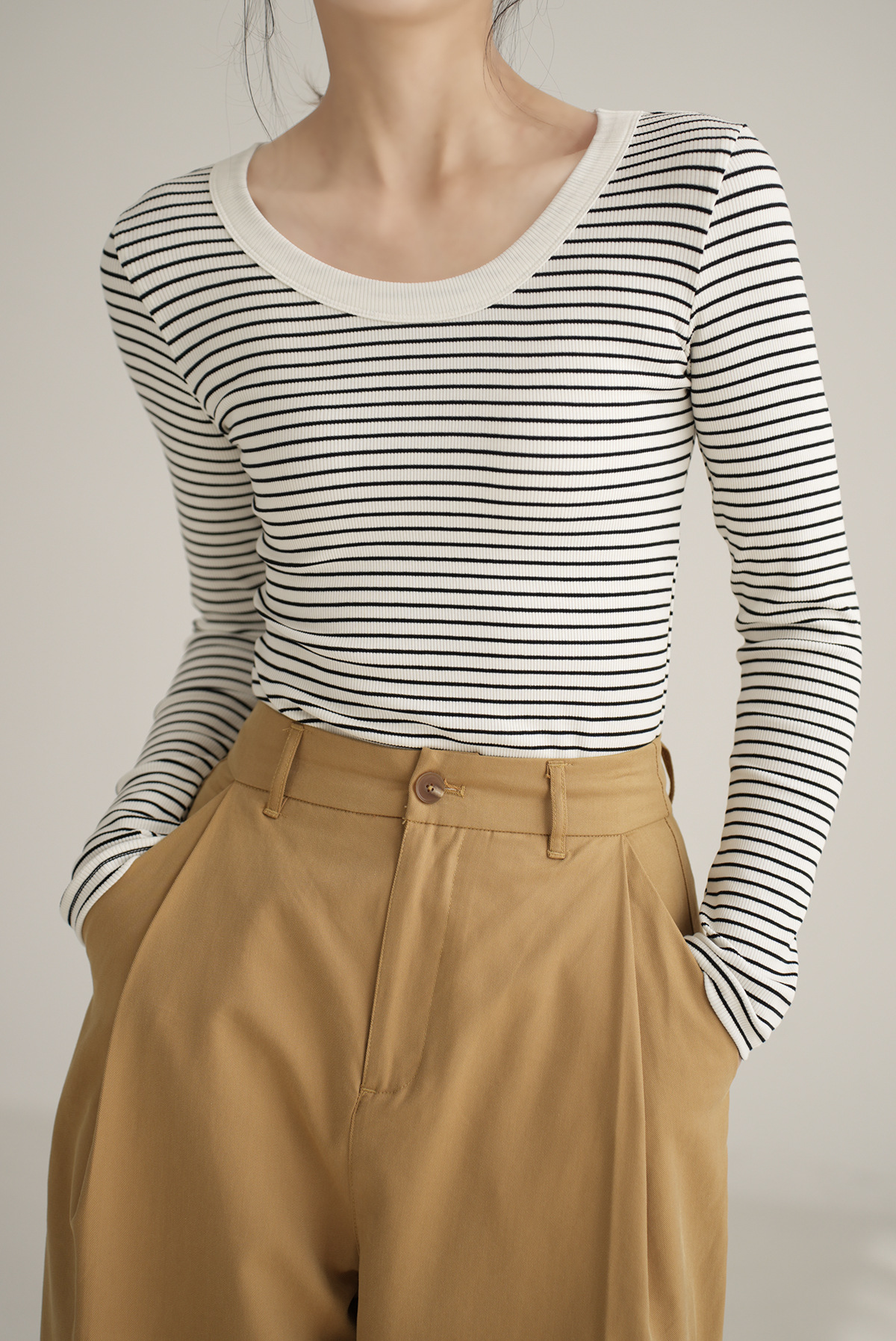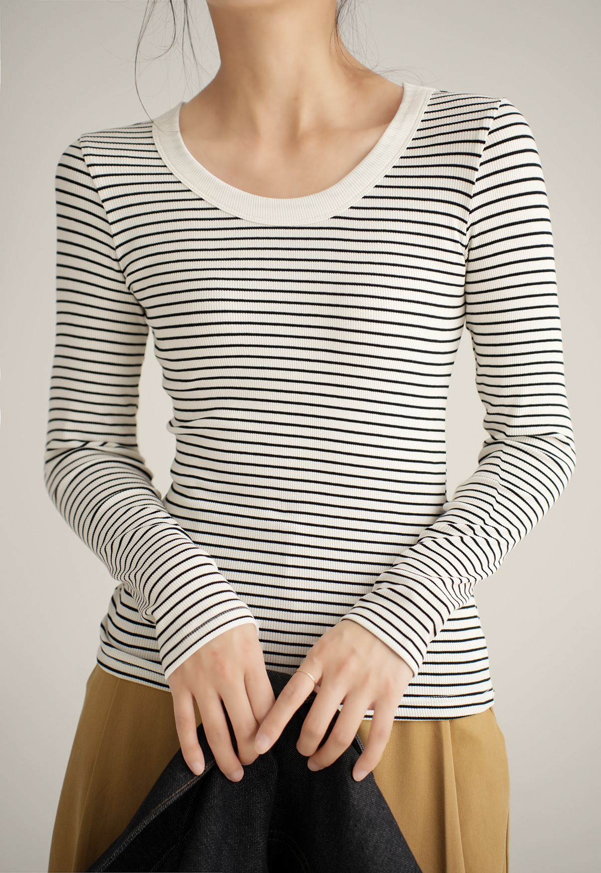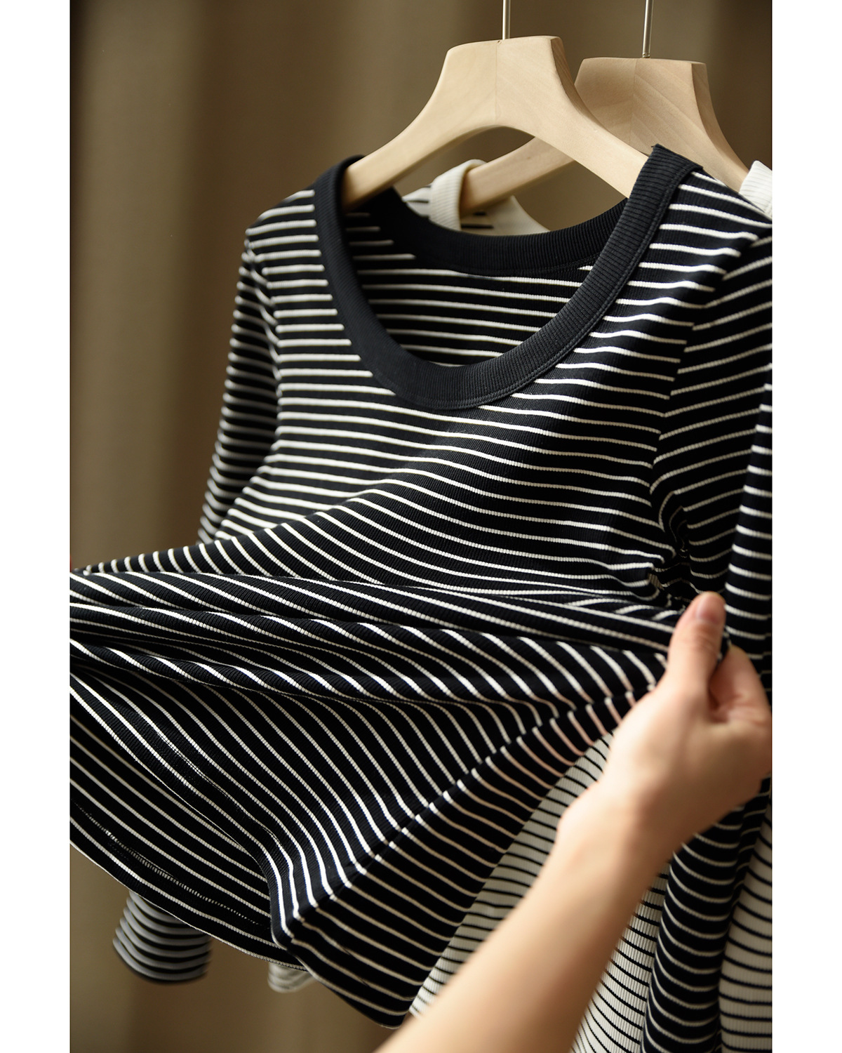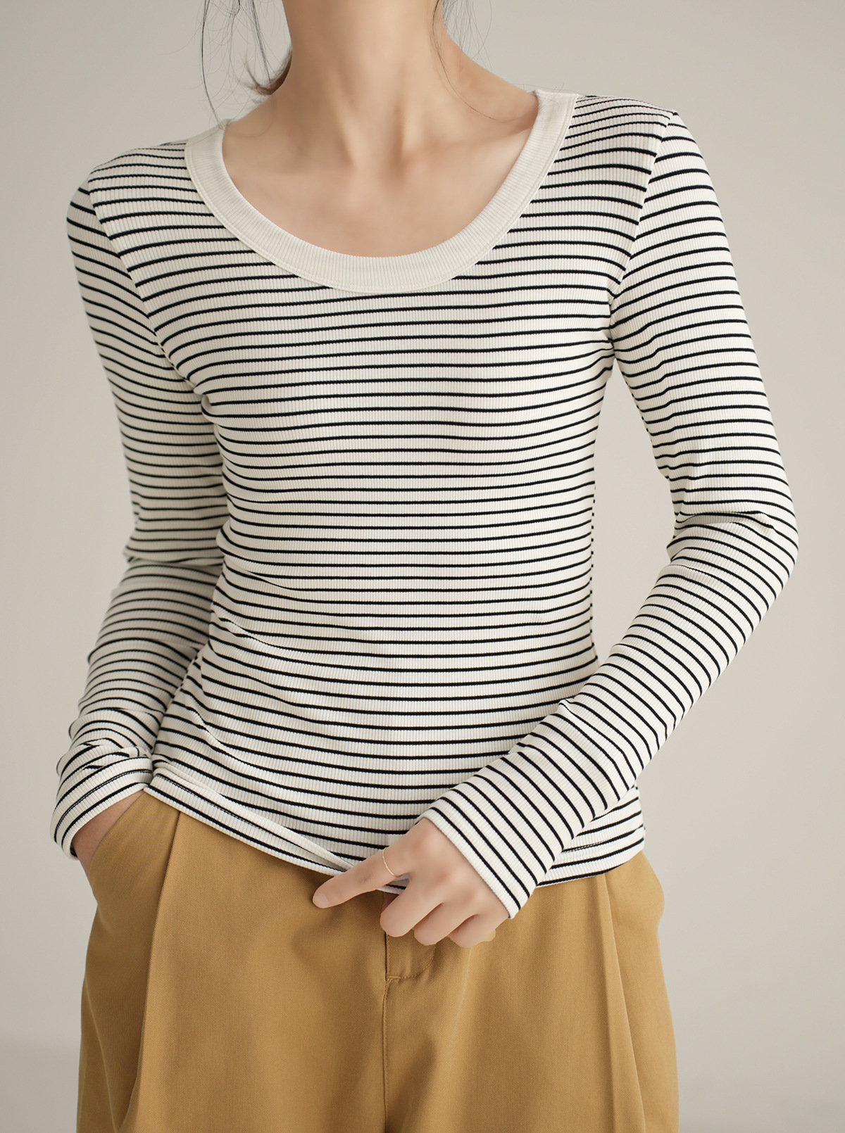High-quality pure cotton T-shirt women's long-sleeved striped bottoming shirt 2026 autumn new round neck slim-fitting and thin versatile top