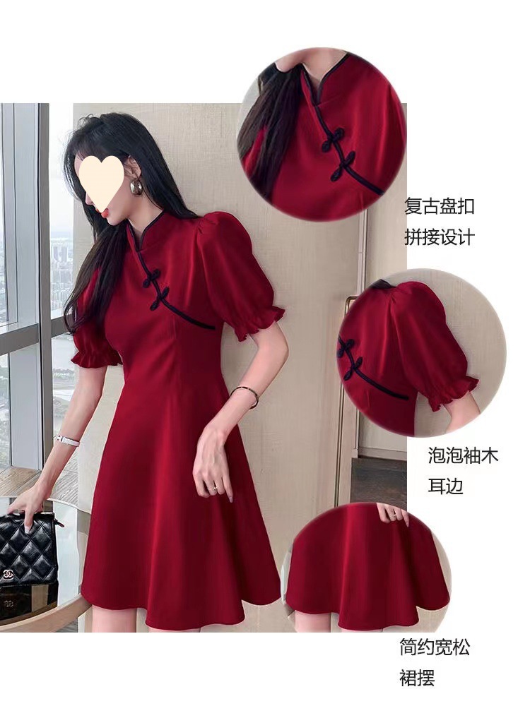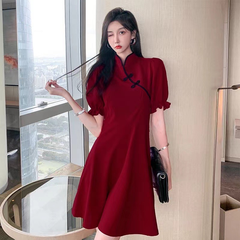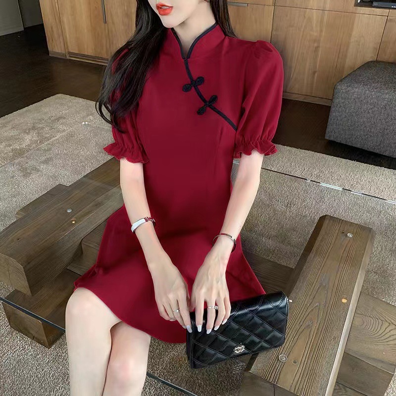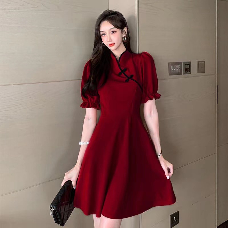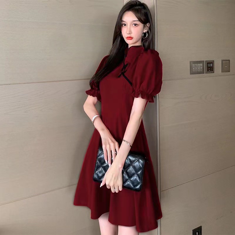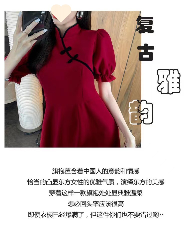 Improved version of cheongsam black dress women's medium and long waist thin a-word skirt bubble sleeves high waist temperament skirt