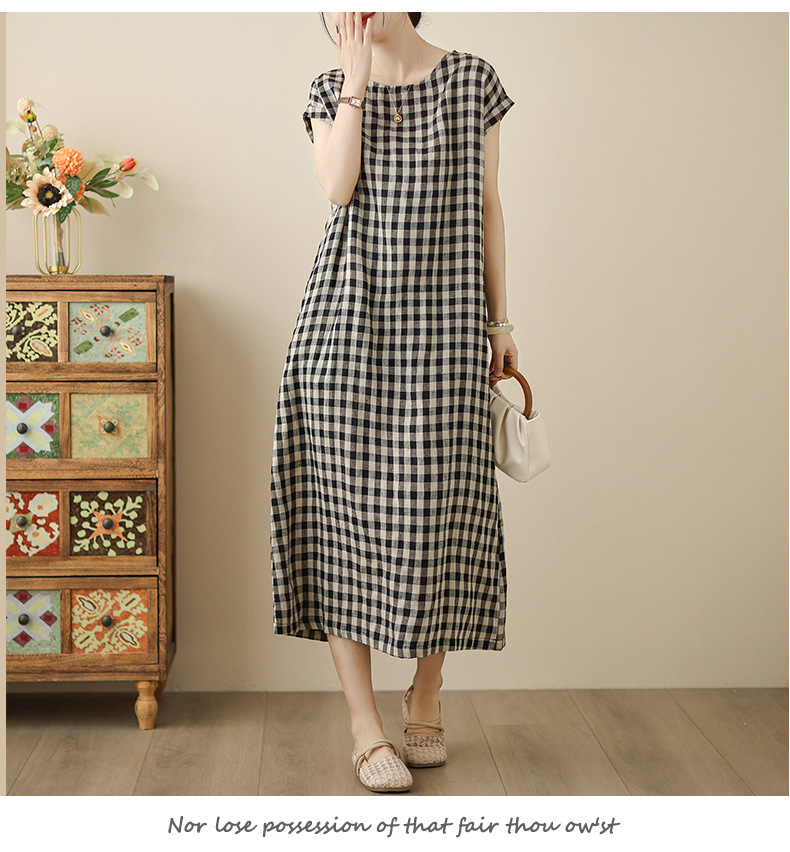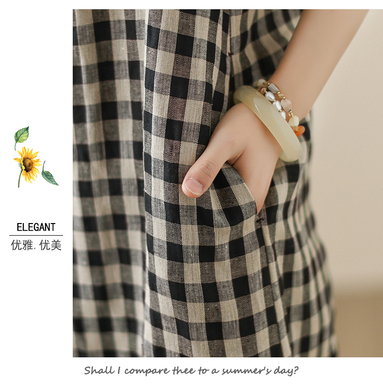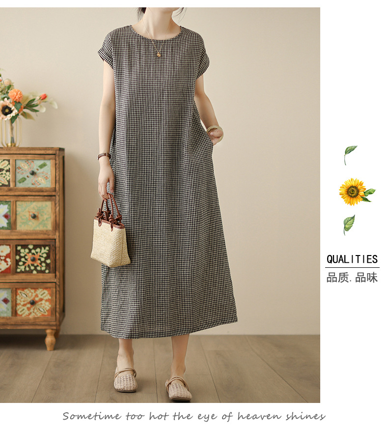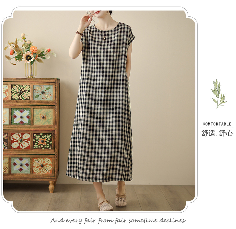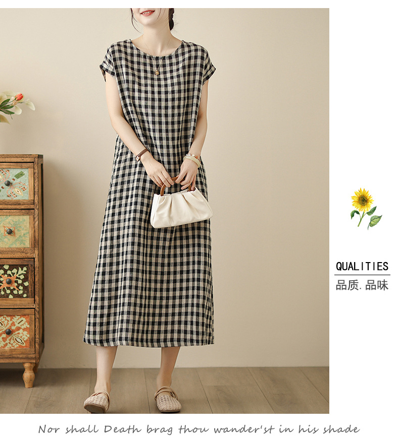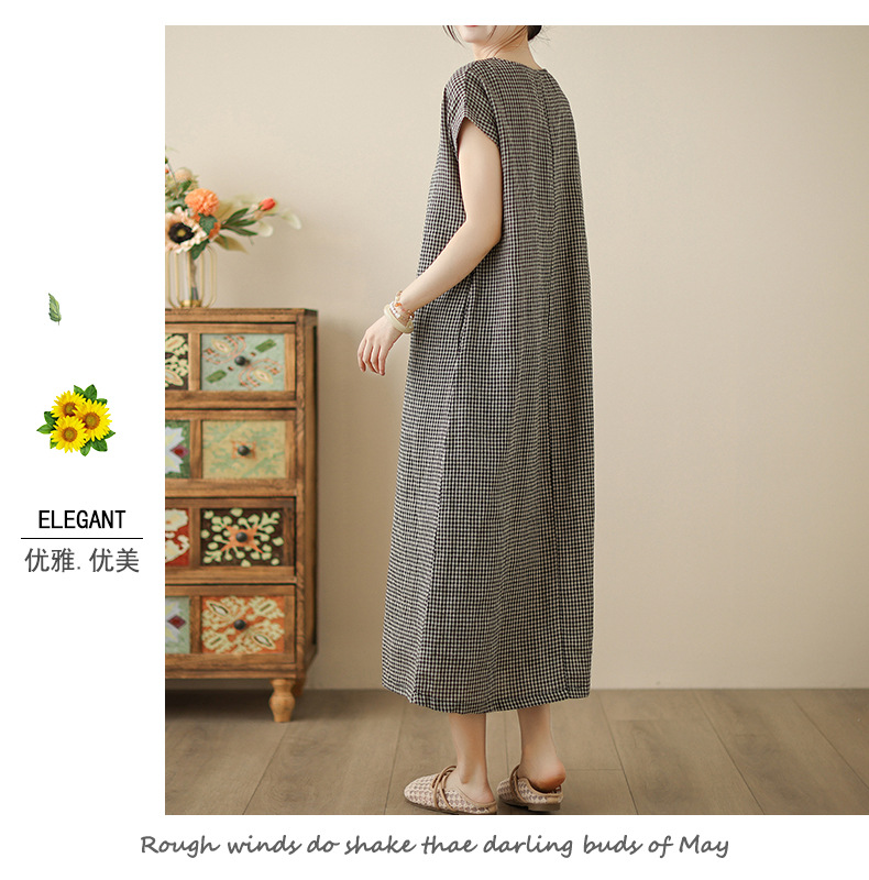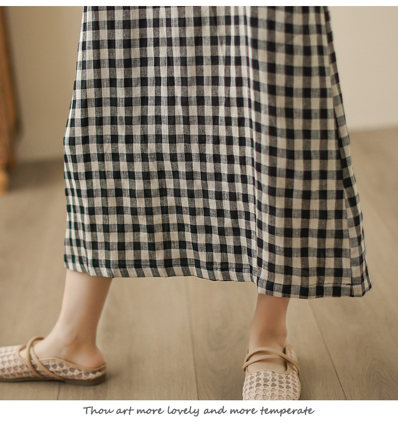 In the summer of 2025, the new cotton and linen plaid literary and loose casual medium and long dresses women's clothing