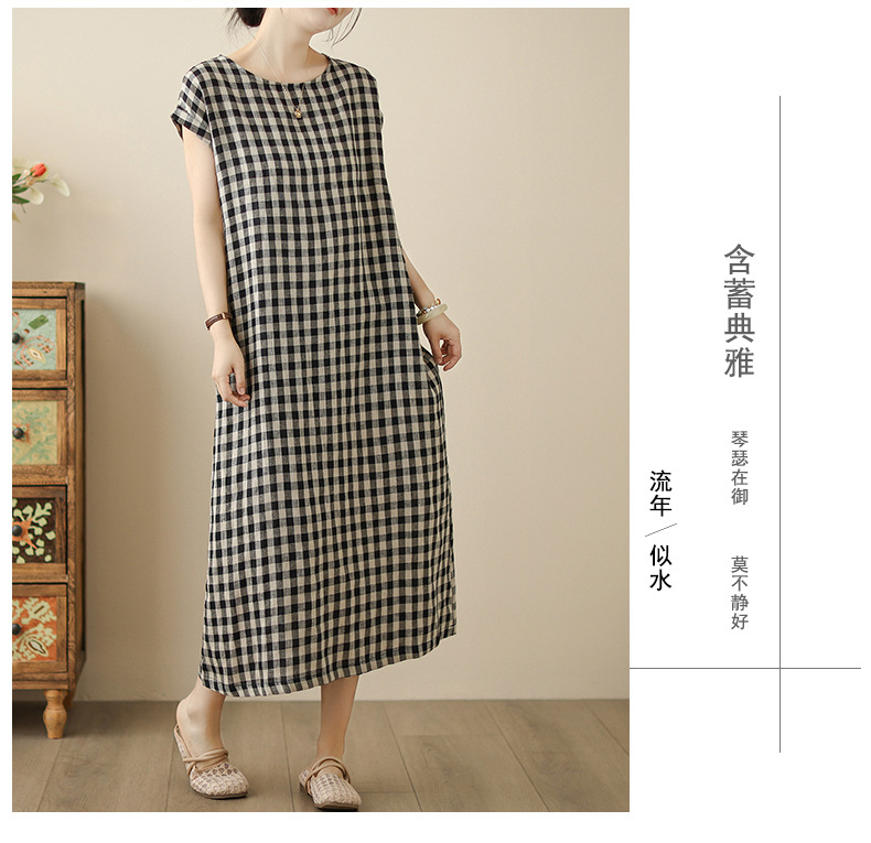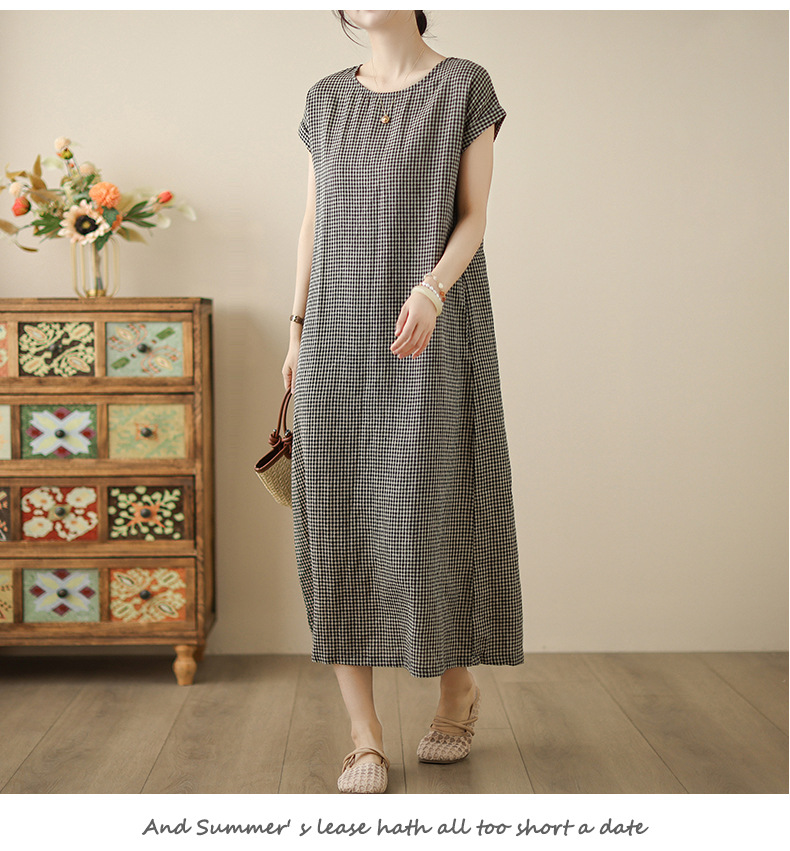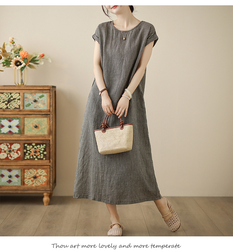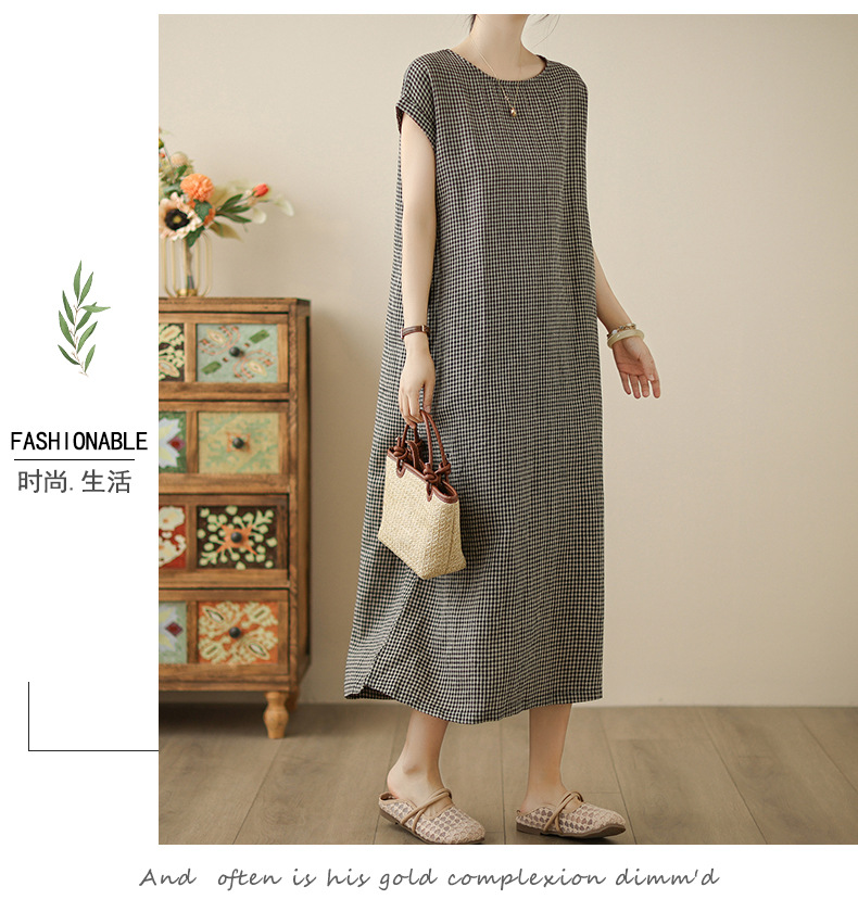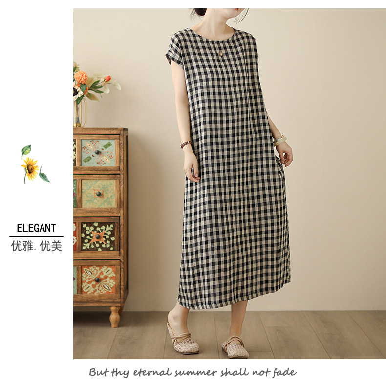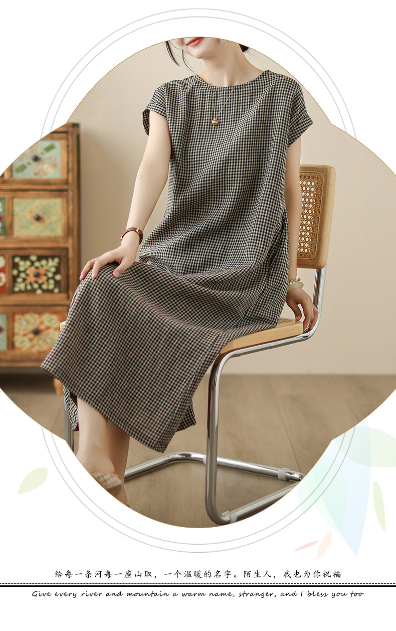 In the summer of 2025, the new cotton and linen plaid literary and loose casual medium and long dresses women's clothing