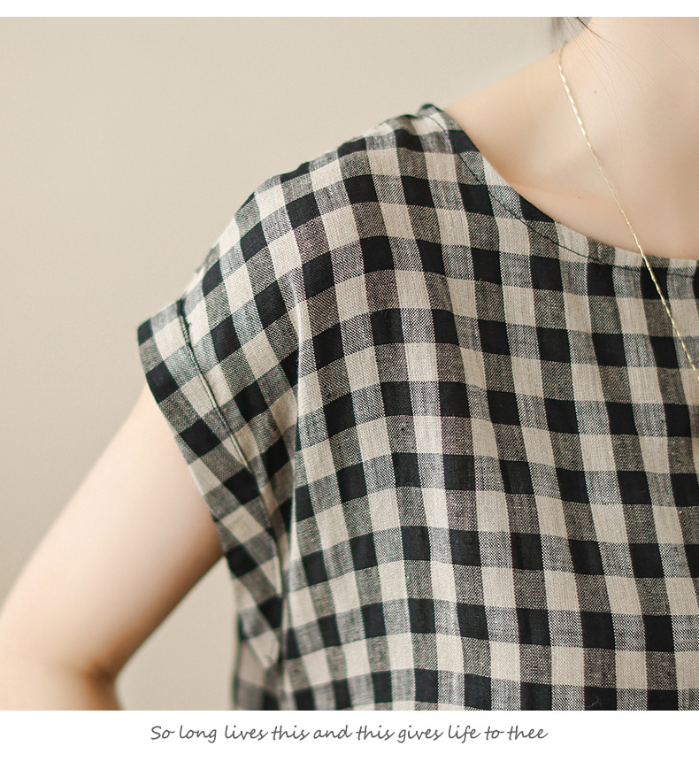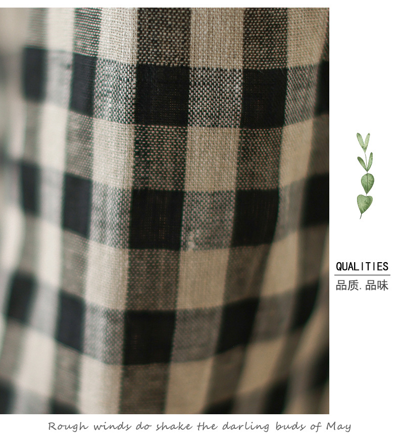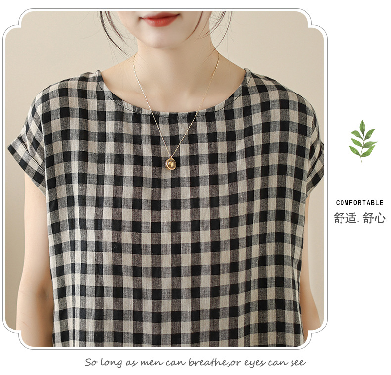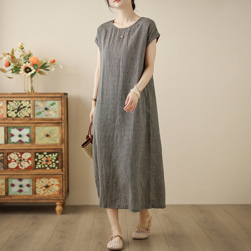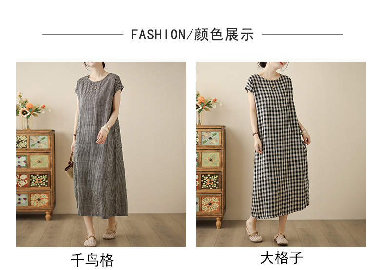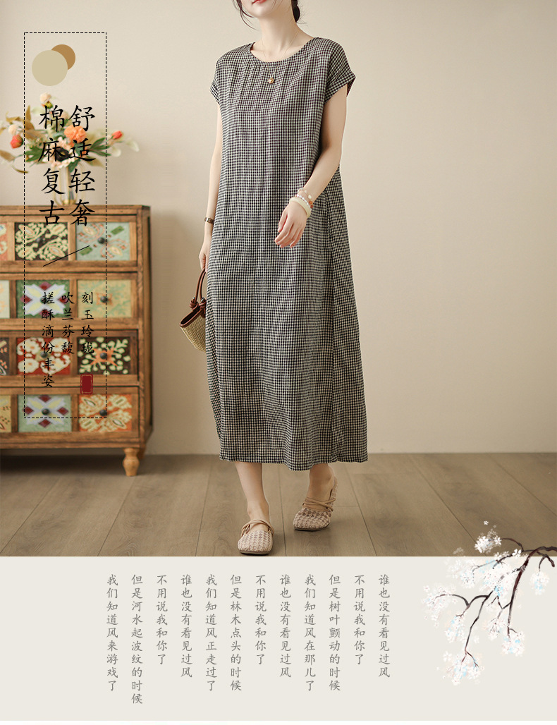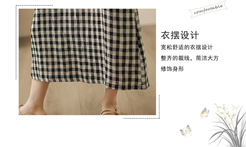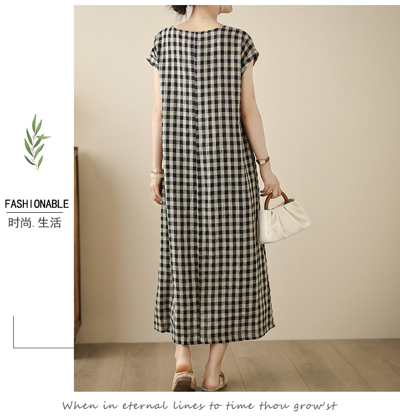 In the summer of 2025, the new cotton and linen plaid literary and loose casual medium and long dresses women's clothing