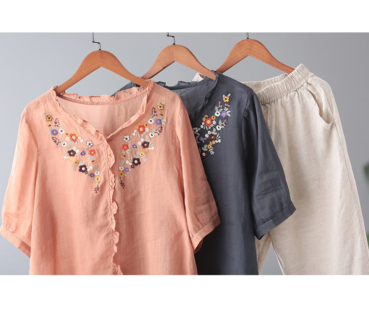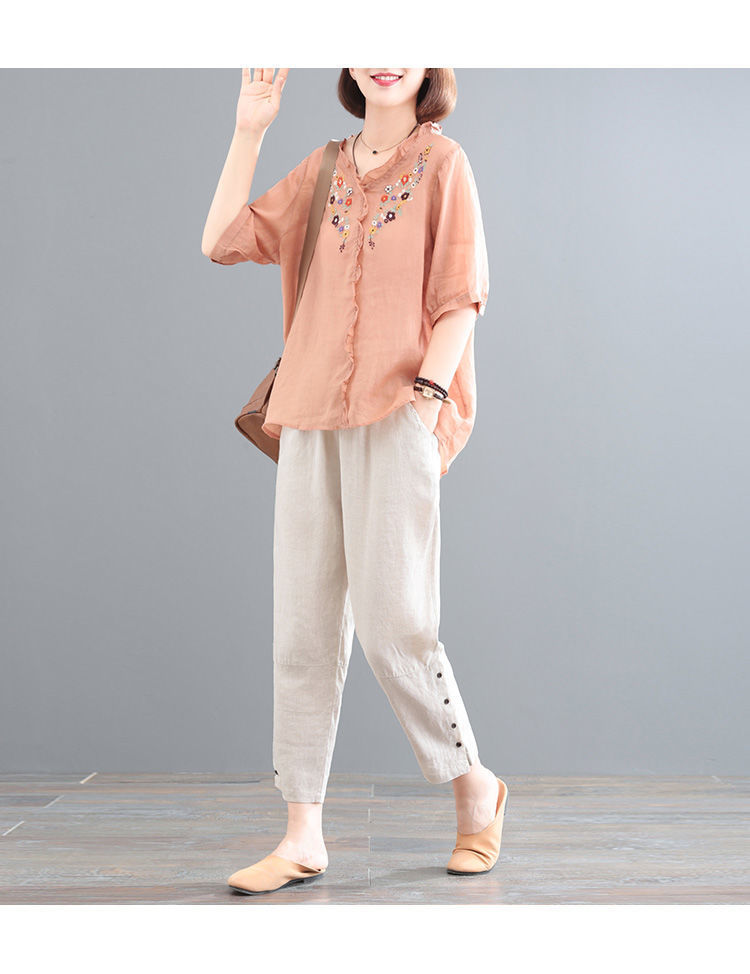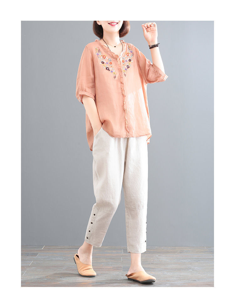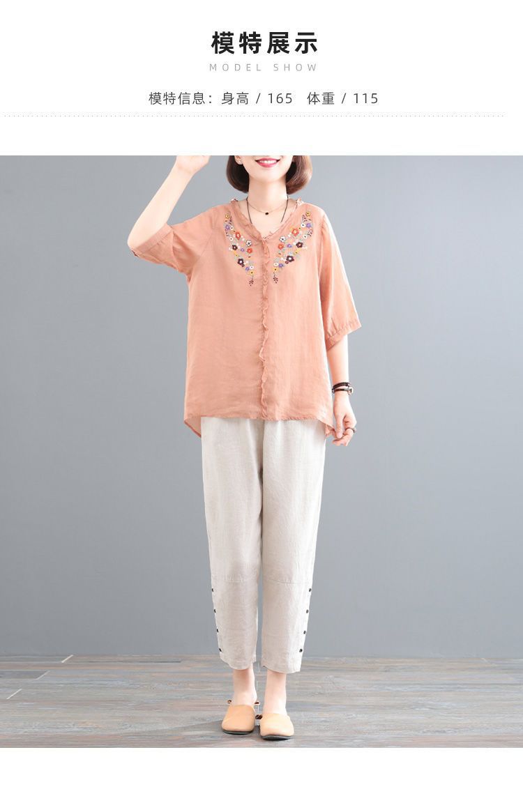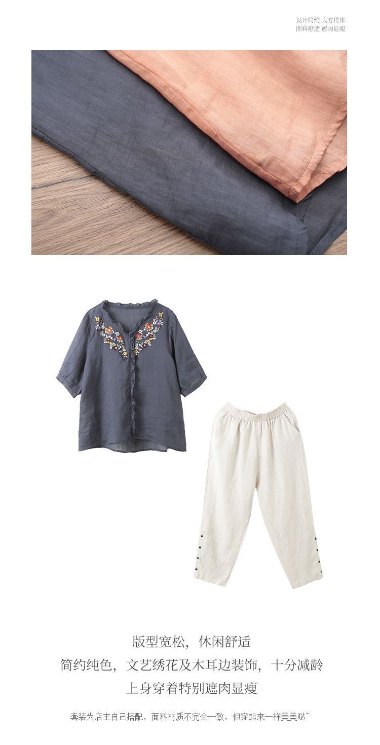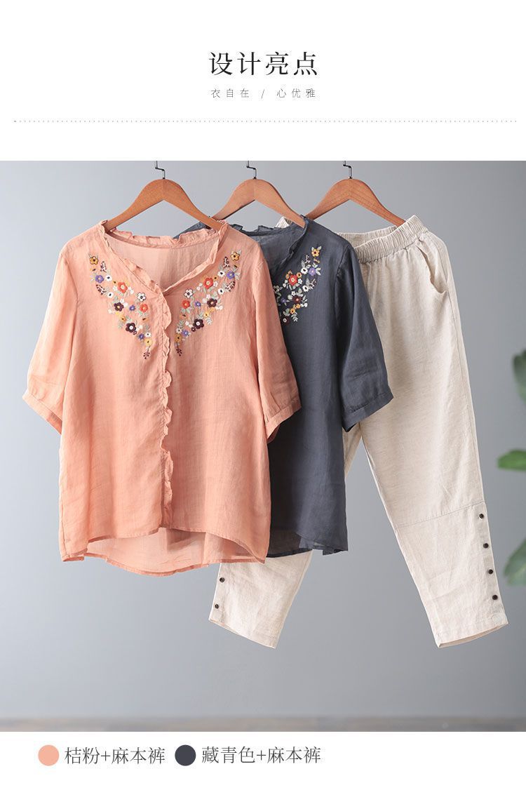 In the summer of 2025, the new Korean version of cotton and linen large-size meat-covering embroidered top + pants/two-piece suit for women