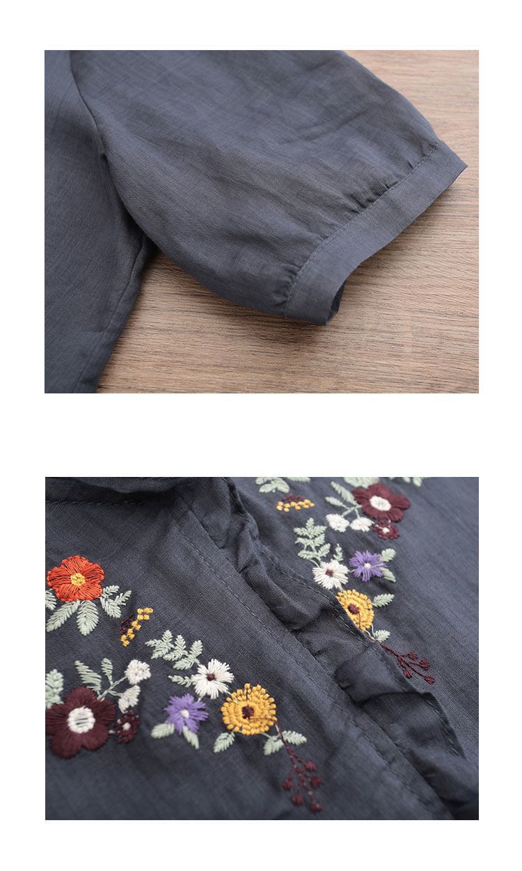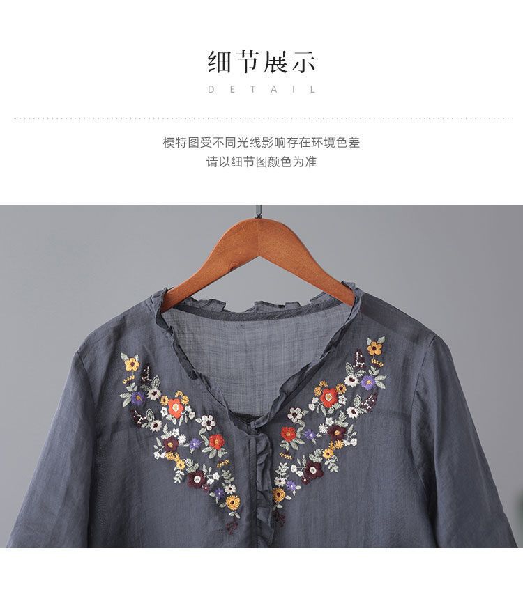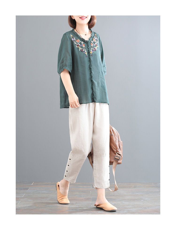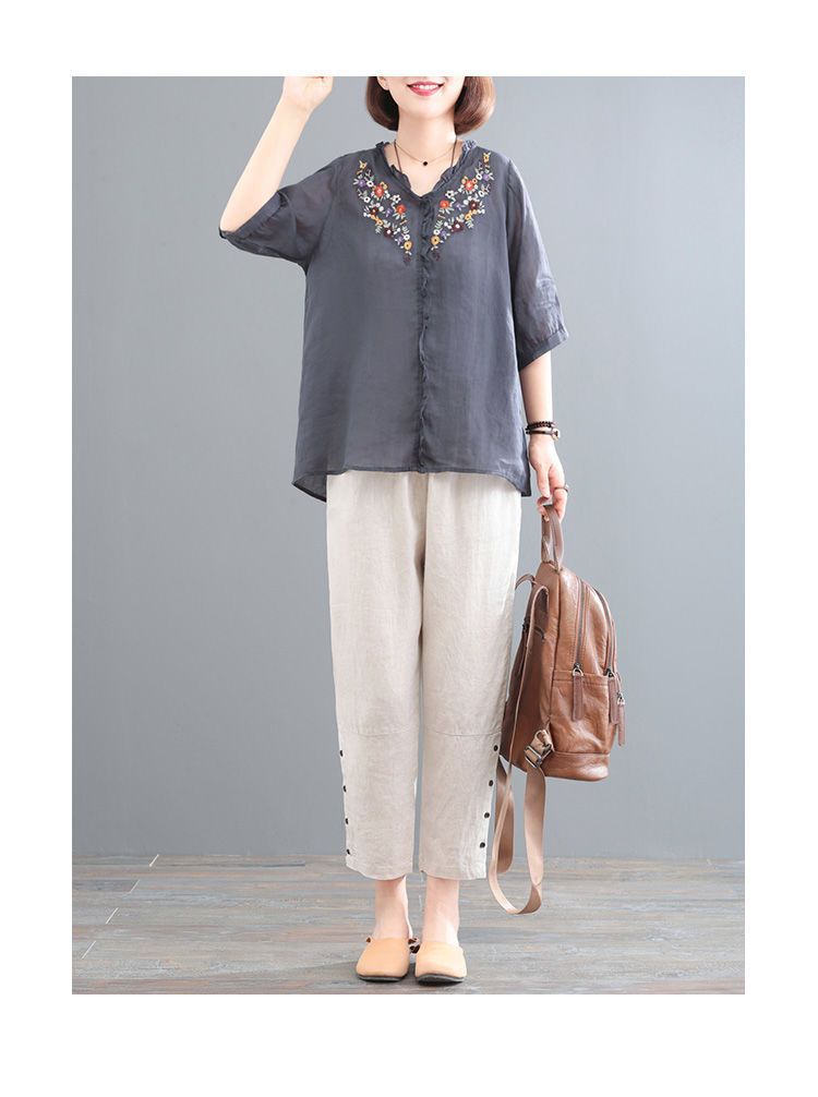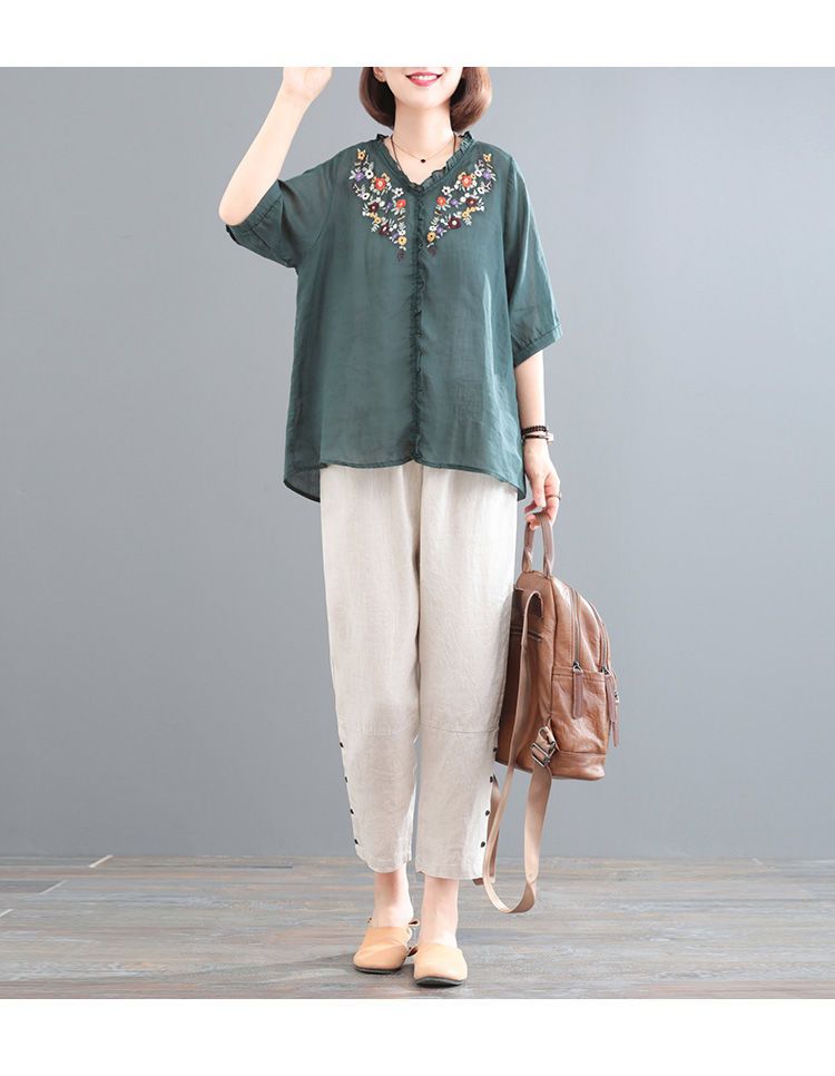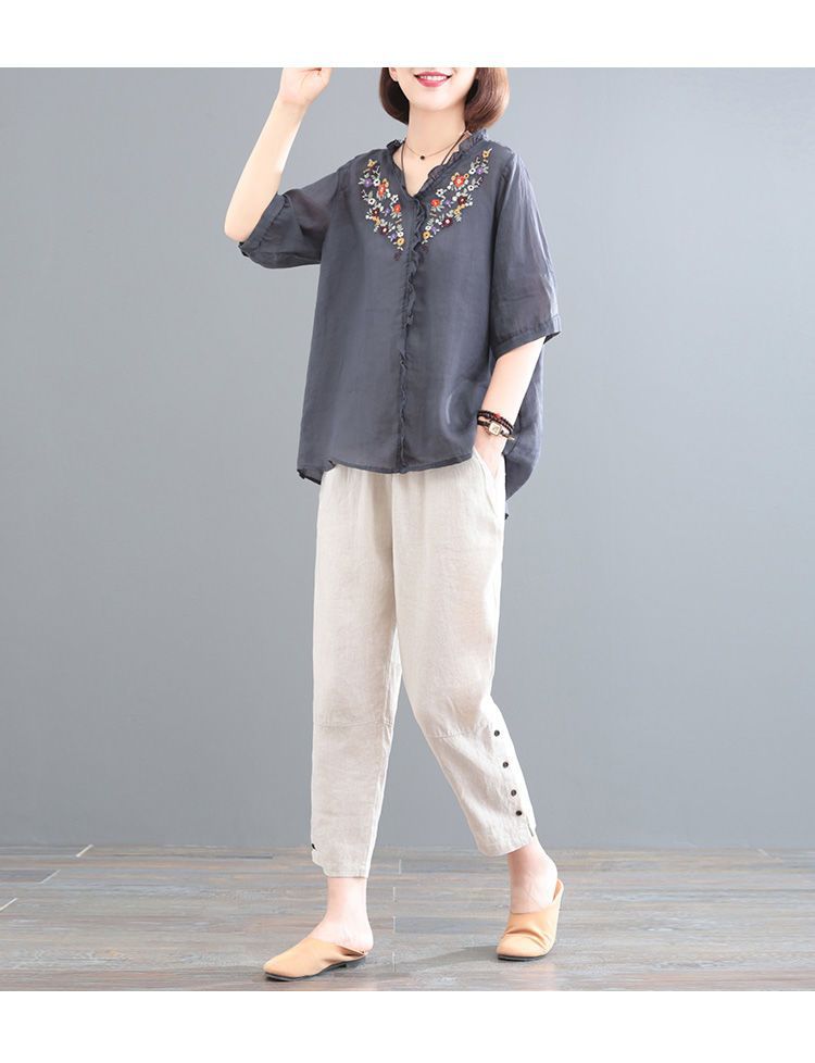 In the summer of 2025, the new Korean version of cotton and linen large-size meat-covering embroidered top + pants/two-piece suit for women