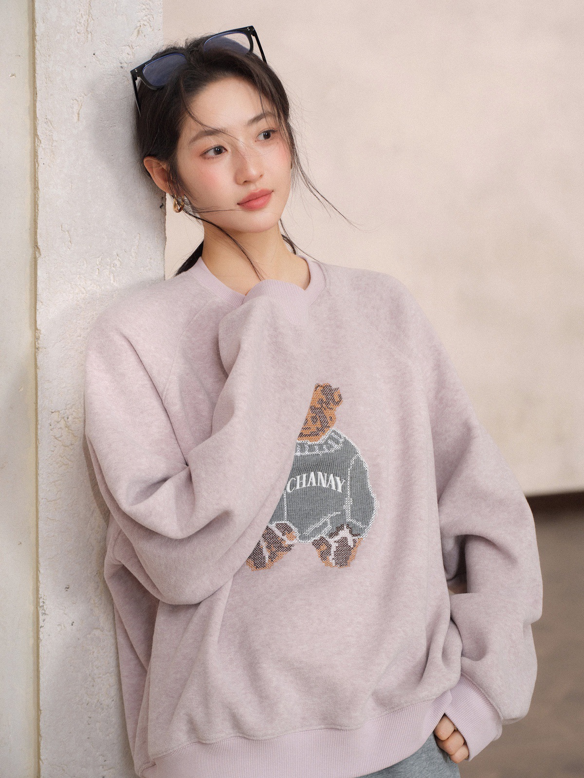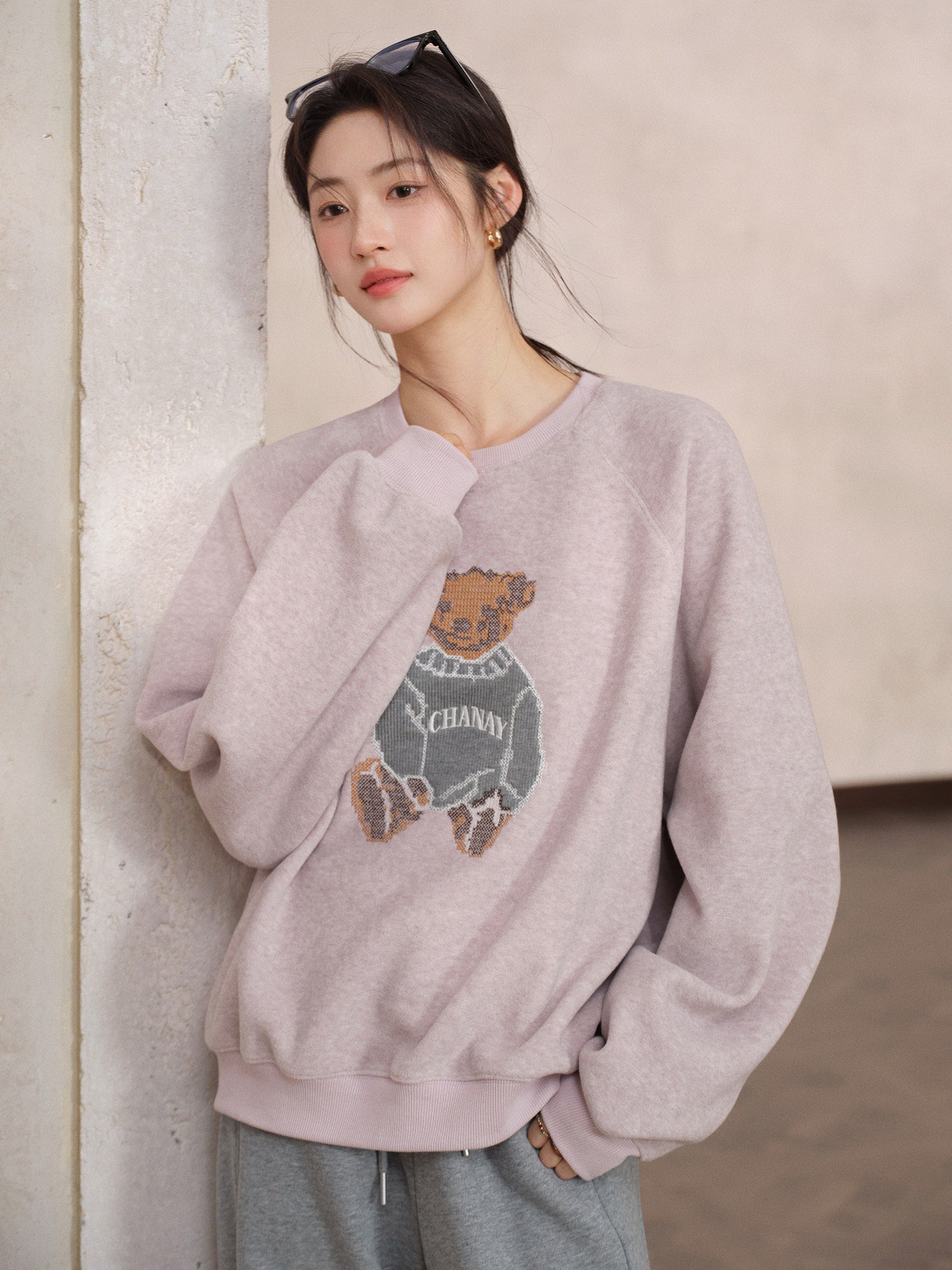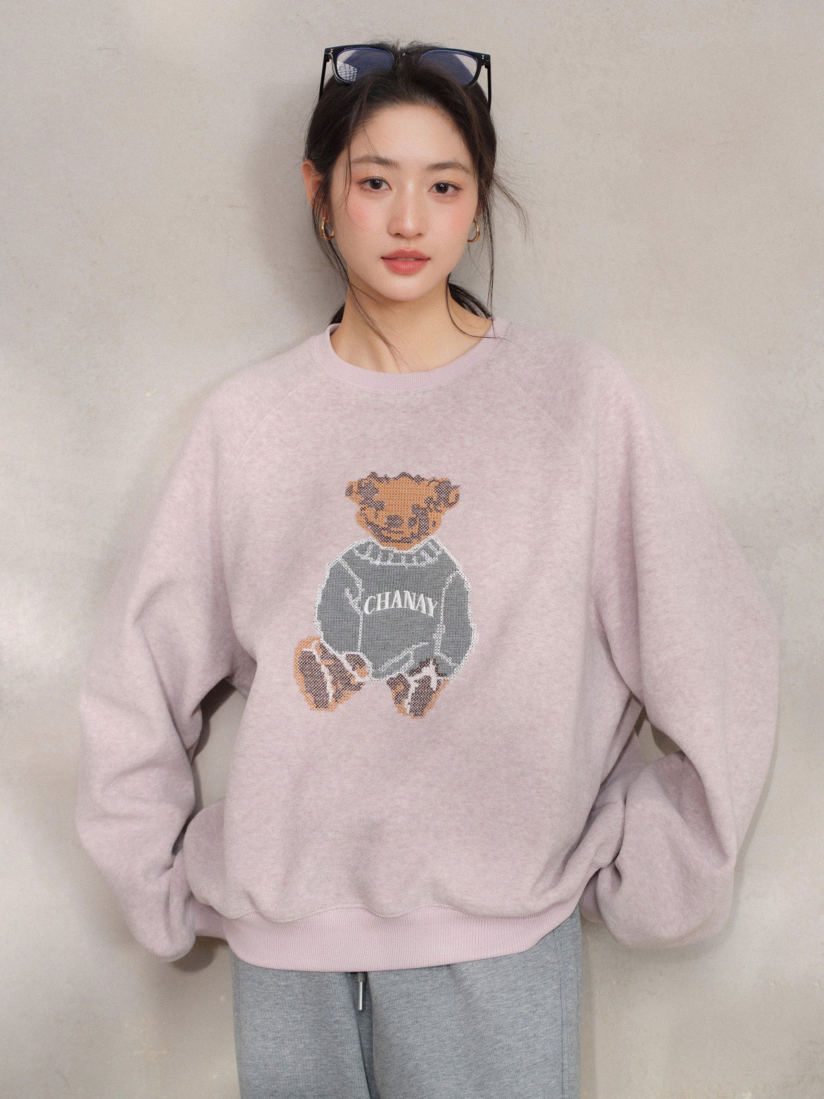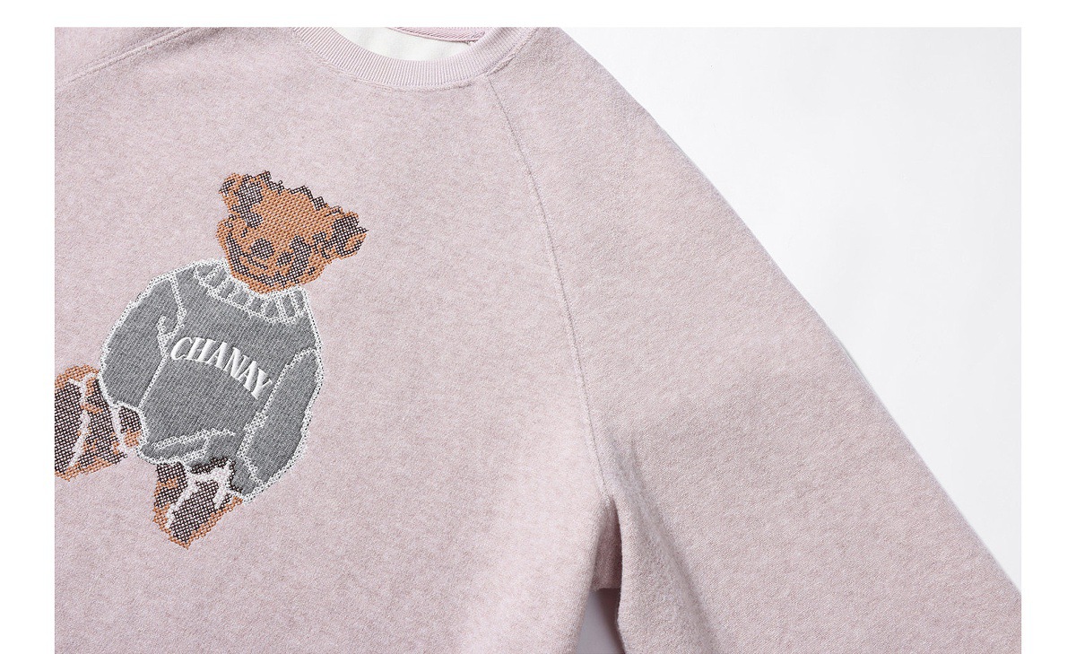JOMI STUDIO Gentle Cream Purple, Cross Stitch Bear Crew Neck Sleeve Embroidered Sweater Women's Spring Top