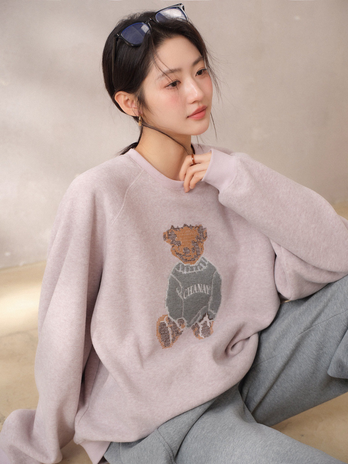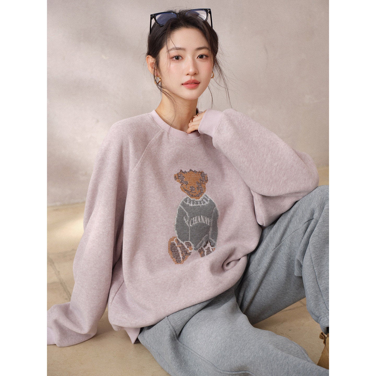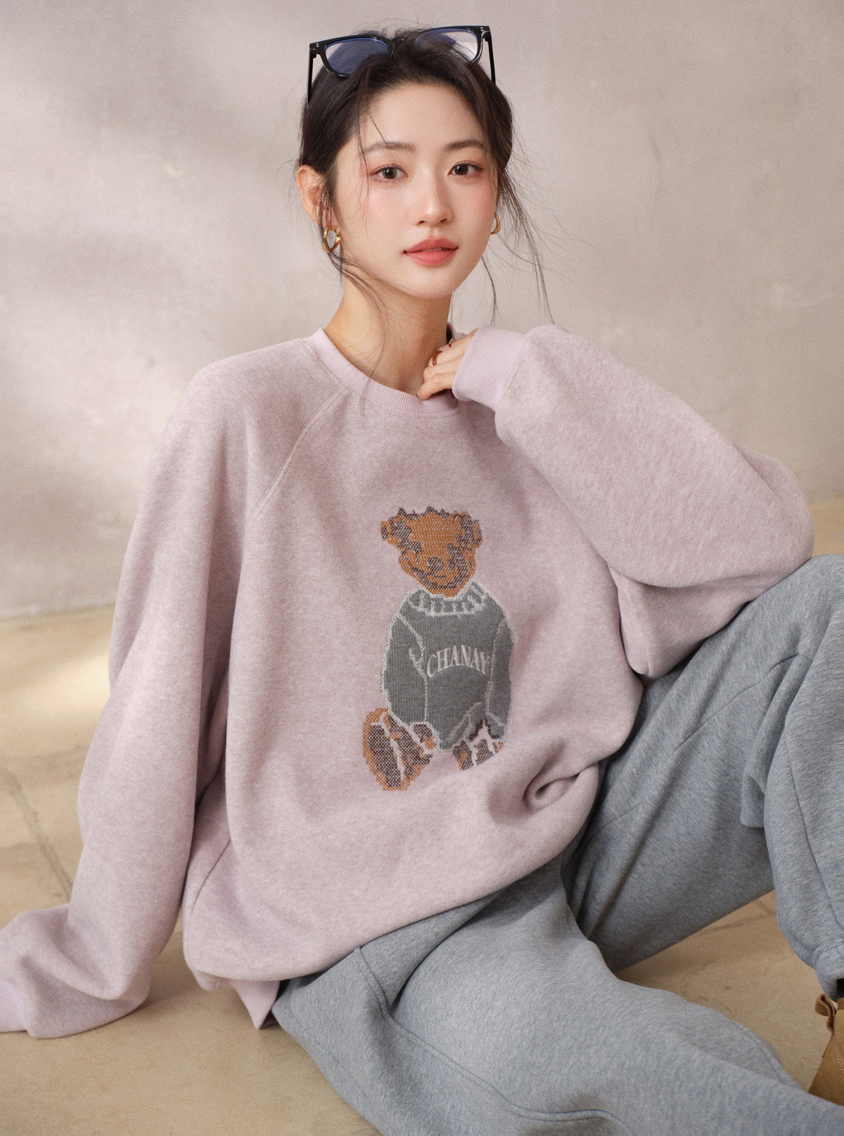 JOMI STUDIO Gentle Cream Purple, Cross Stitch Bear Crew Neck Sleeve Embroidered Sweater Women's Spring Top