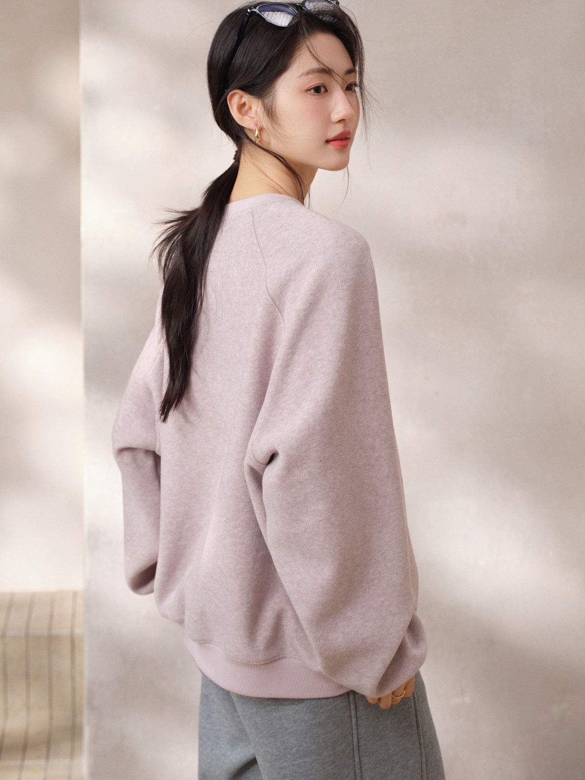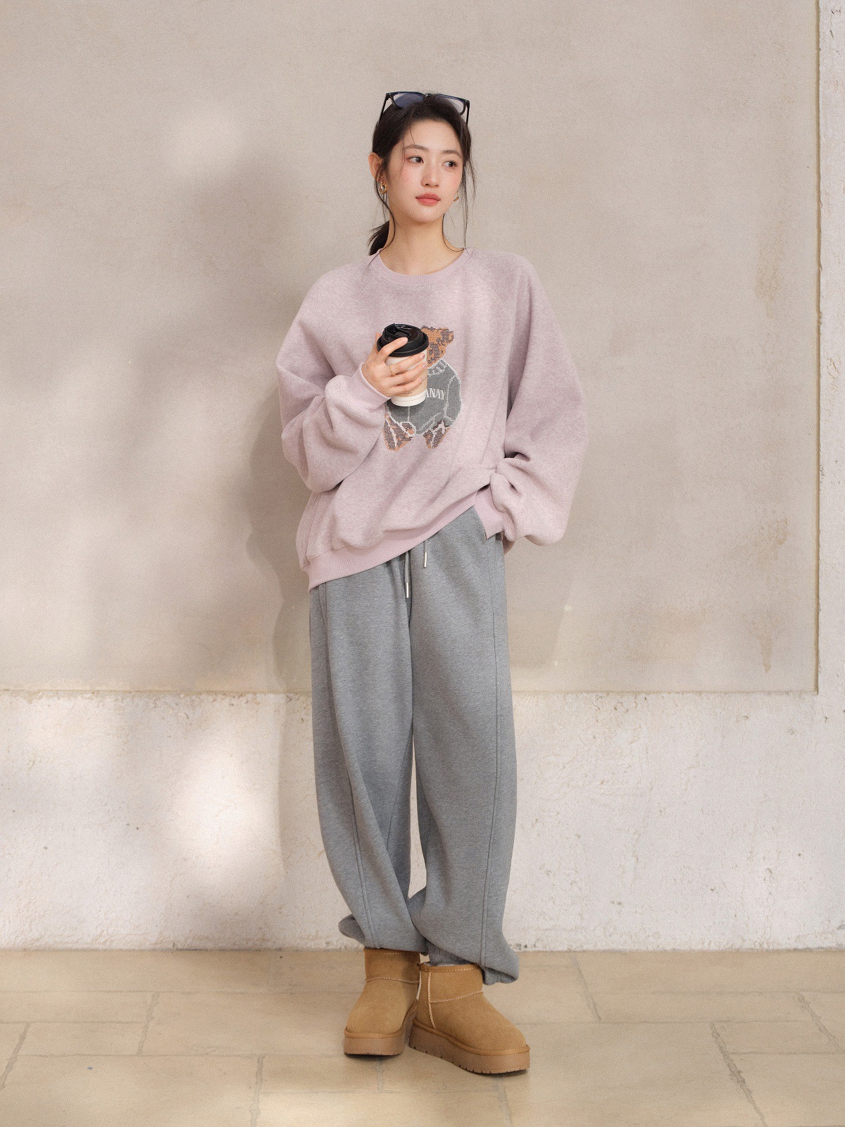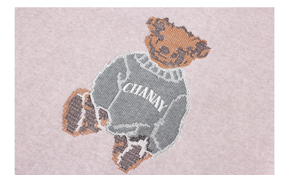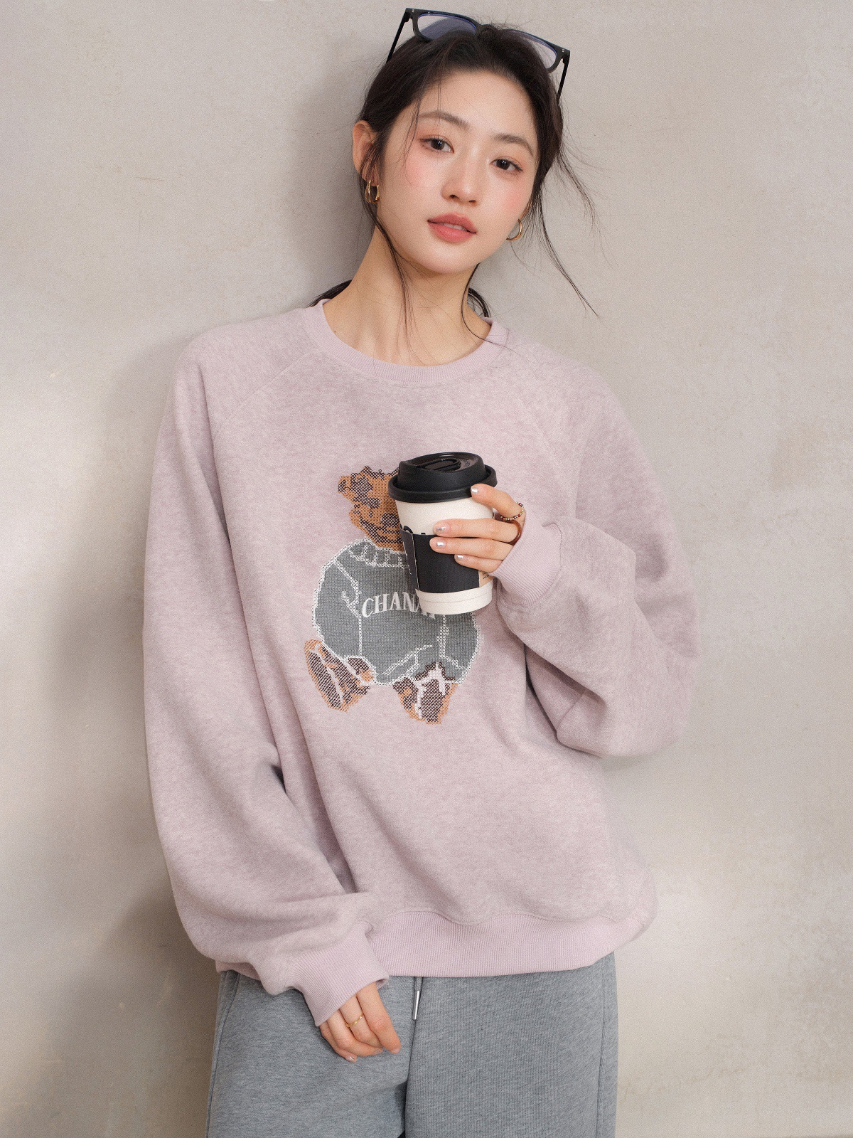 JOMI STUDIO Gentle Cream Purple, Cross Stitch Bear Crew Neck Sleeve Embroidered Sweater Women's Spring Top