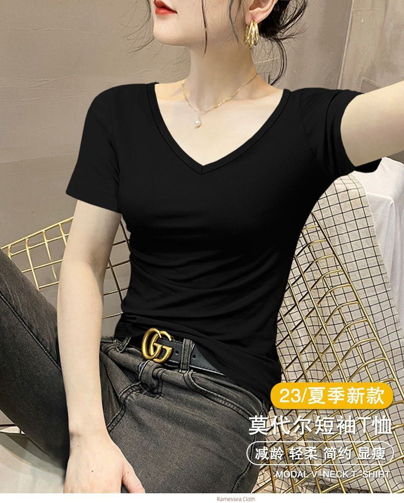 Knitted Threaded Modal Short Sleeve V-Neck Summer Slim Skinny Top Thin New Chicken Heart Neck Half Sleeve T-Shirt