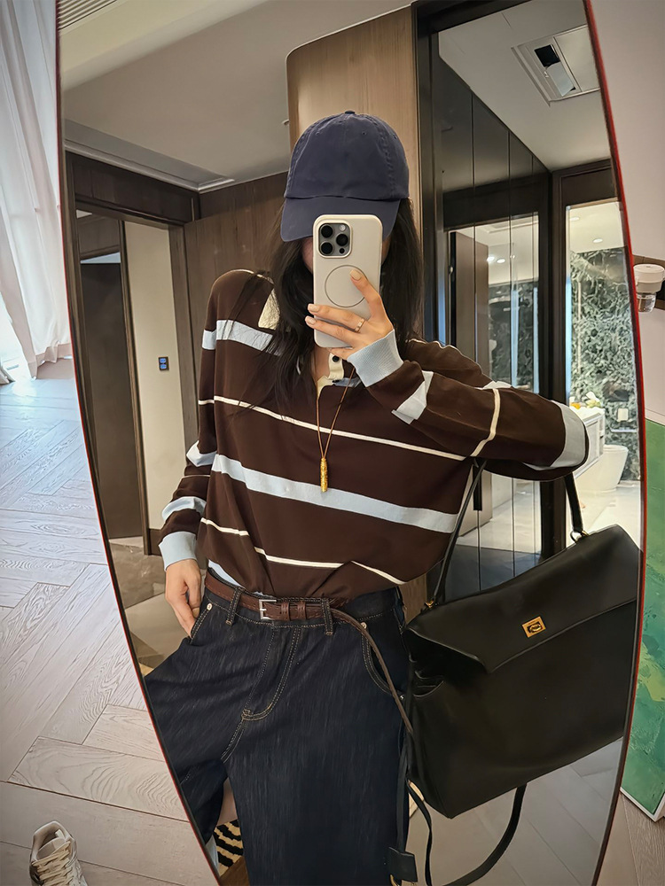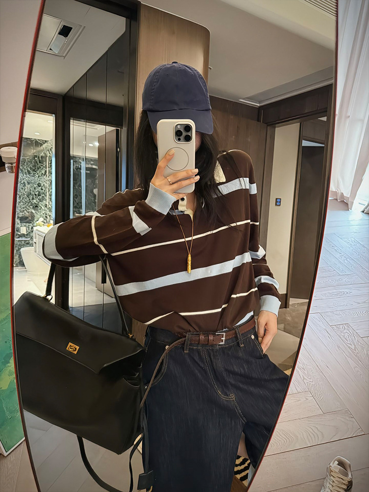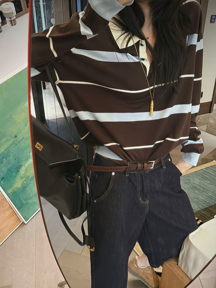 Korean contrasting striped polo collar lapel single top women's autumn unique and beautiful small fragrant style long-sleeved knitted sweater