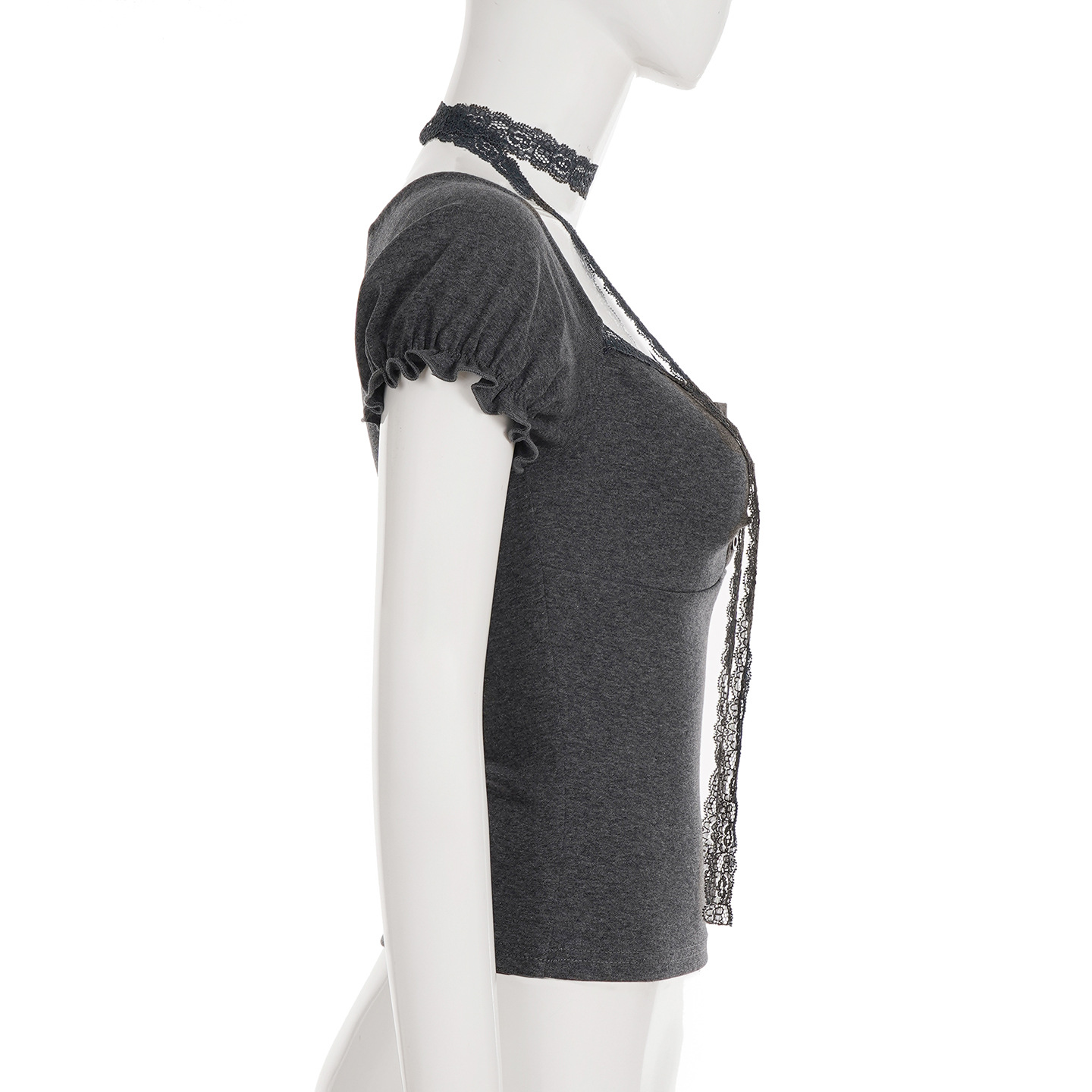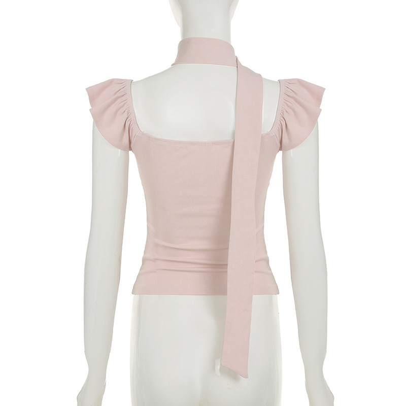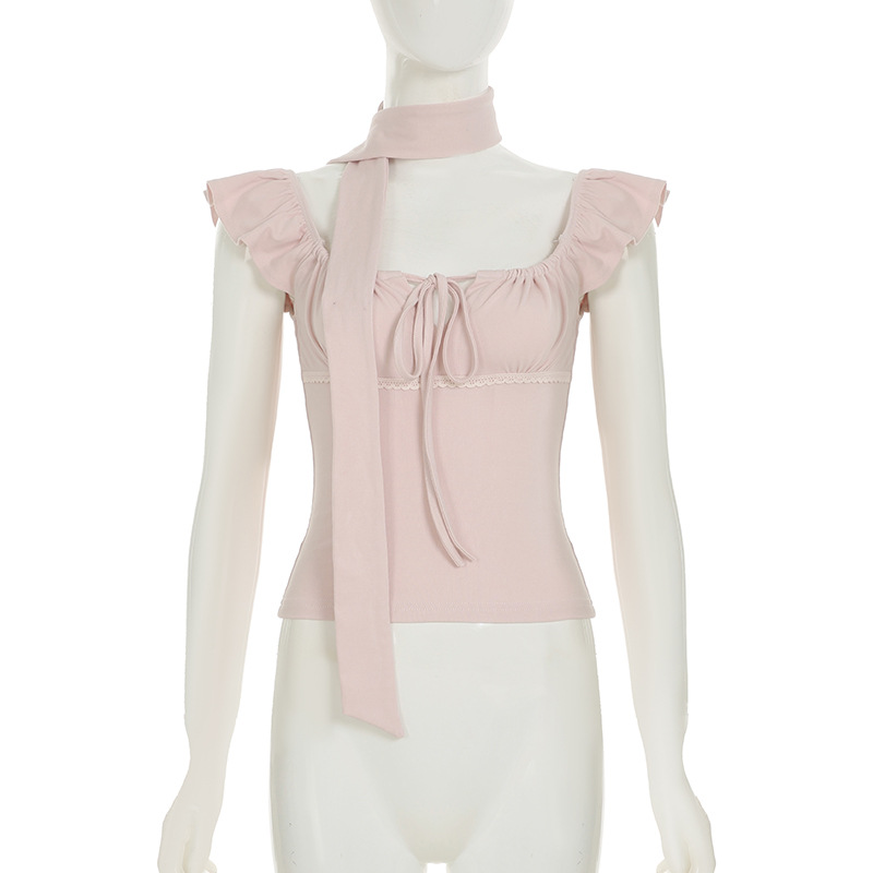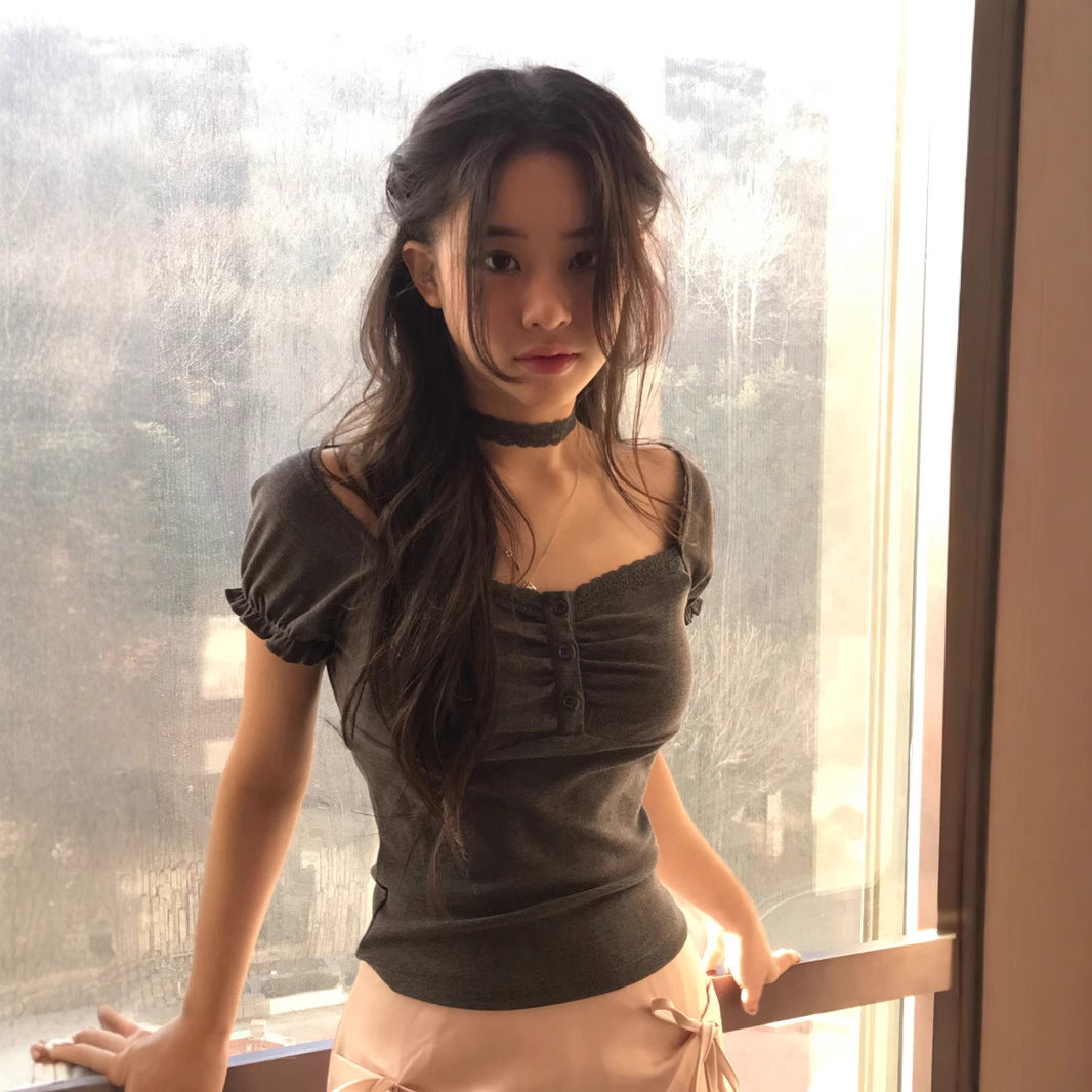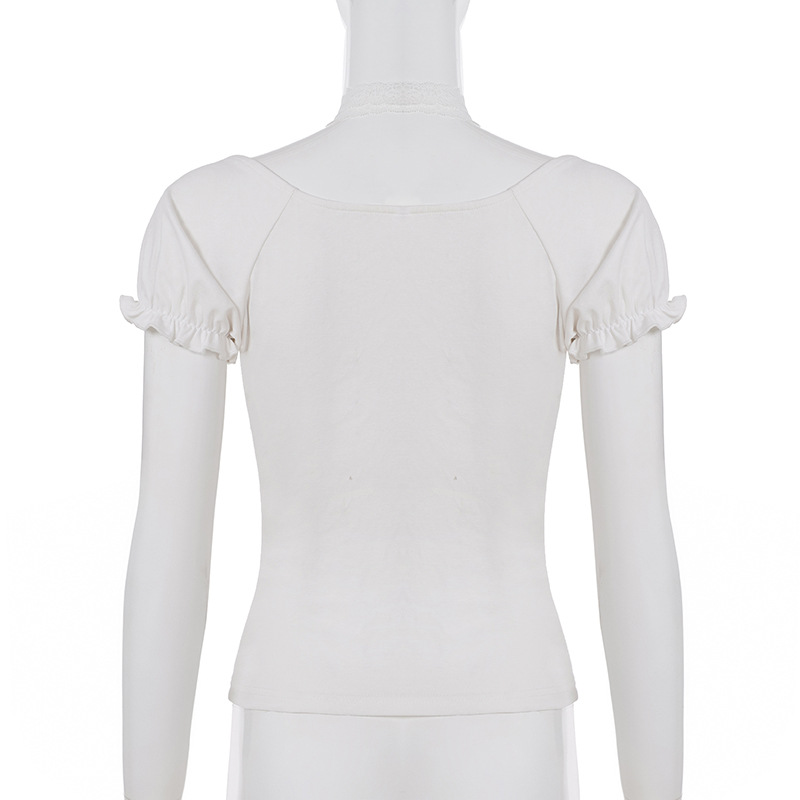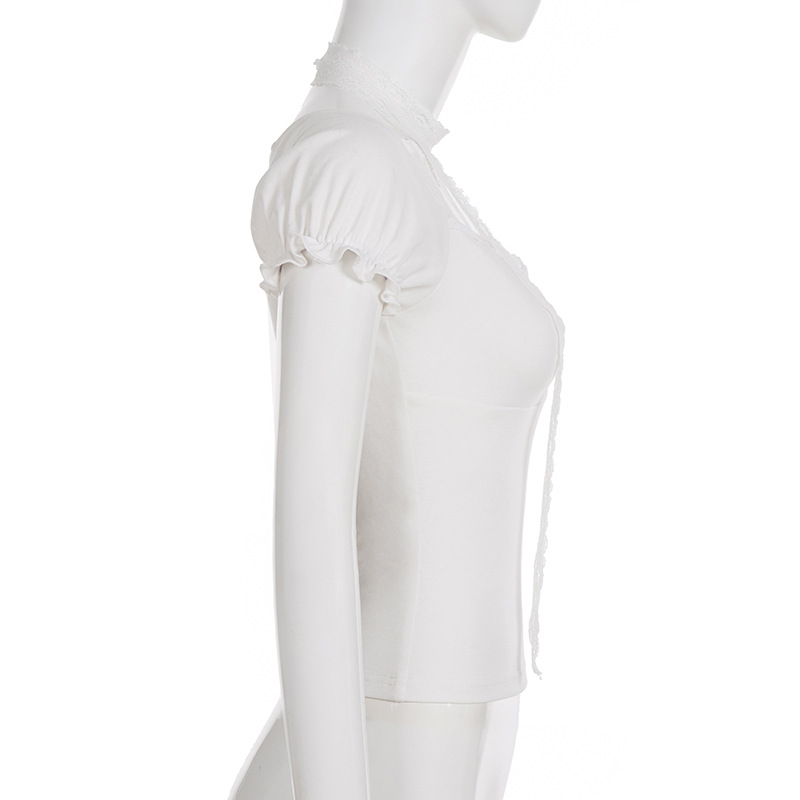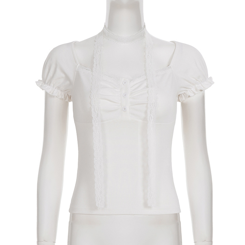 Korean pure desire girl age reduction irregular lace splicing short-sleeved T-shirt scarf design bubble sleeve slim top