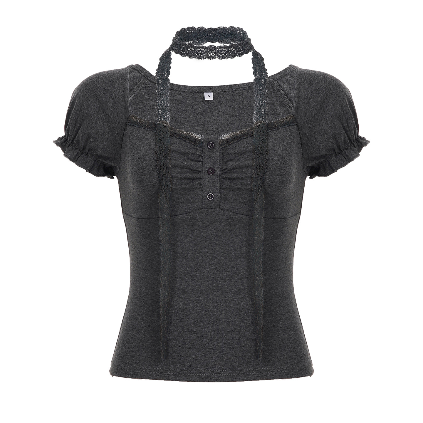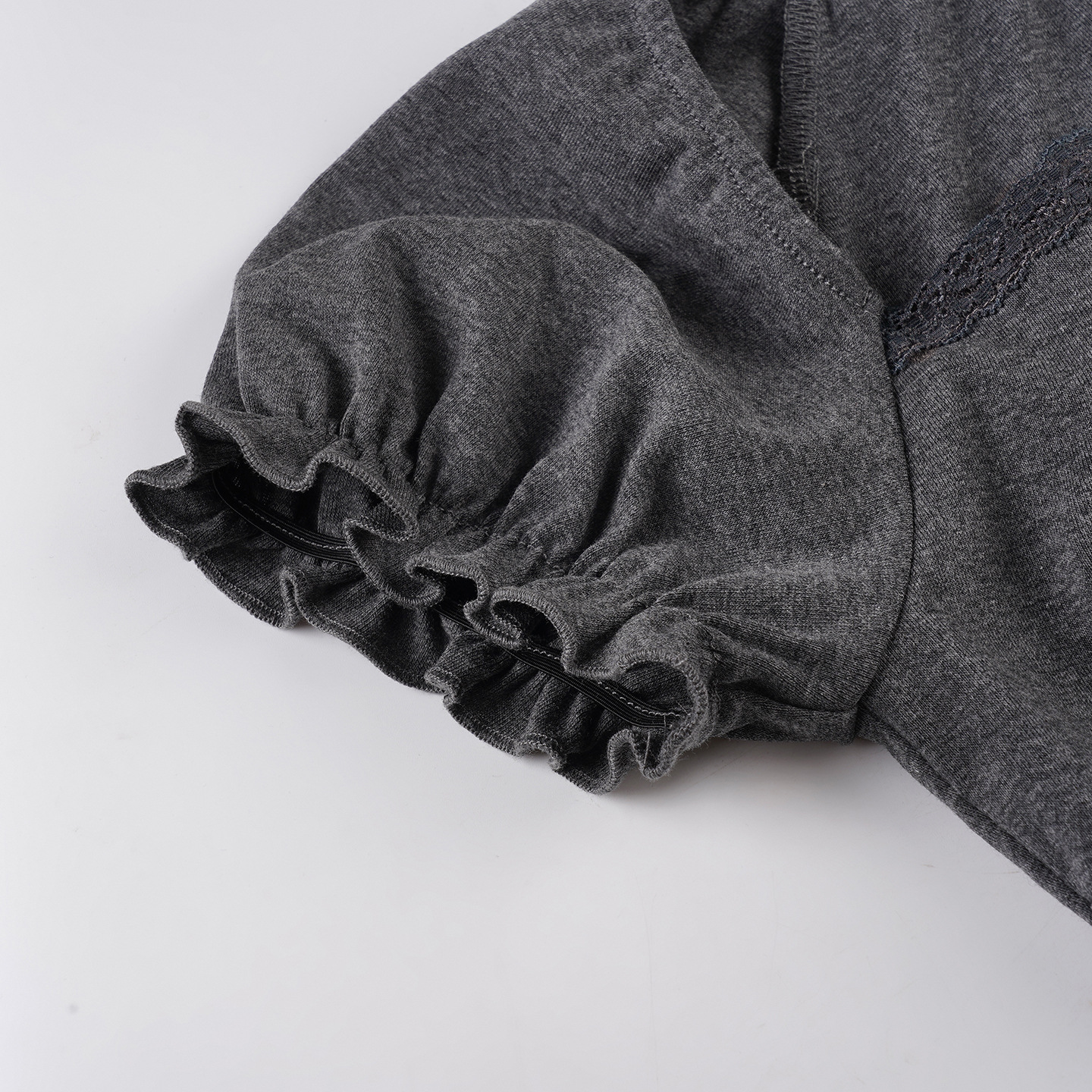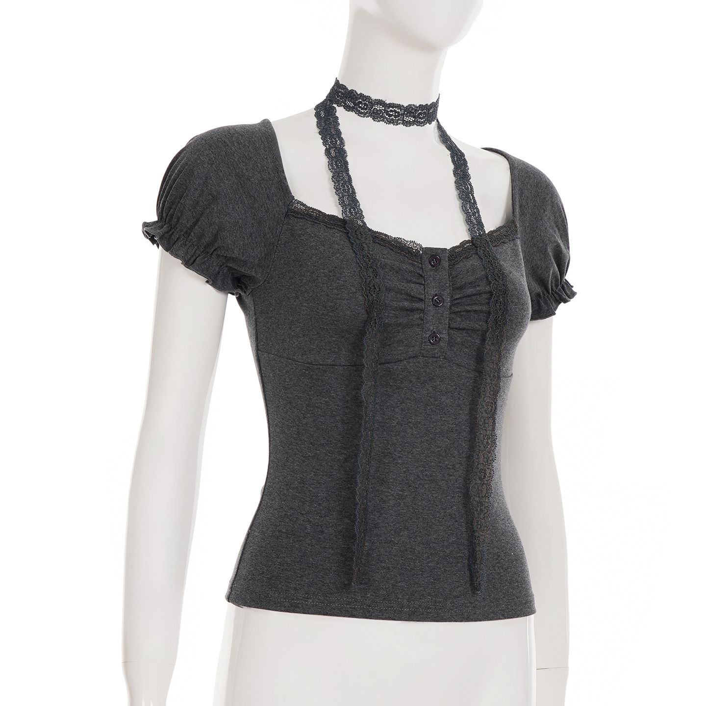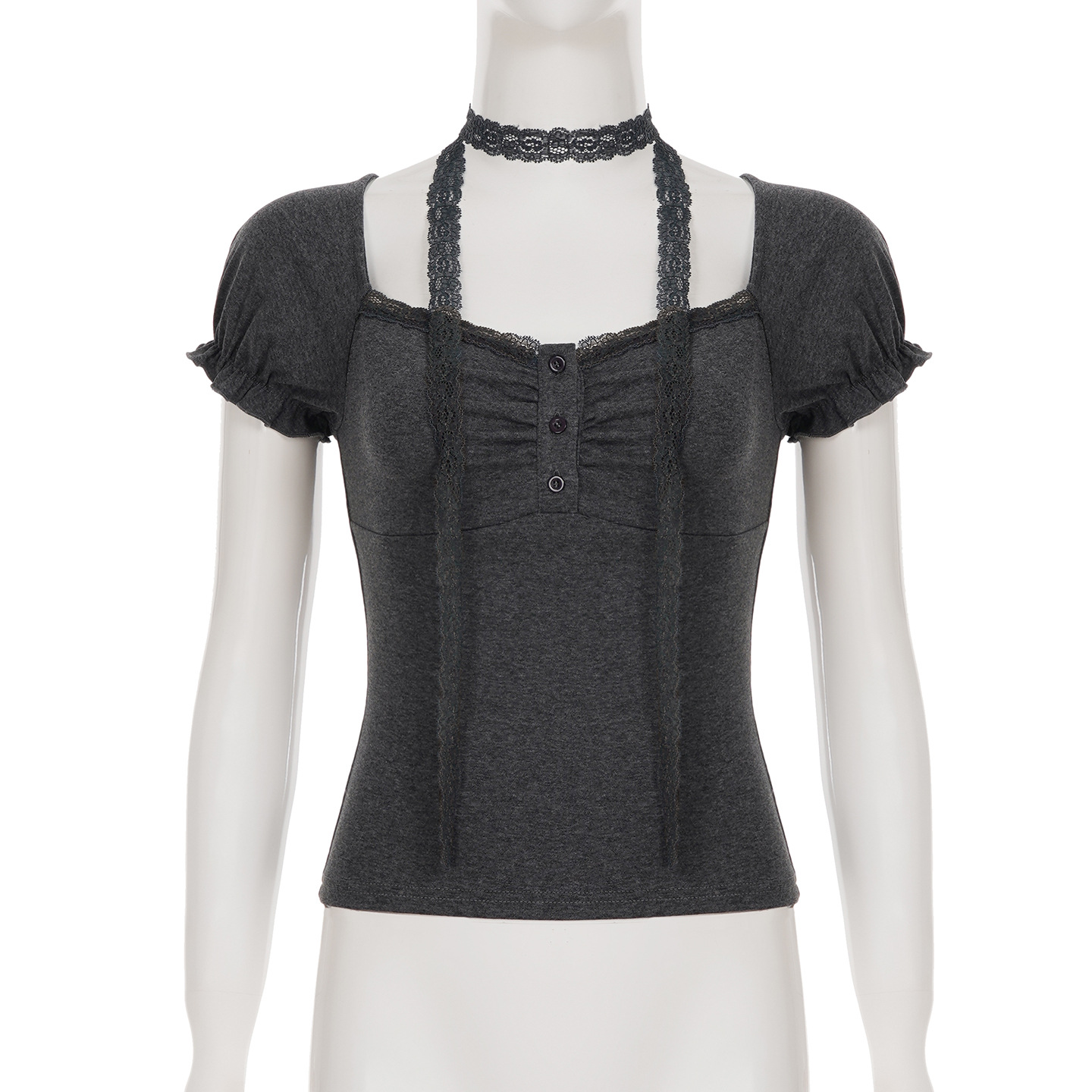Korean pure desire girl age reduction irregular lace splicing short-sleeved T-shirt scarf design bubble sleeve slim top