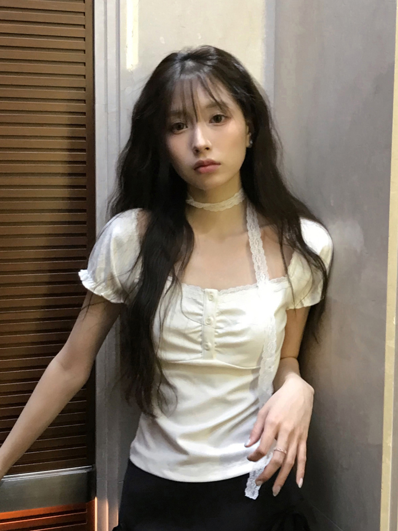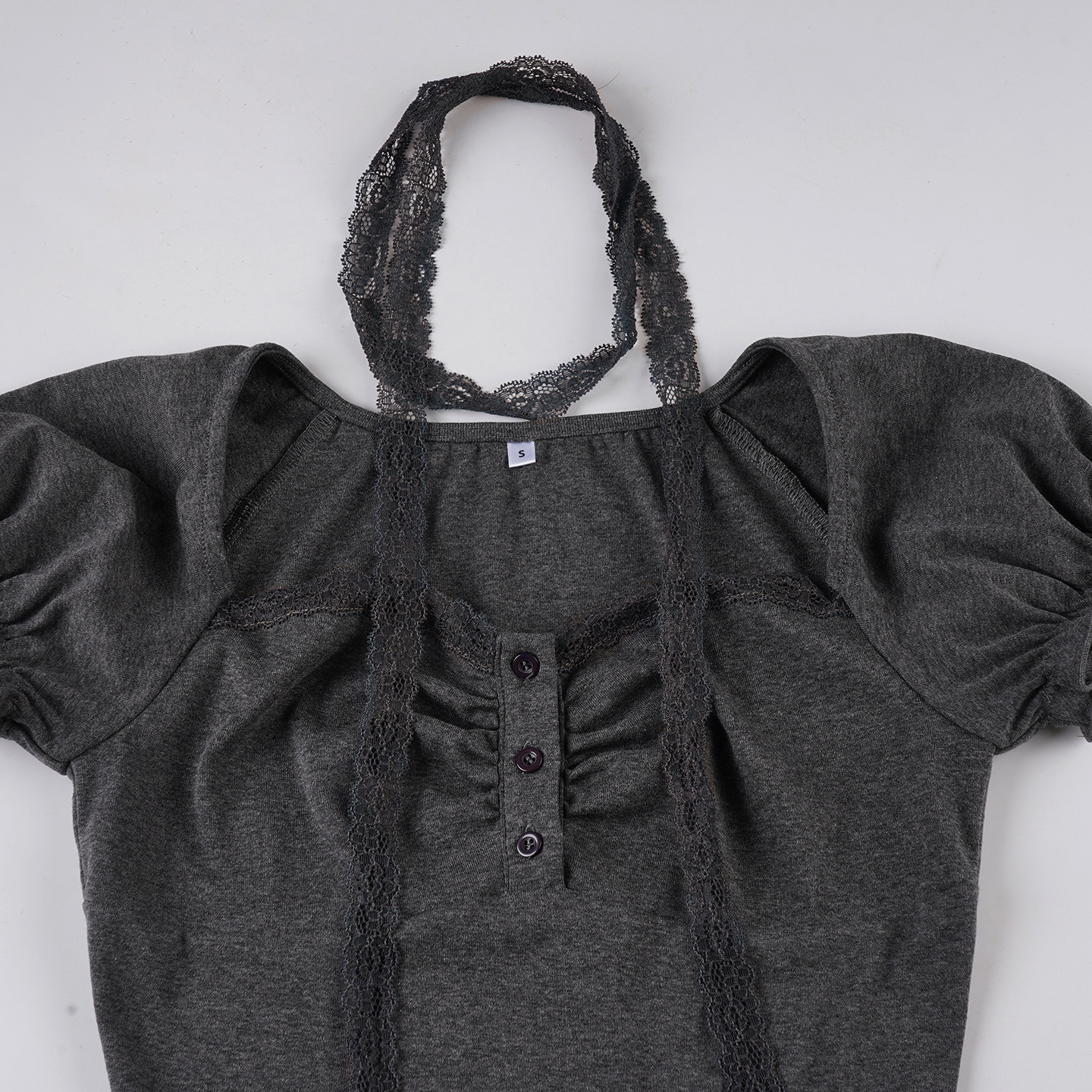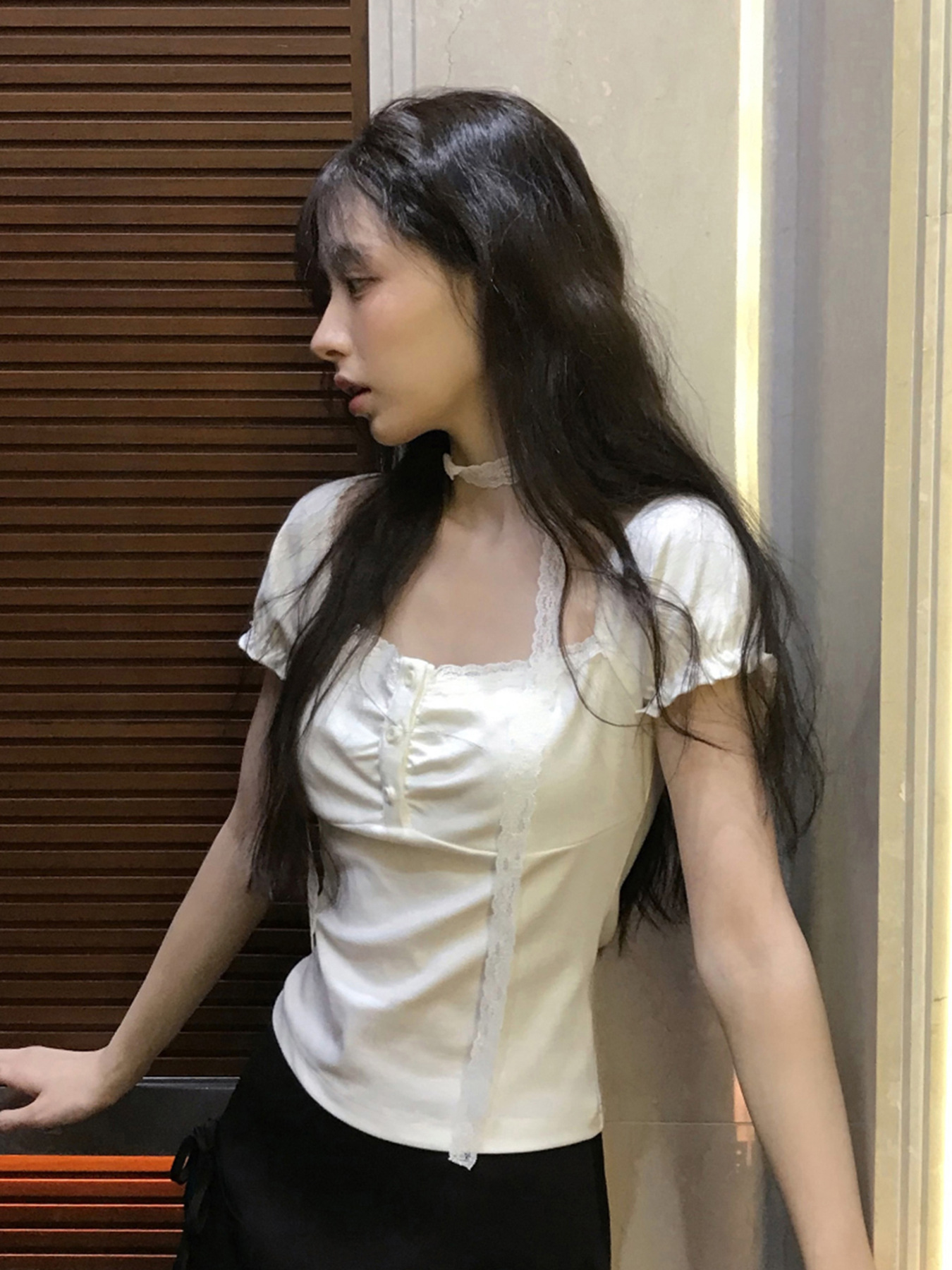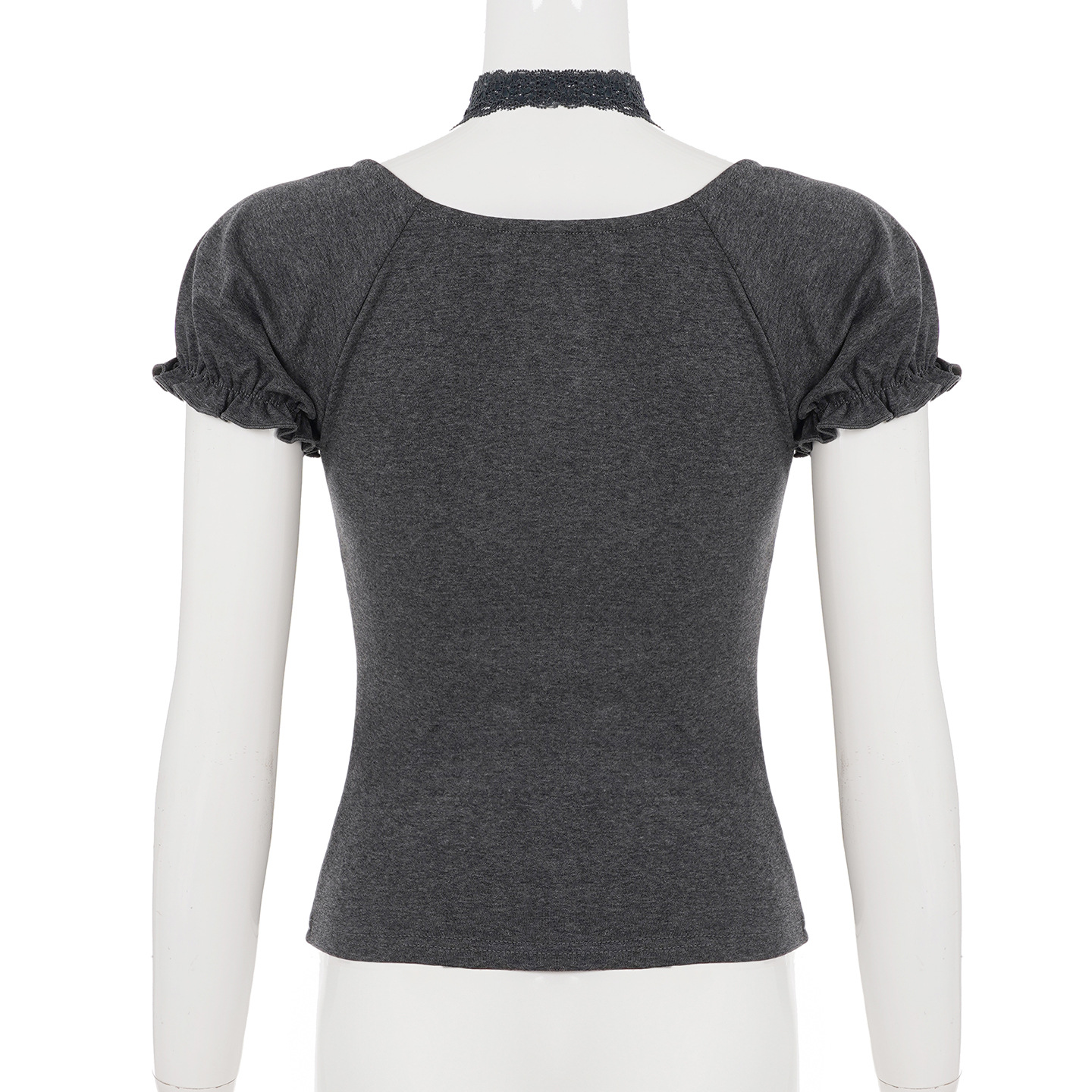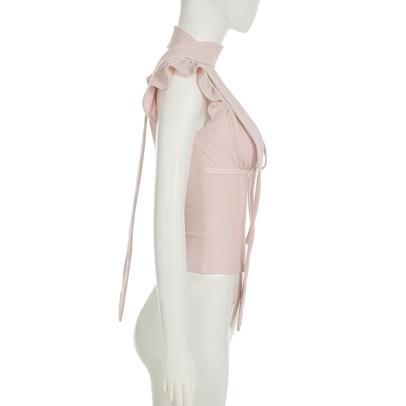 Korean pure desire girl age reduction irregular lace splicing short-sleeved T-shirt scarf design bubble sleeve slim top