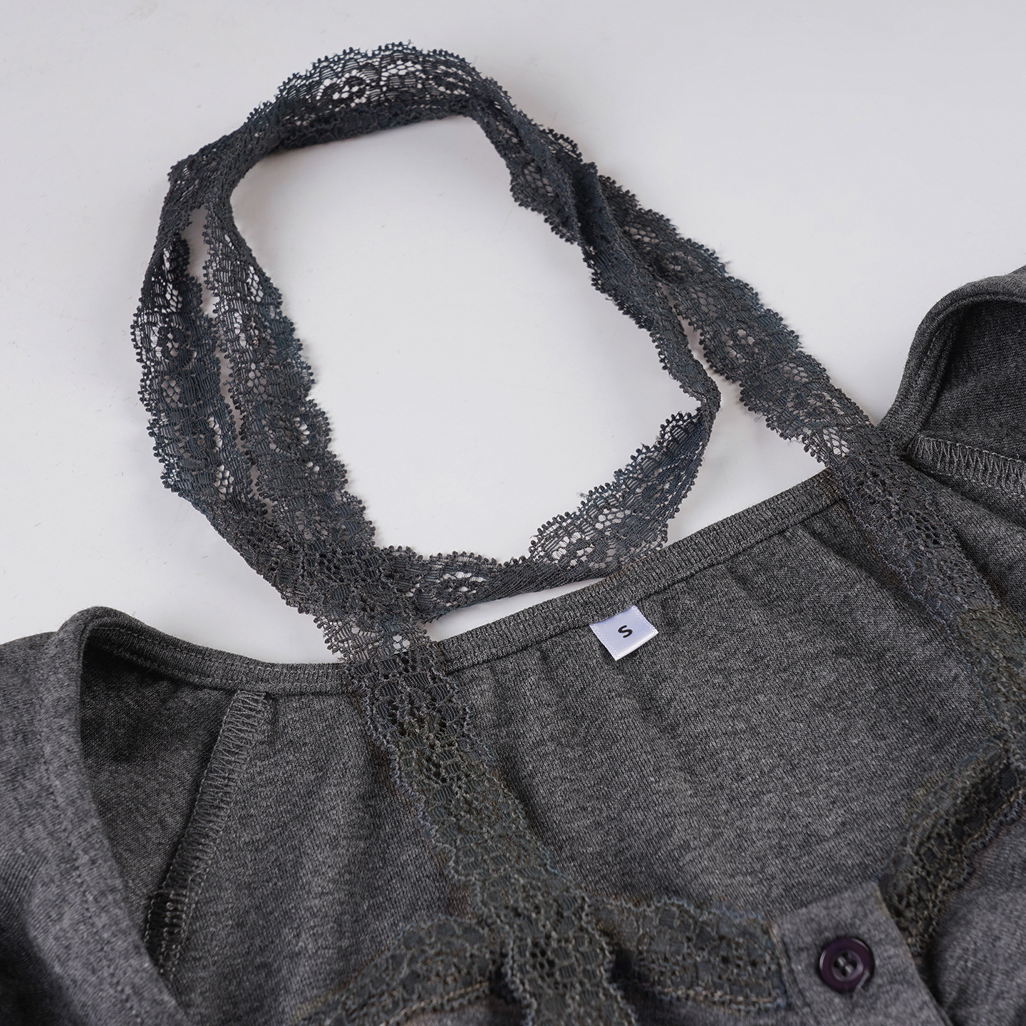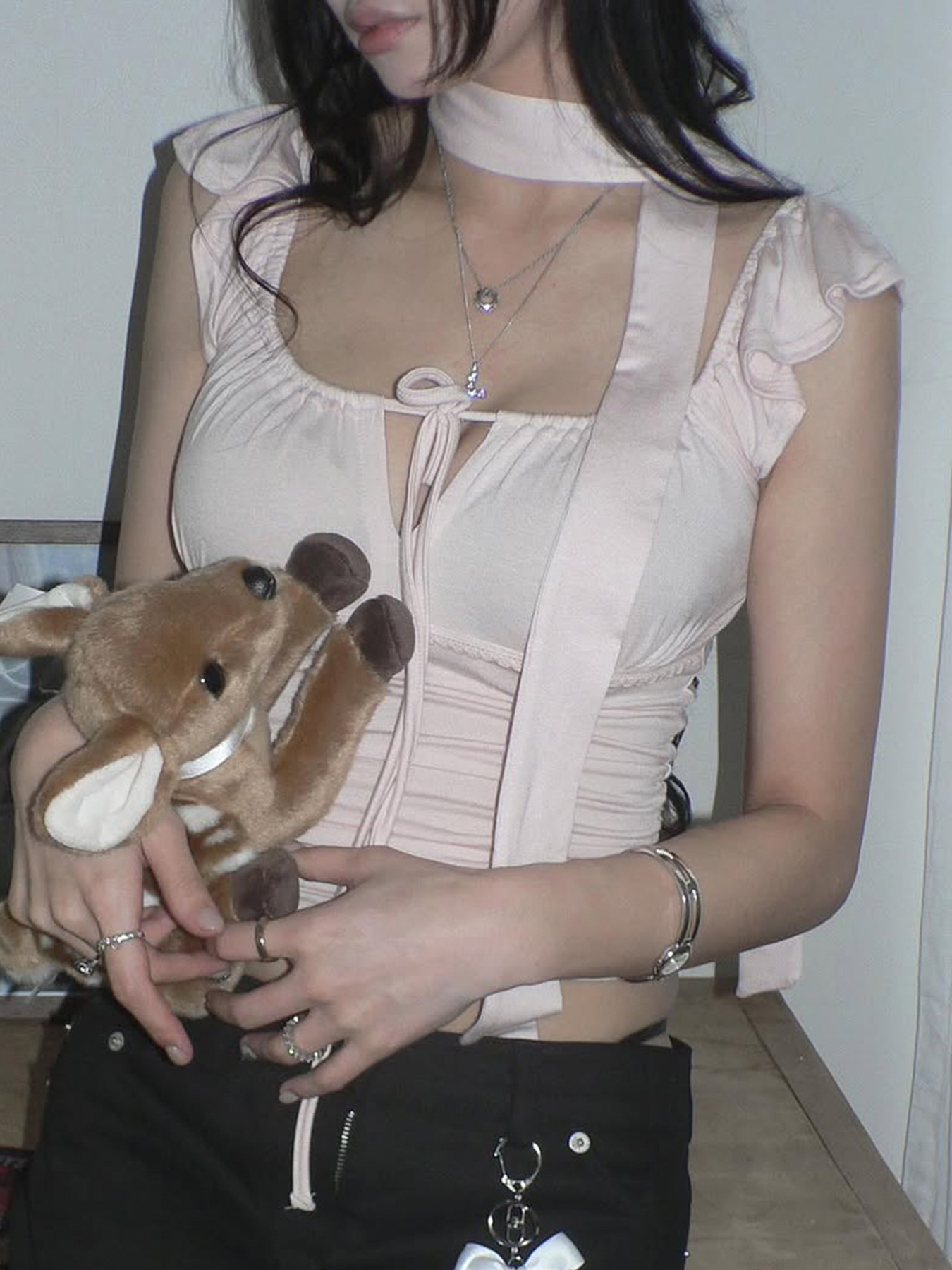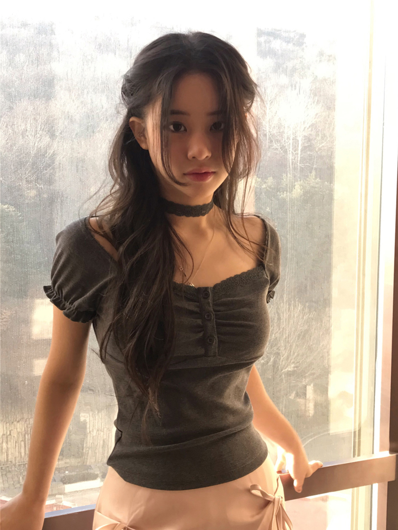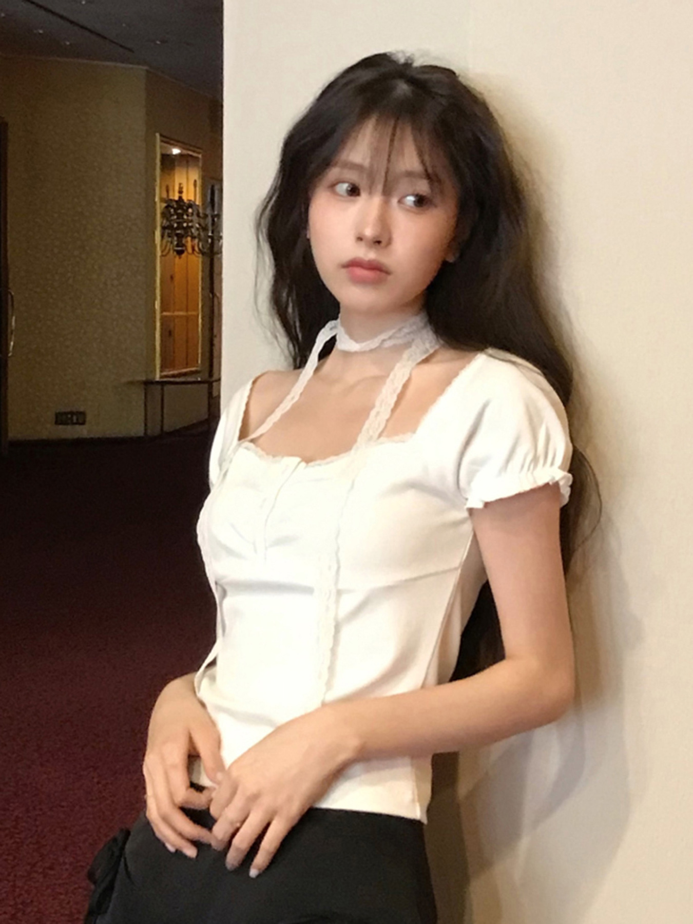 Korean pure desire girl age reduction irregular lace splicing short-sleeved T-shirt scarf design bubble sleeve slim top