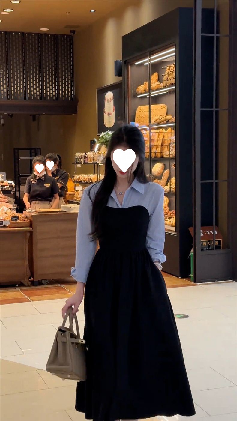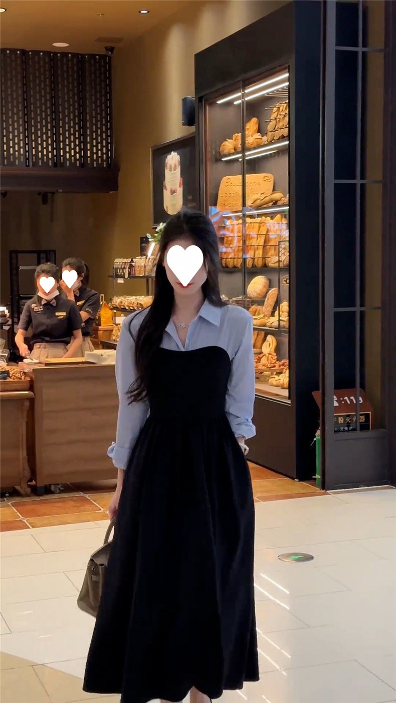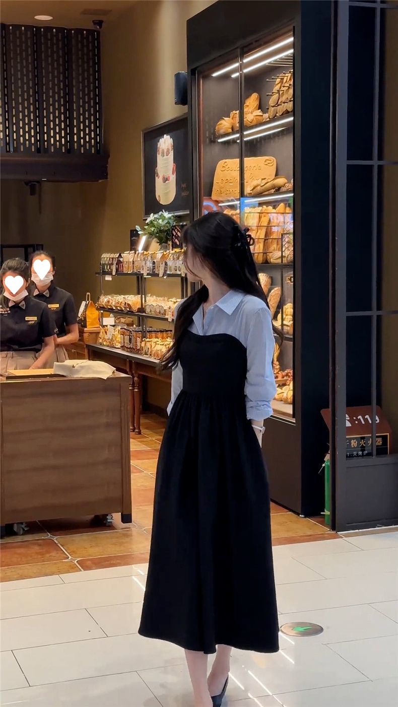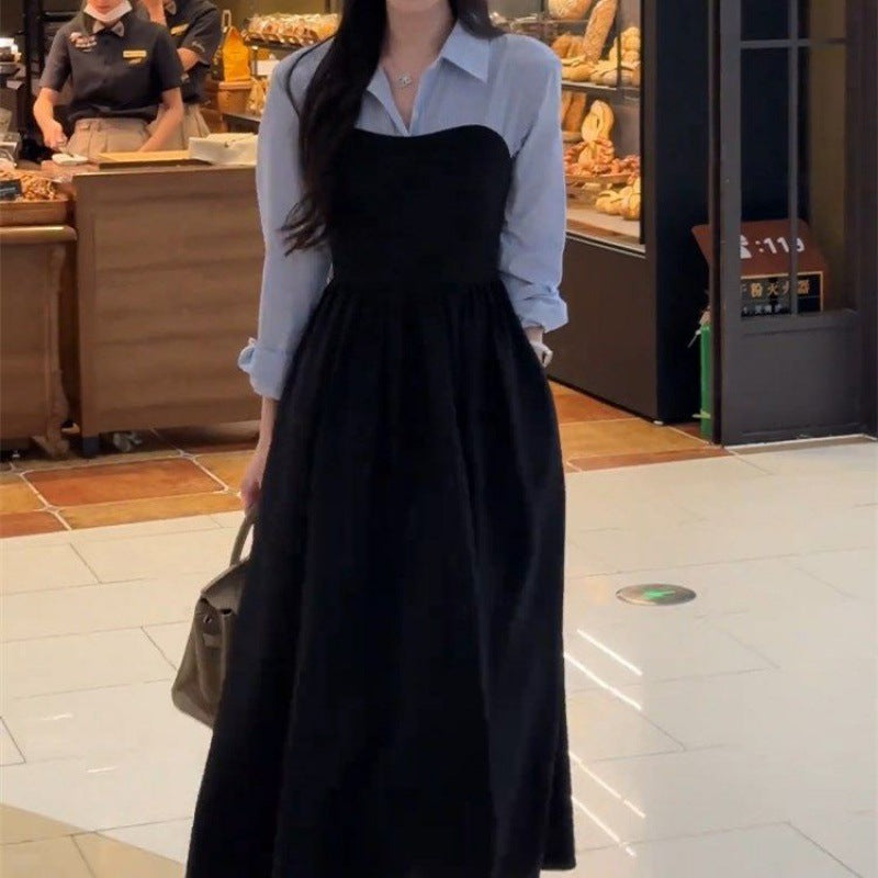 Large size early autumn new women's clothing fake two-piece shirt black long-sleeved dress, high-end matching, a complete set
