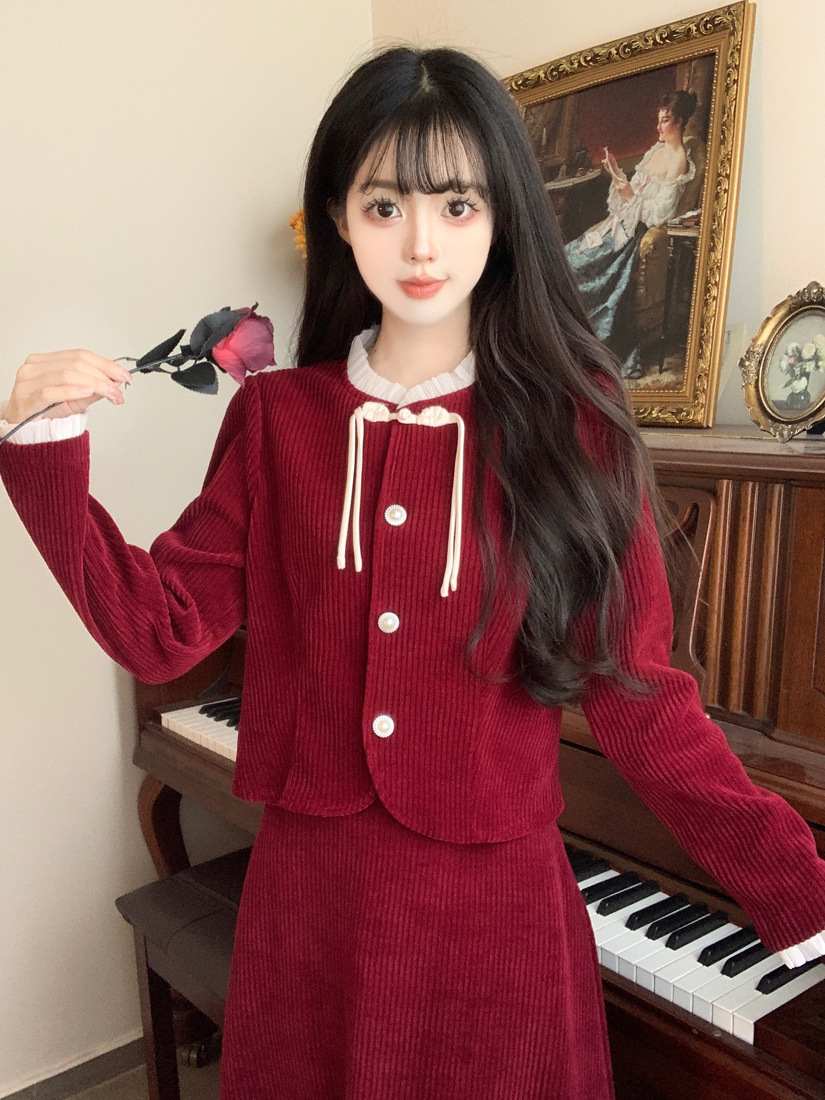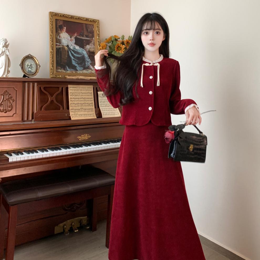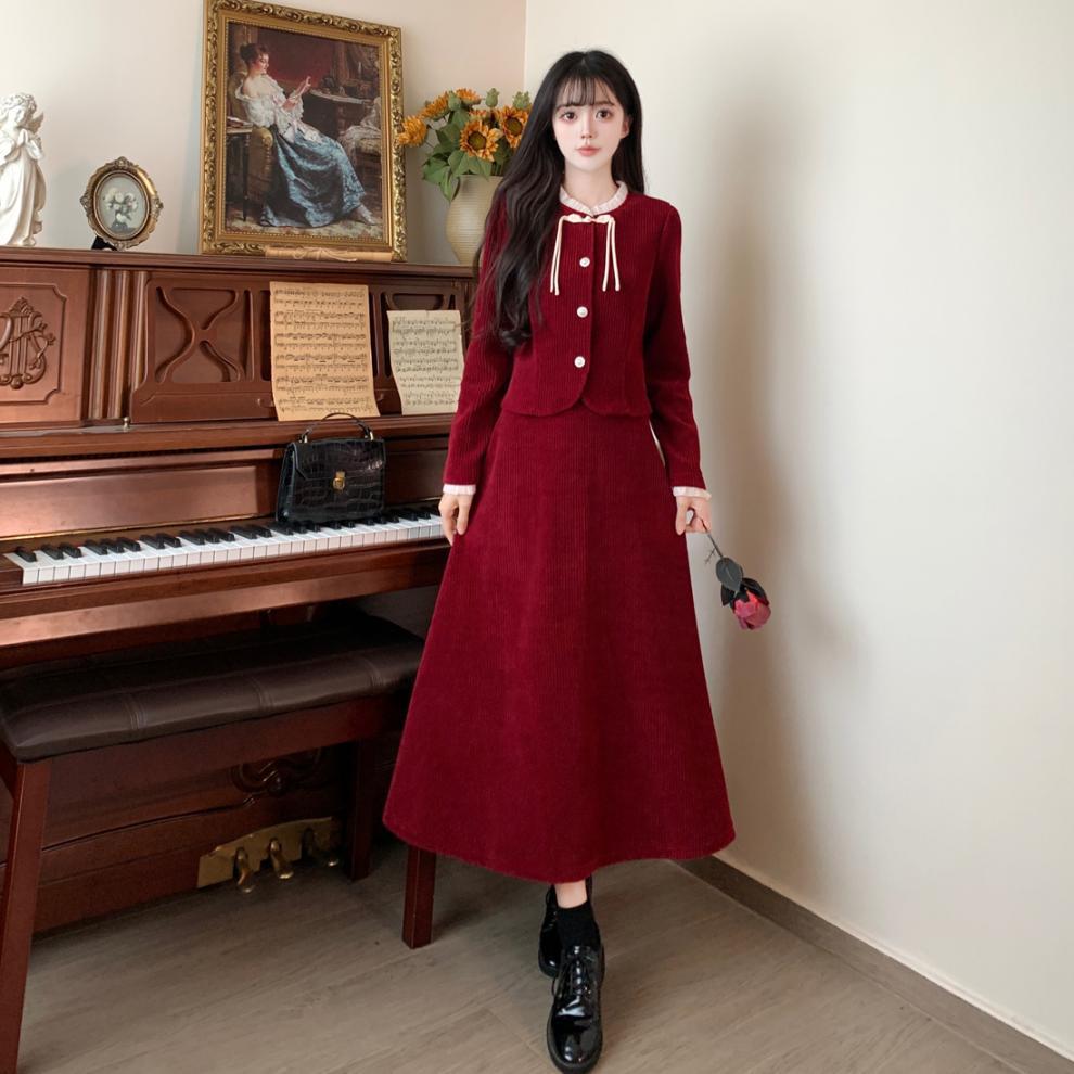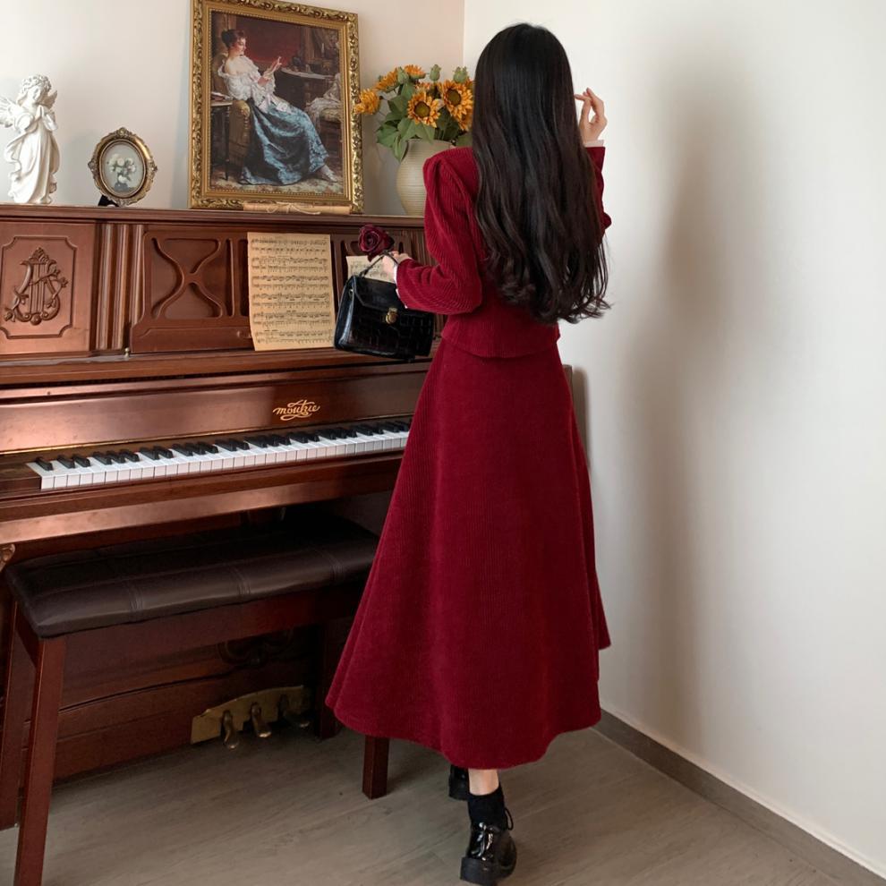 Large size French small fragrant style red corduroy fashion suit skirt women's autumn and winter temperament thin skirt two-piece set