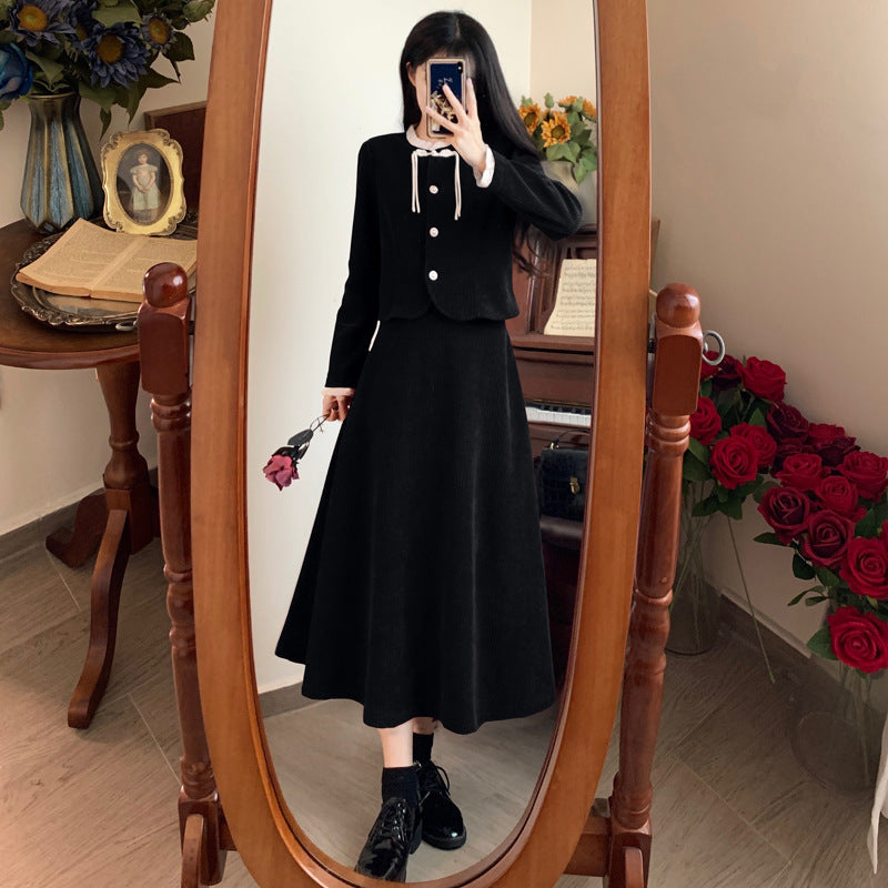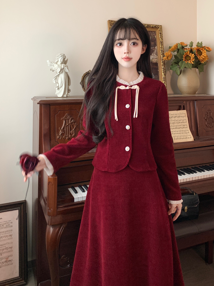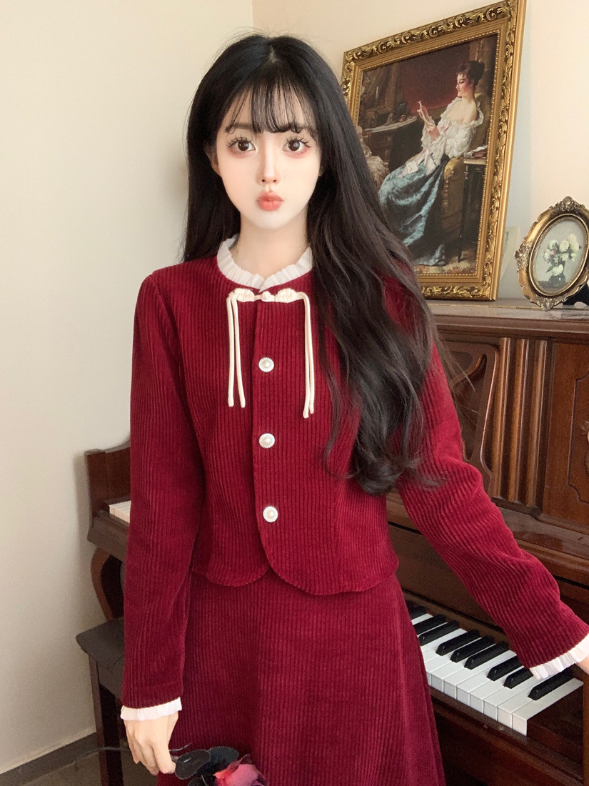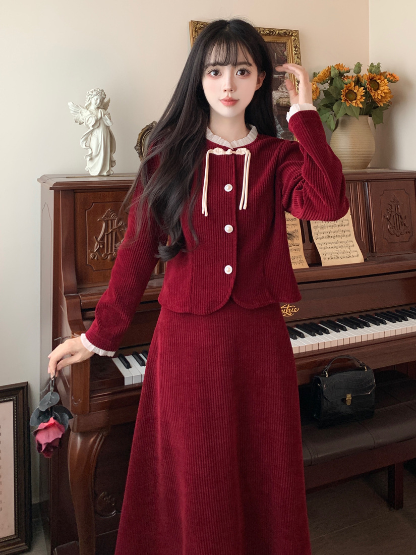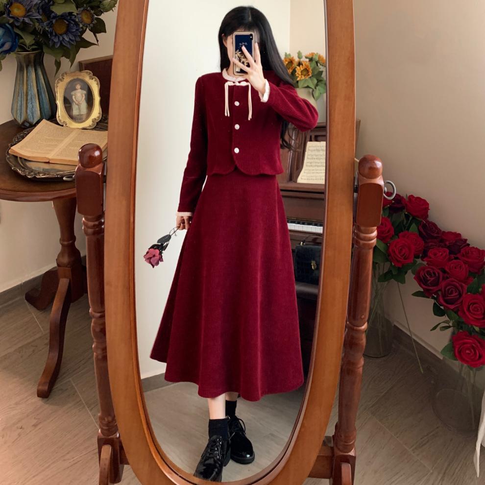 Large size French small fragrant style red corduroy fashion suit skirt women's autumn and winter temperament thin skirt two-piece set