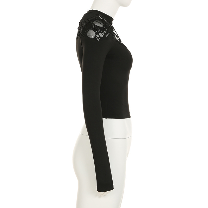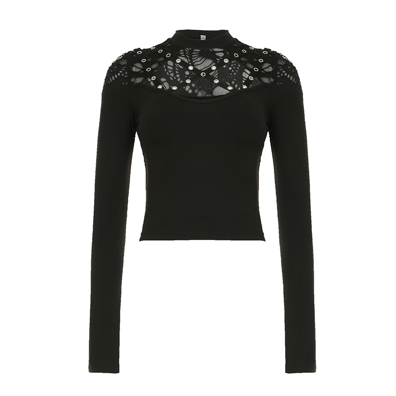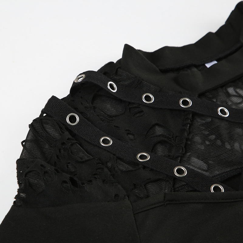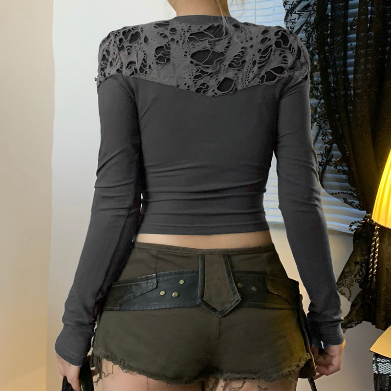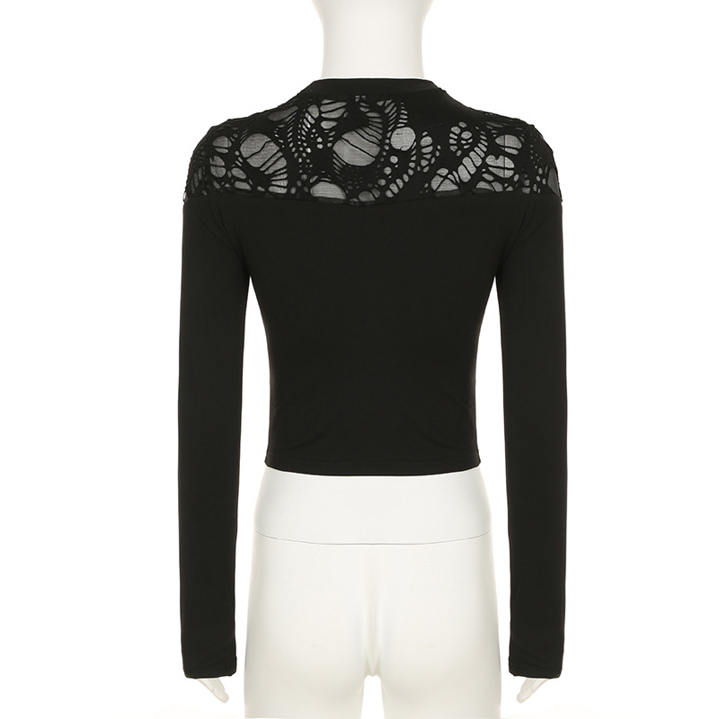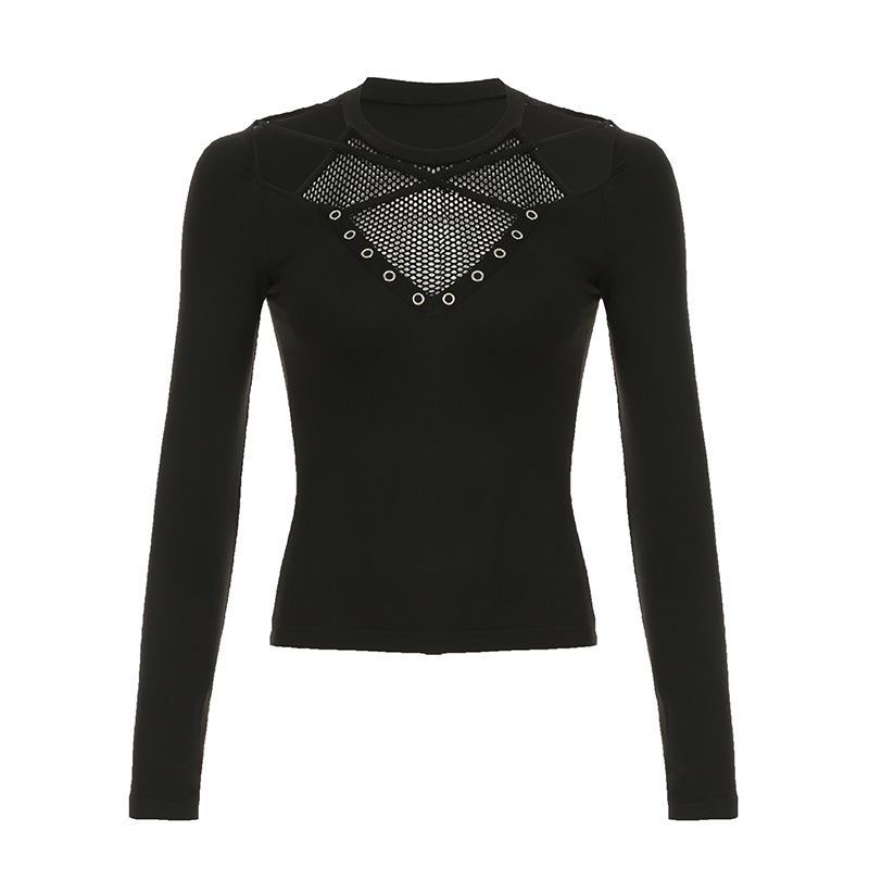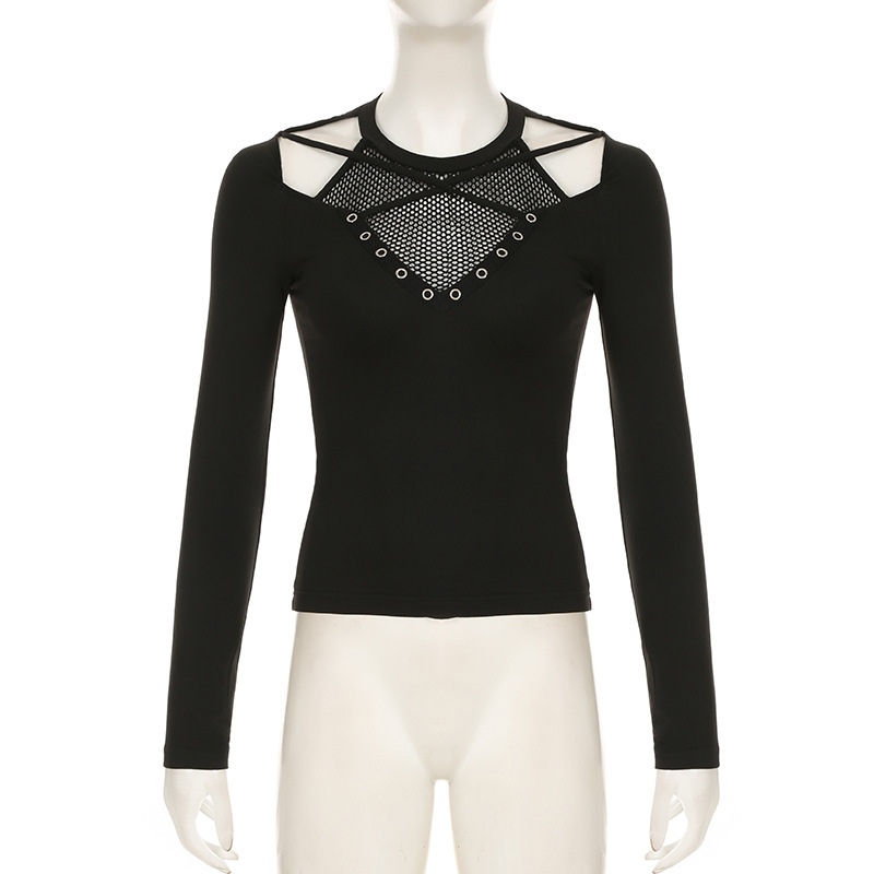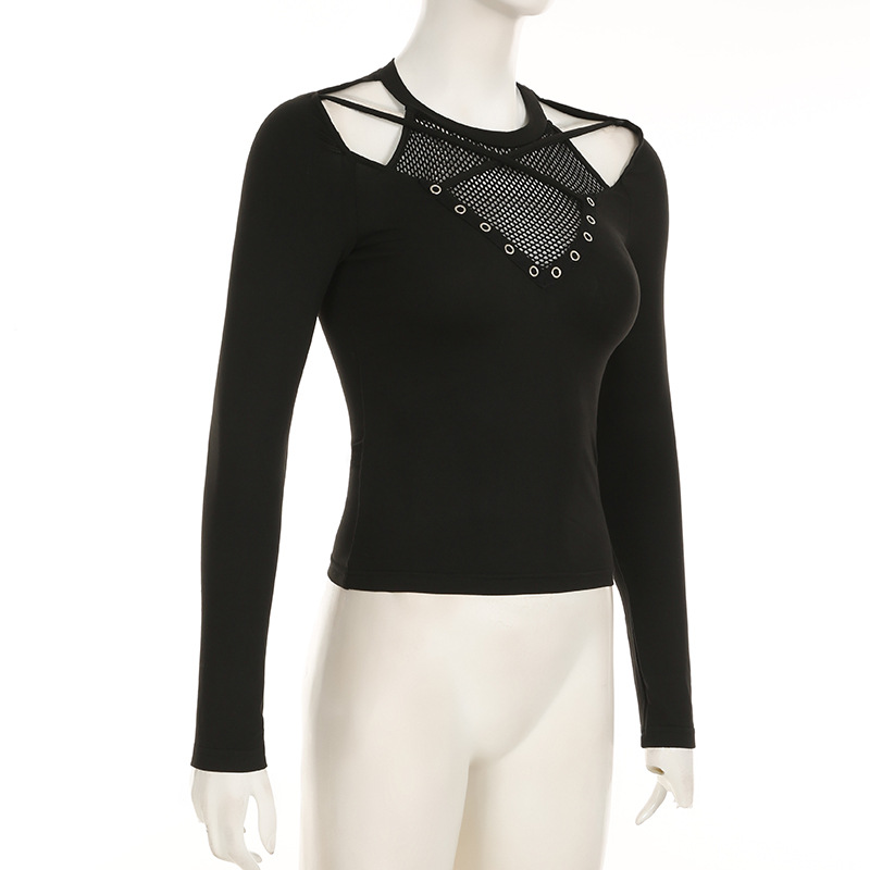 Love cloth forget Y2K dark irregular mesh splicing hollow off-the-shoulder long-sleeved T-shirt sexy see-through slim-fit top