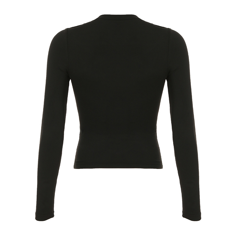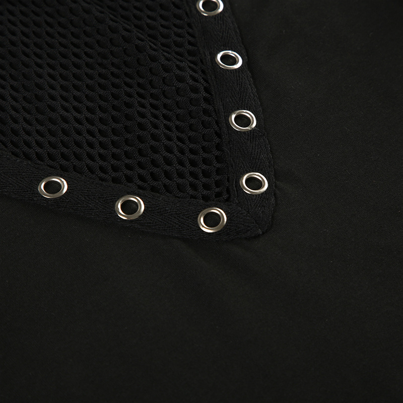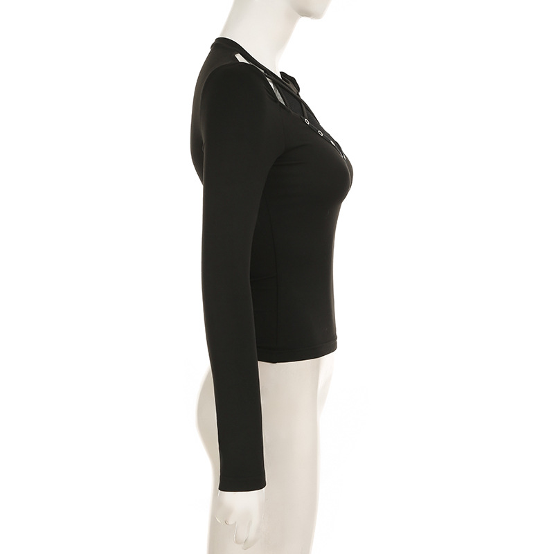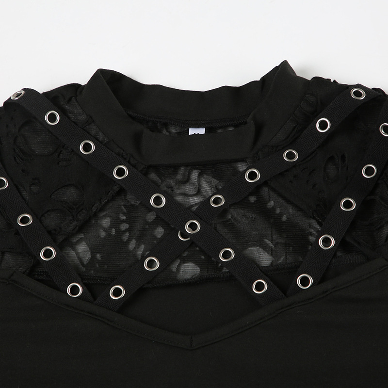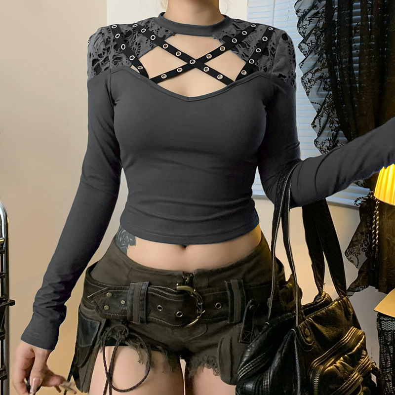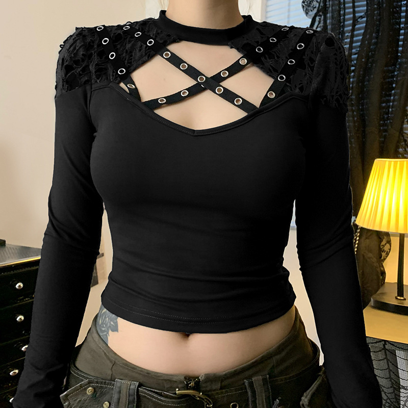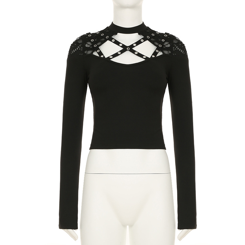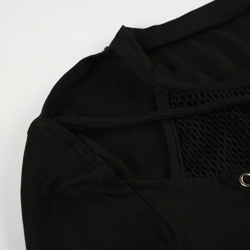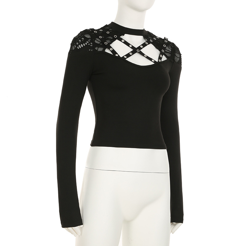 Love cloth forget Y2K dark irregular mesh splicing hollow off-the-shoulder long-sleeved T-shirt sexy see-through slim-fit top