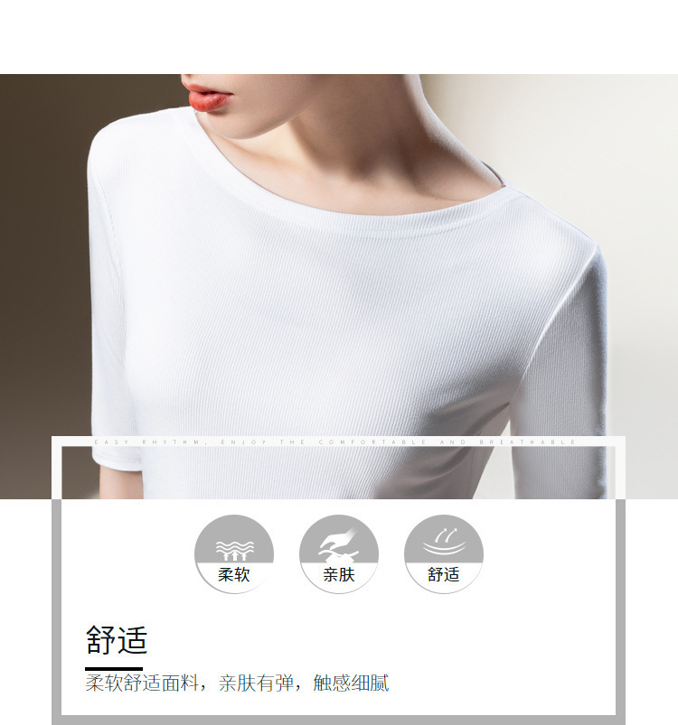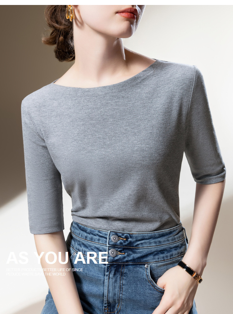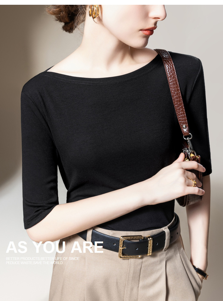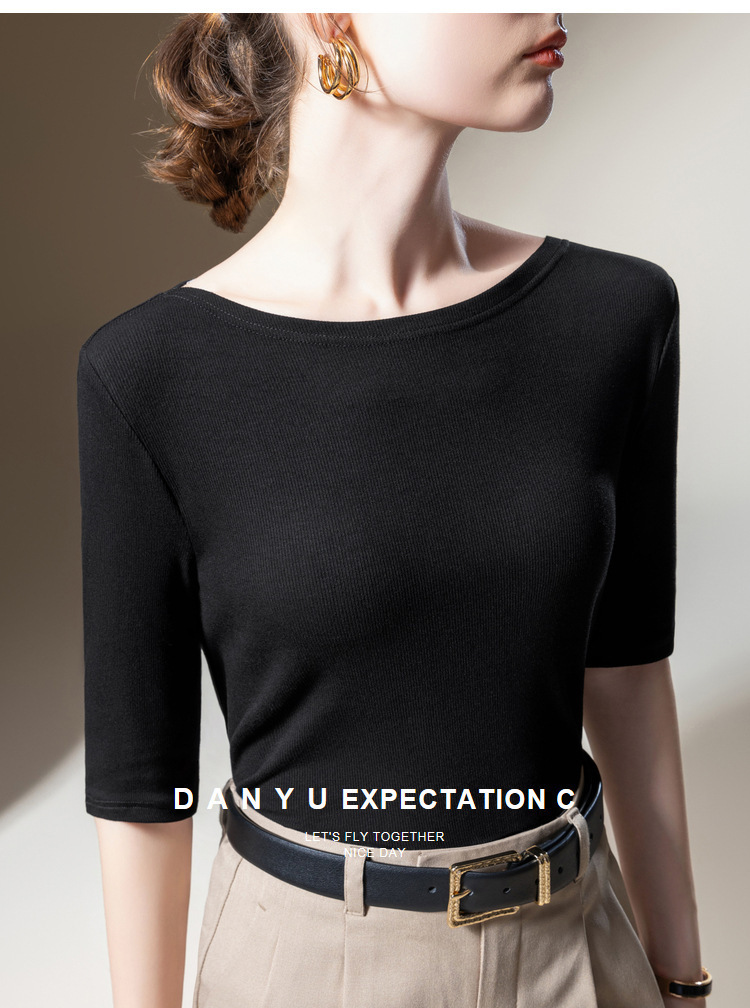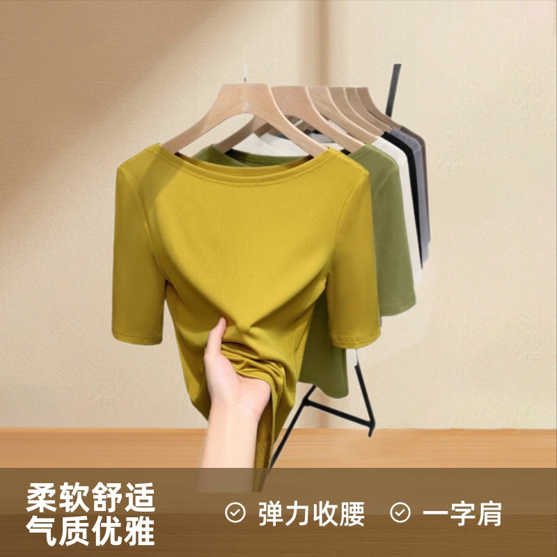 Medium-sleeved t-shirt women's 2025 new women's clothing solid-color threaded half-sleeved t-shirt temperament one-word shoulder elastic waist top
