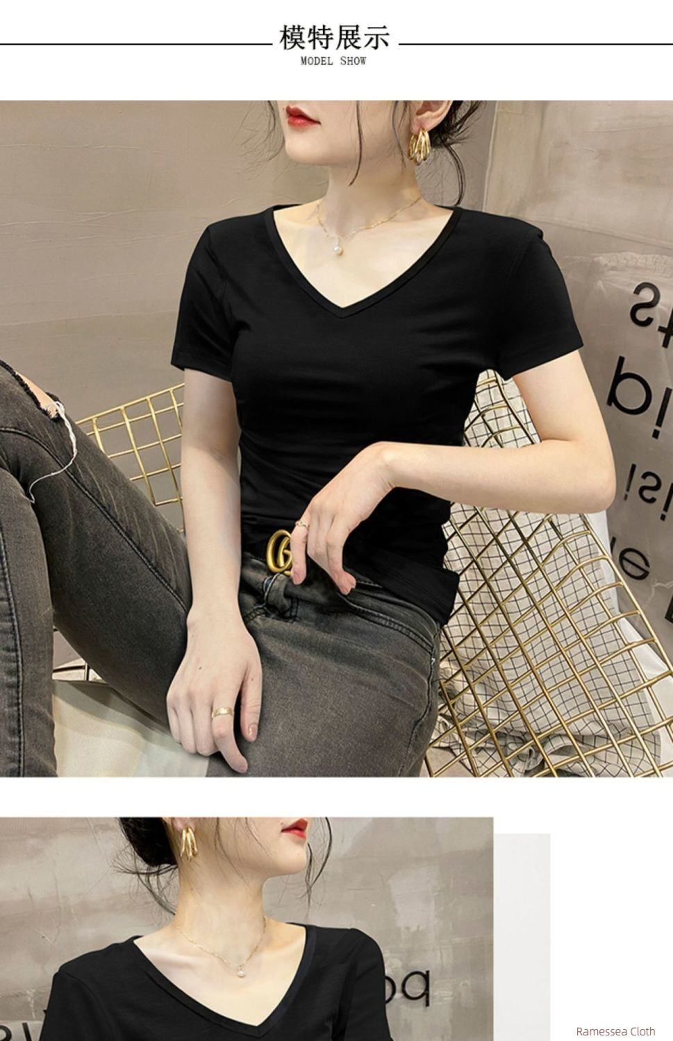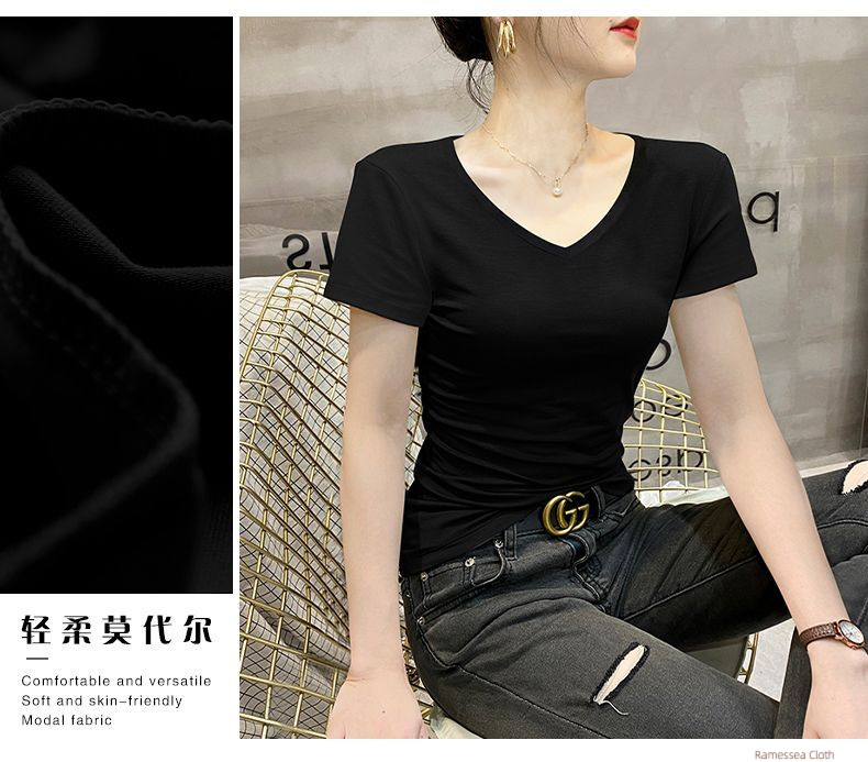 Modal short-sleeved t-shirt women's summer slim-fitting and thin V-neck top thin ice silk chicken heart collar half-sleeved foreign style t-shirt