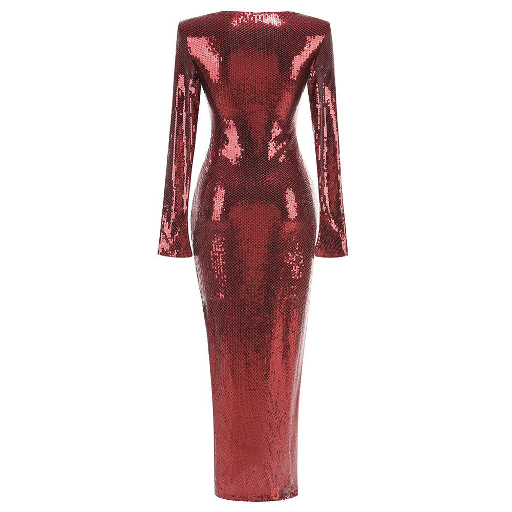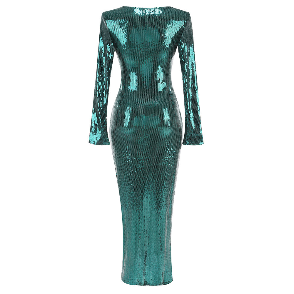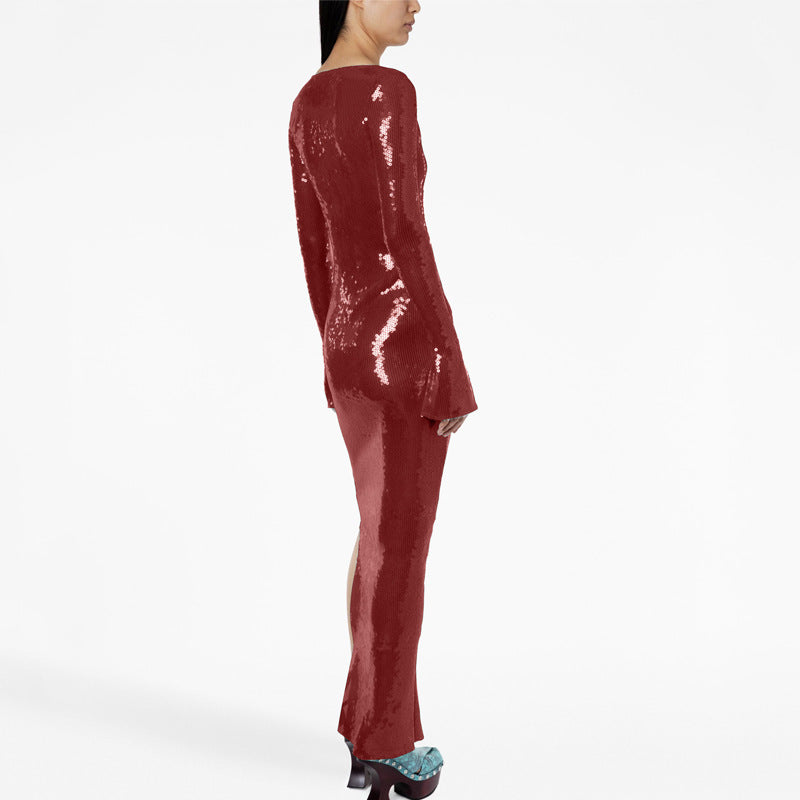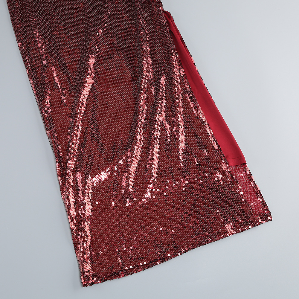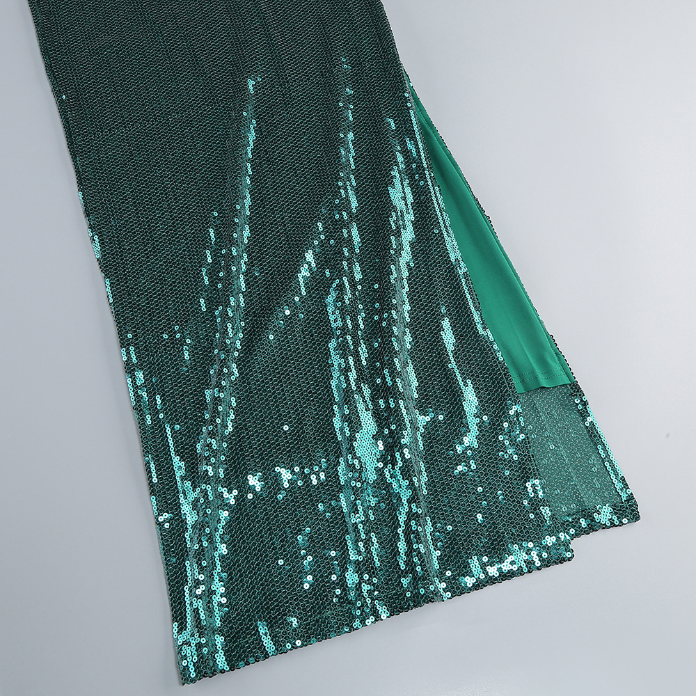 New Amazon Europe and the United States sexy sequin flared sleeve skirt women's U-neck women's clothing hem split dress long