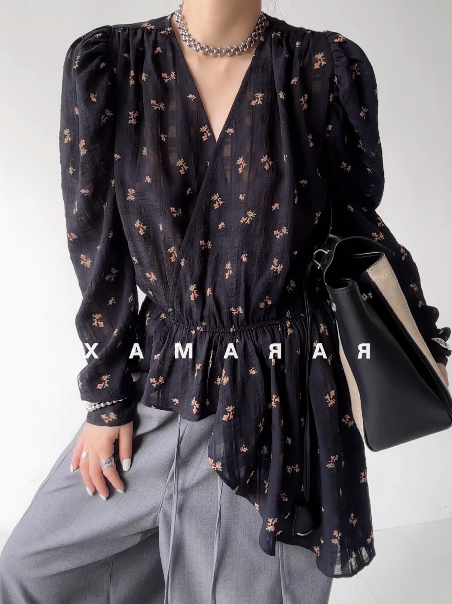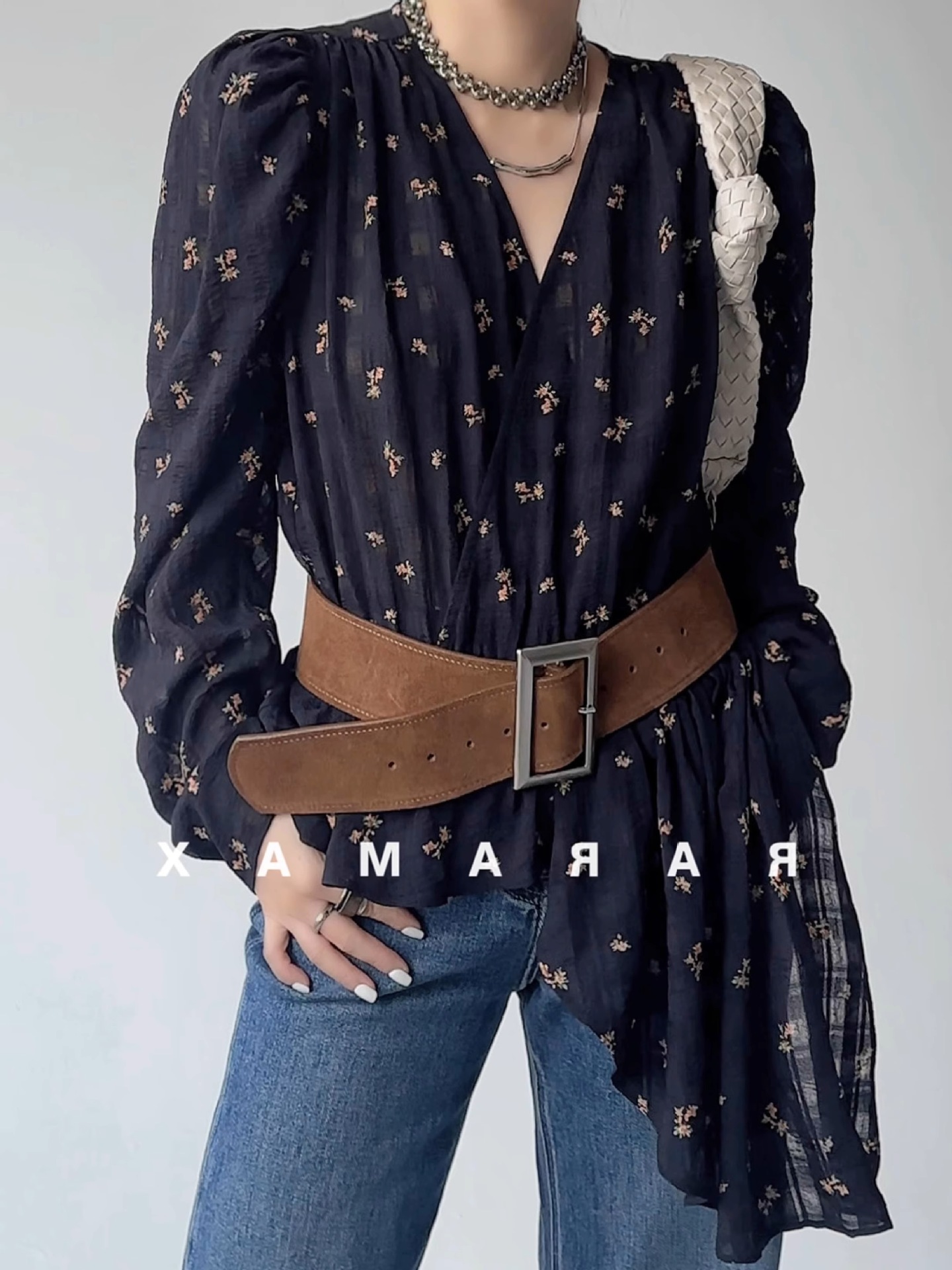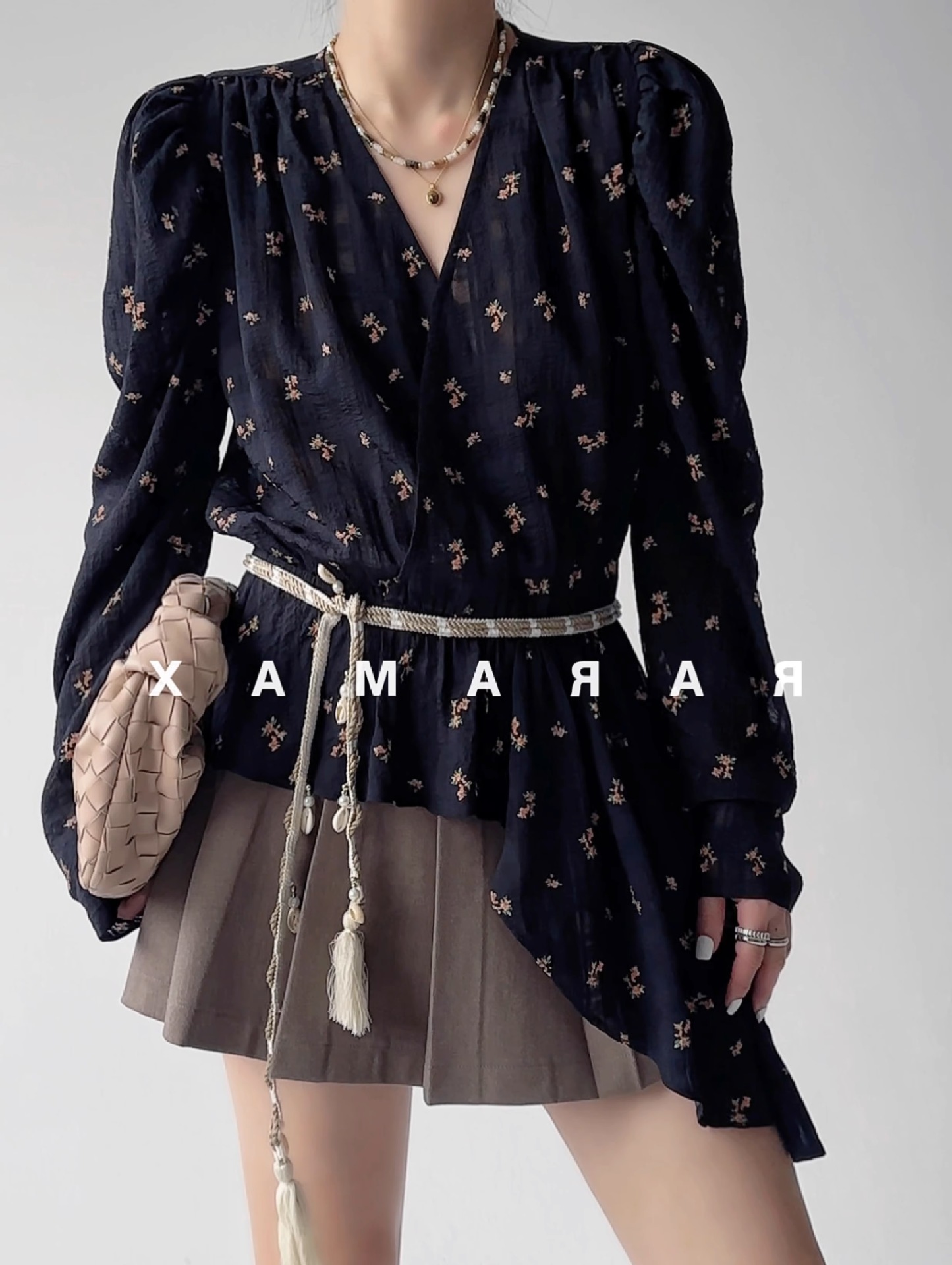 New BohoChic'yarn hemp 'silk, court bubble sleeves, printed chiffon shirt