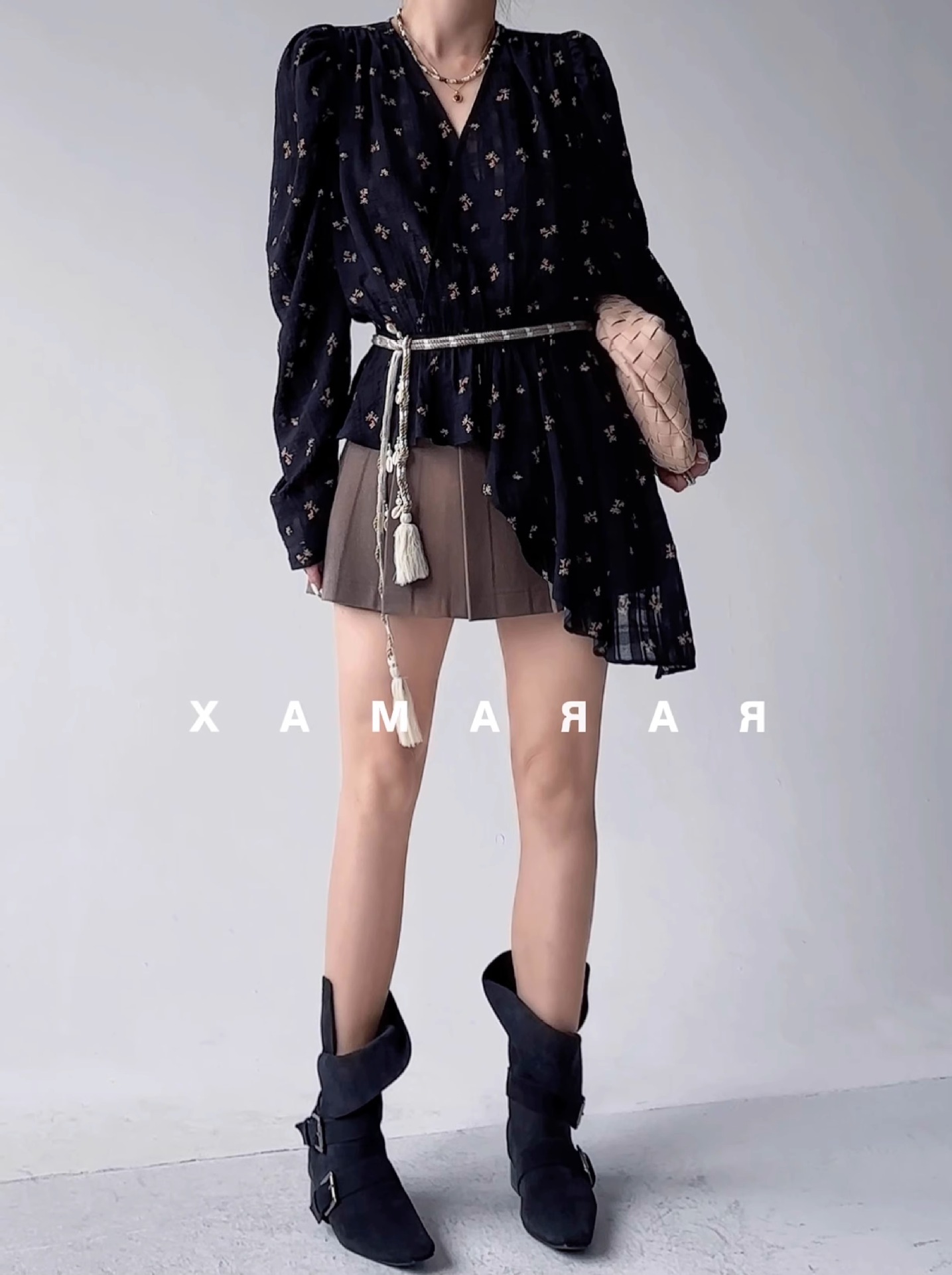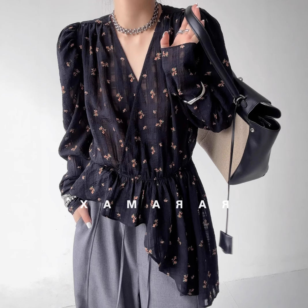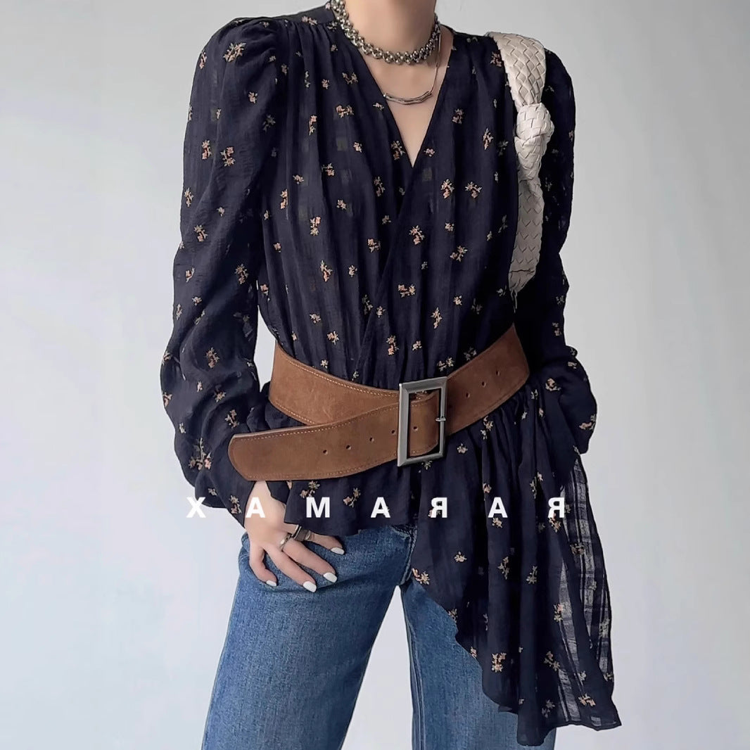 New BohoChic'yarn hemp 'silk, court bubble sleeves, printed chiffon shirt