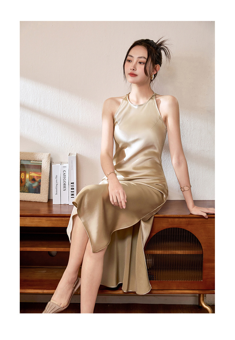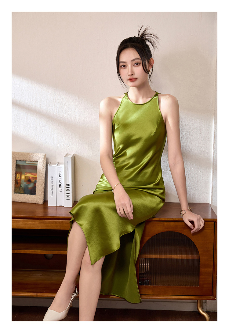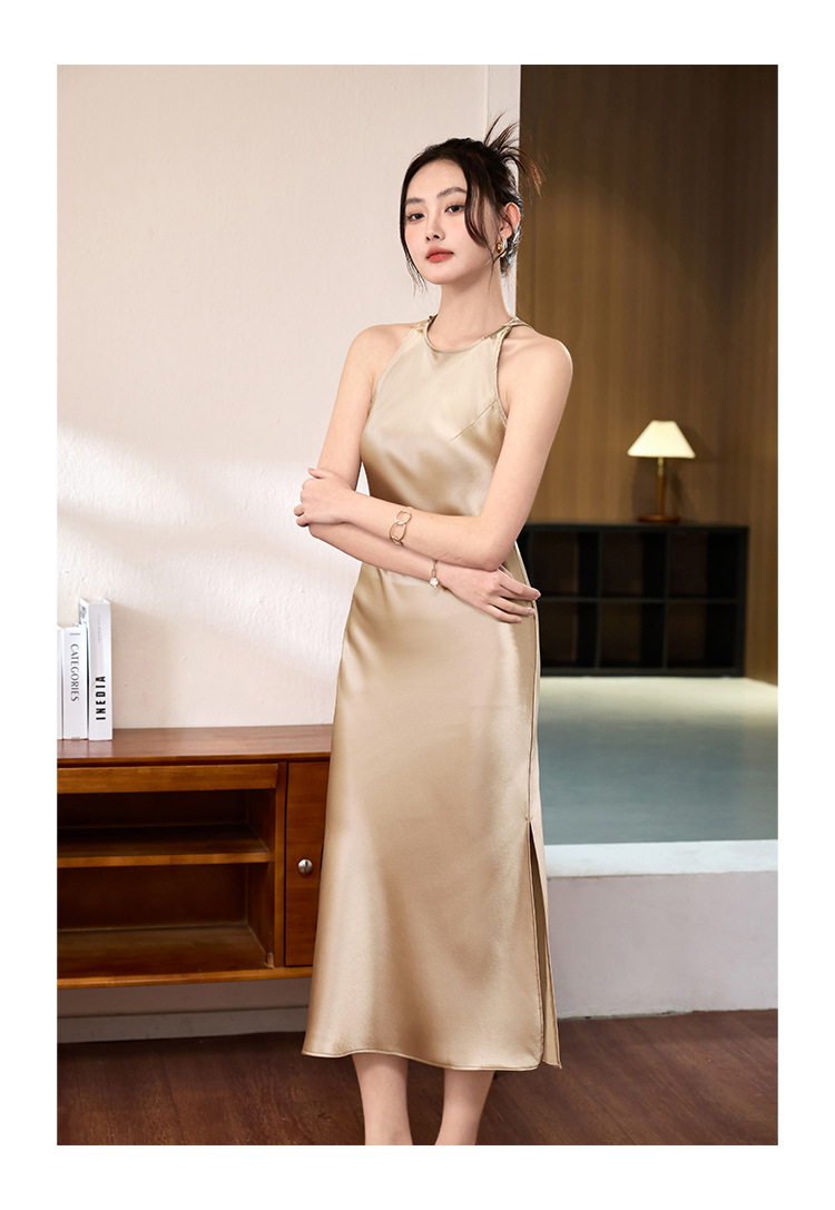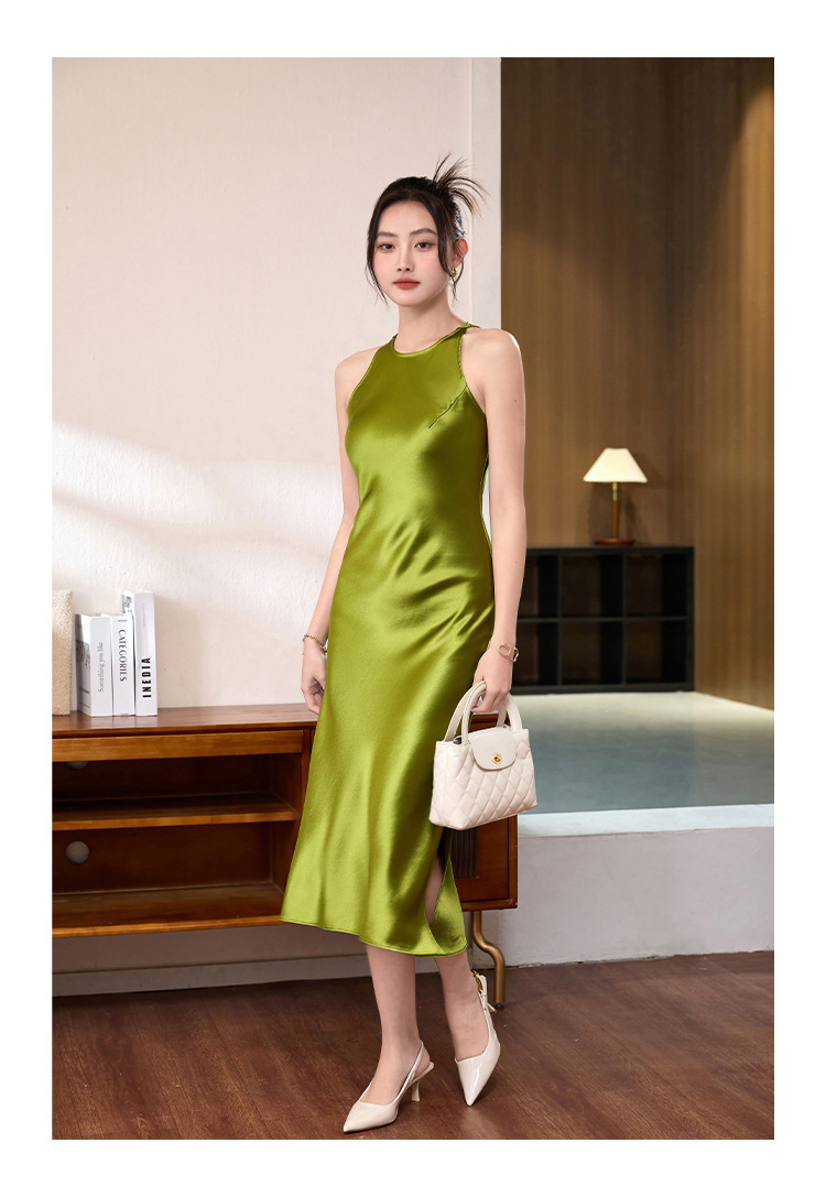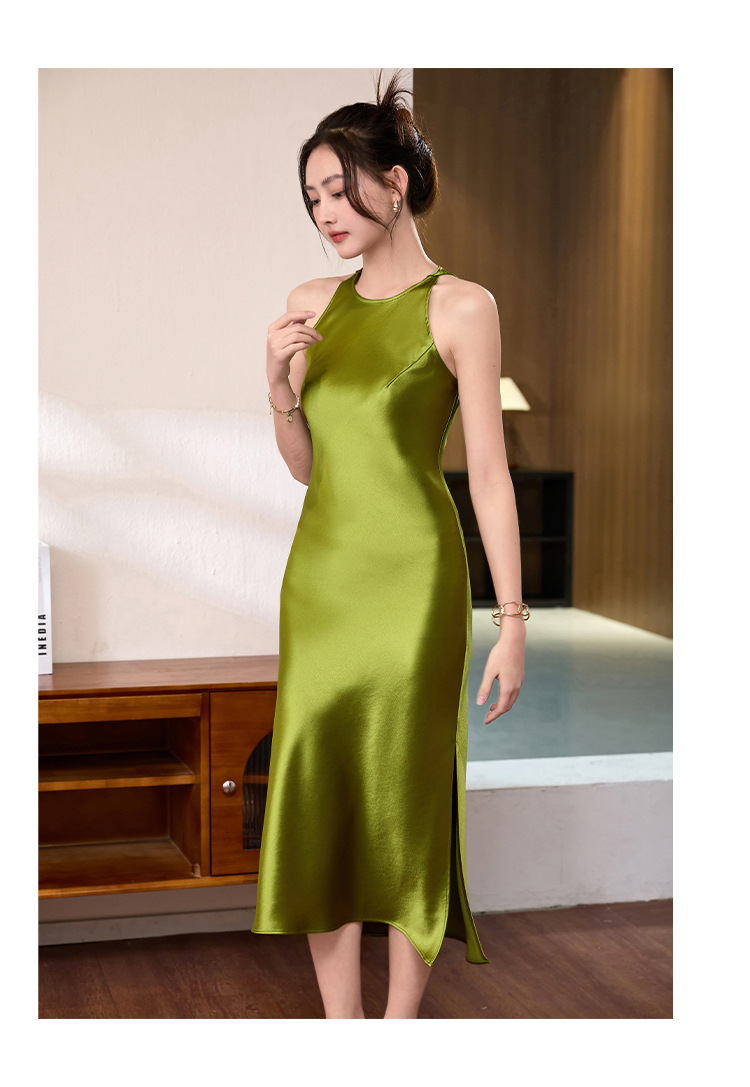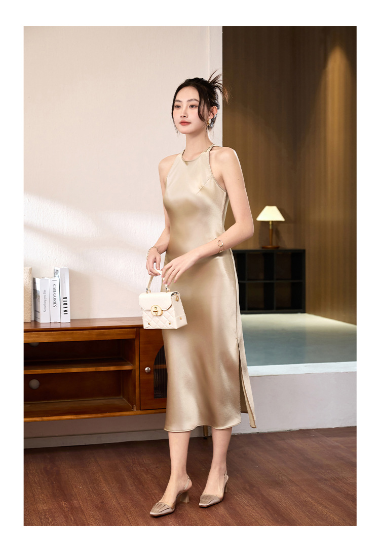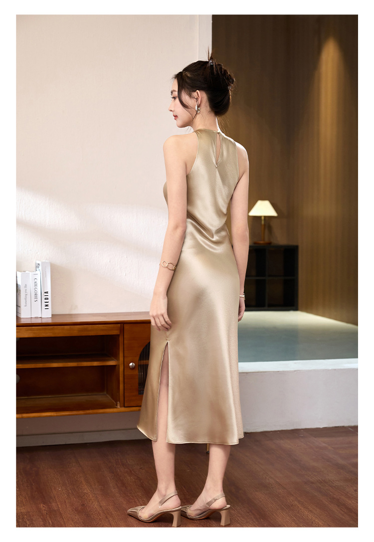New Chinese acetic acid satin sleeveless dress for women's summer waist temperament versatile slit skirt looking thin commuting