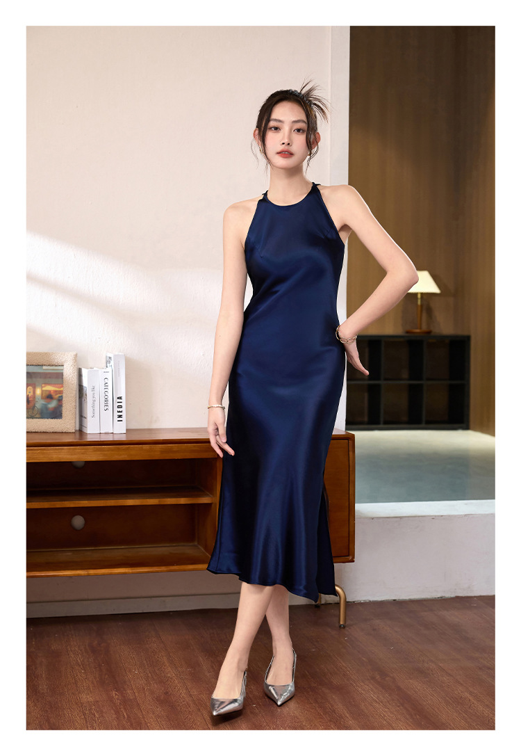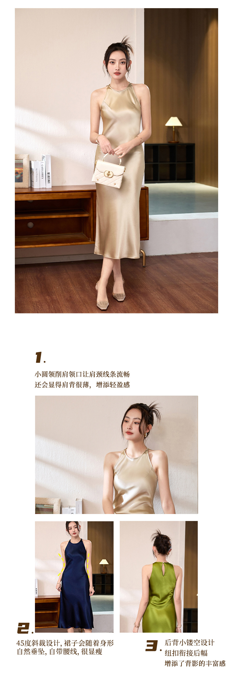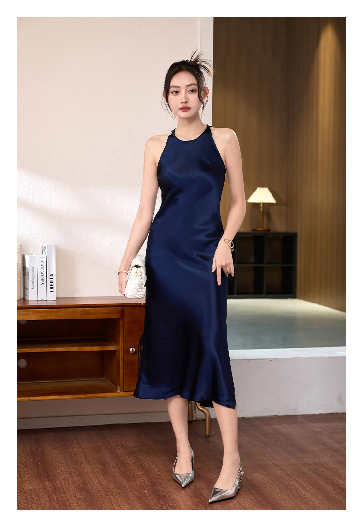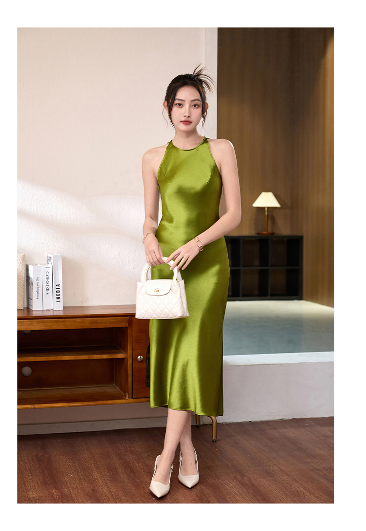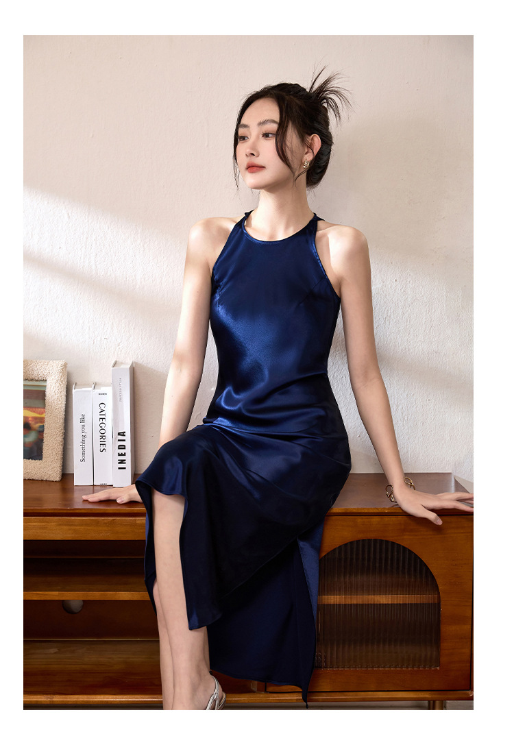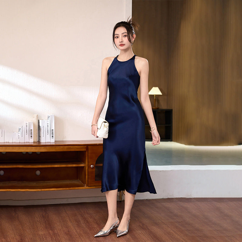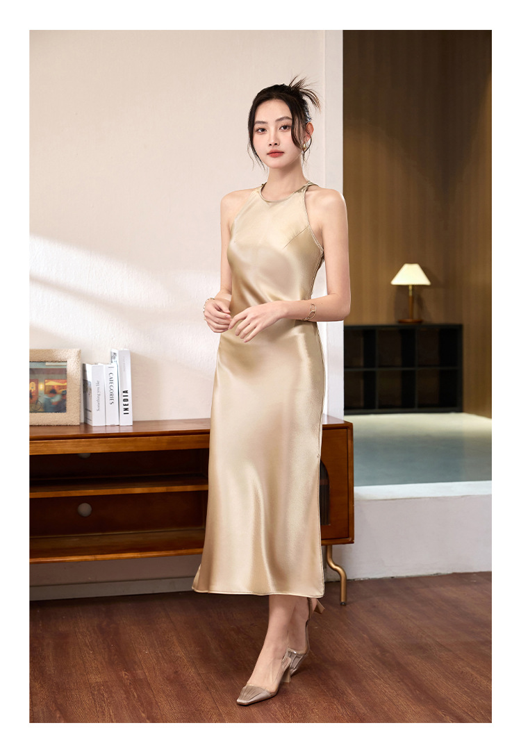New Chinese acetic acid satin sleeveless dress for women's summer waist temperament versatile slit skirt looking thin commuting