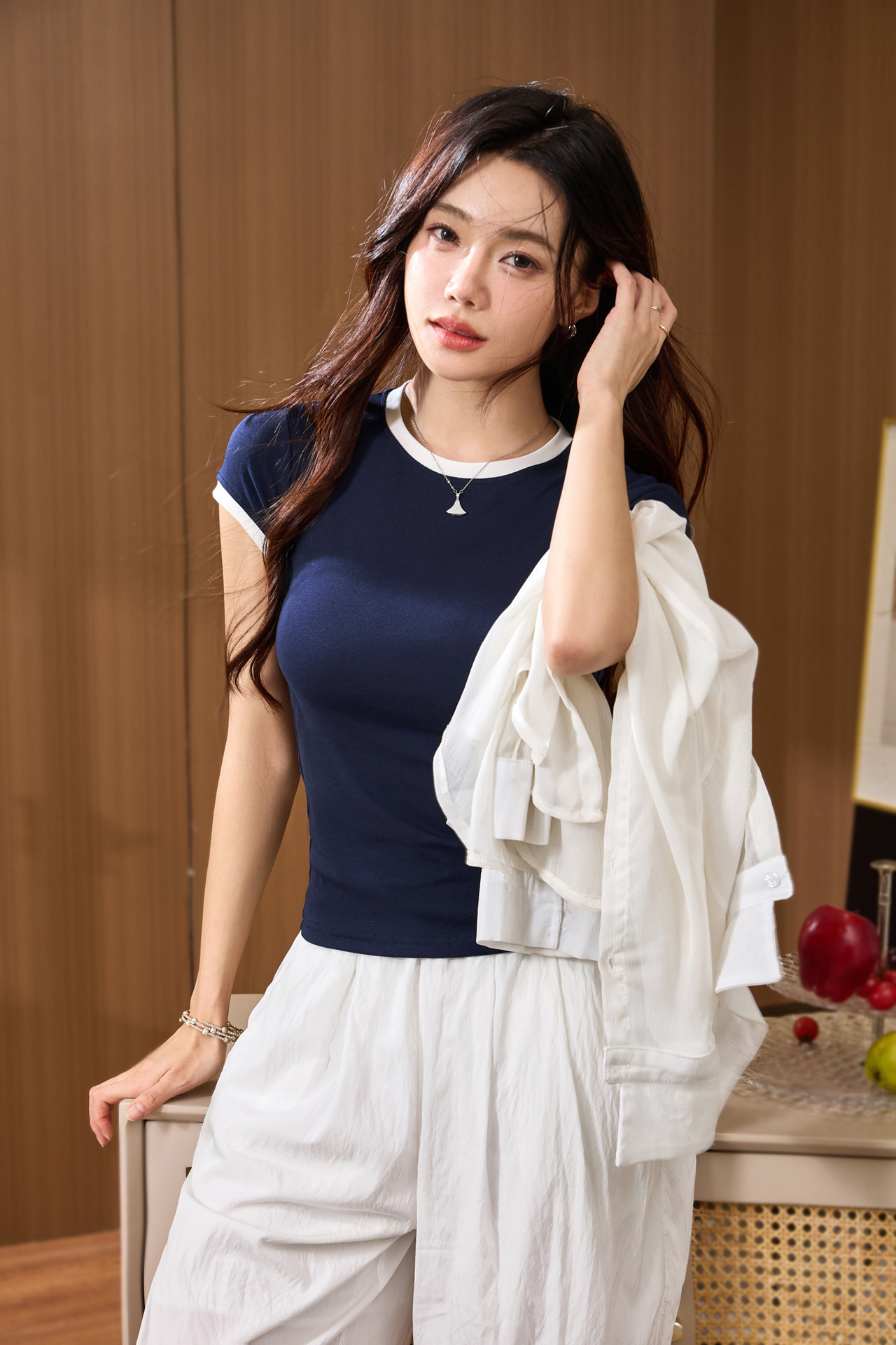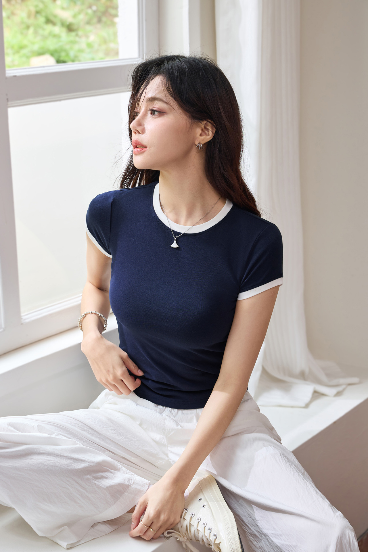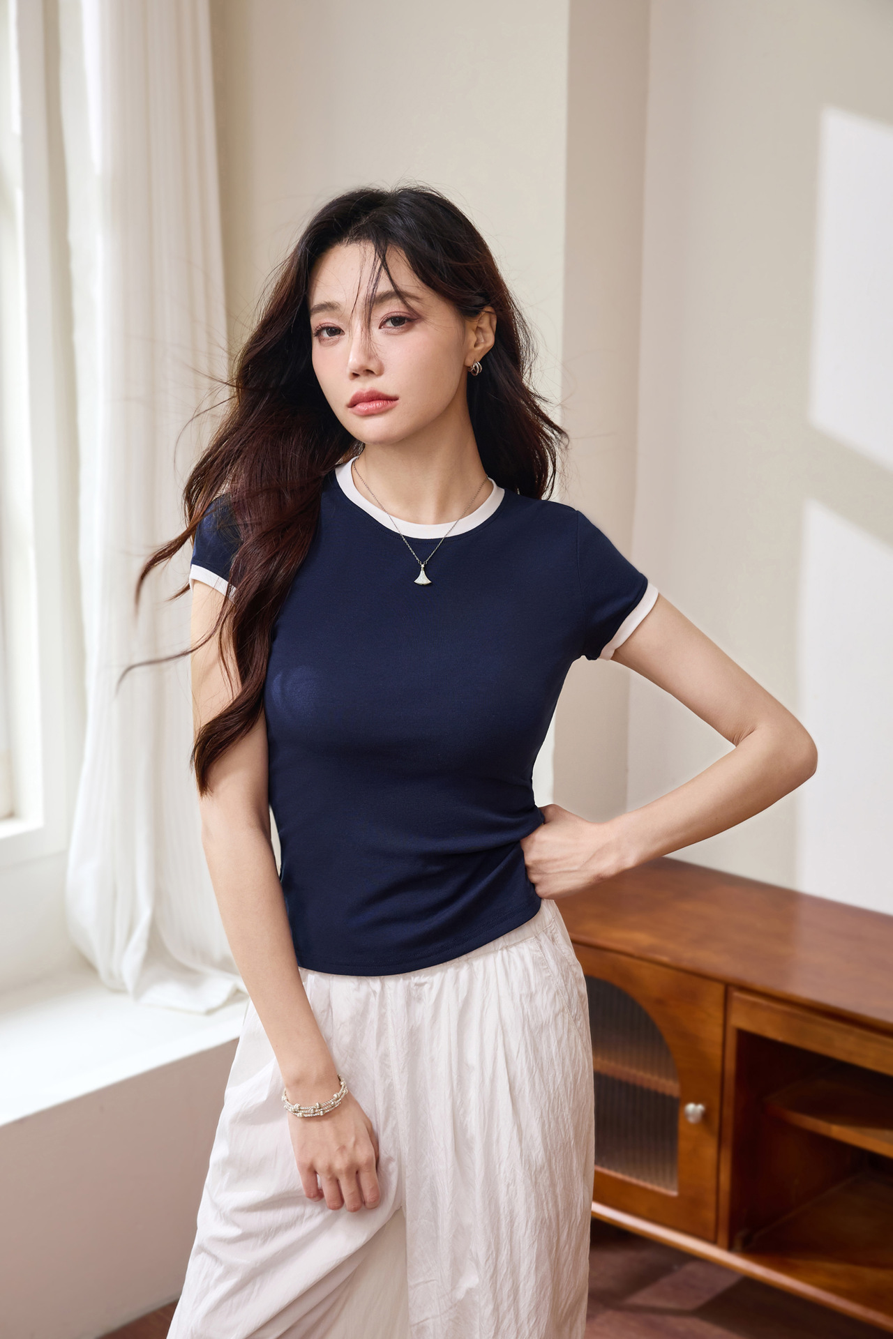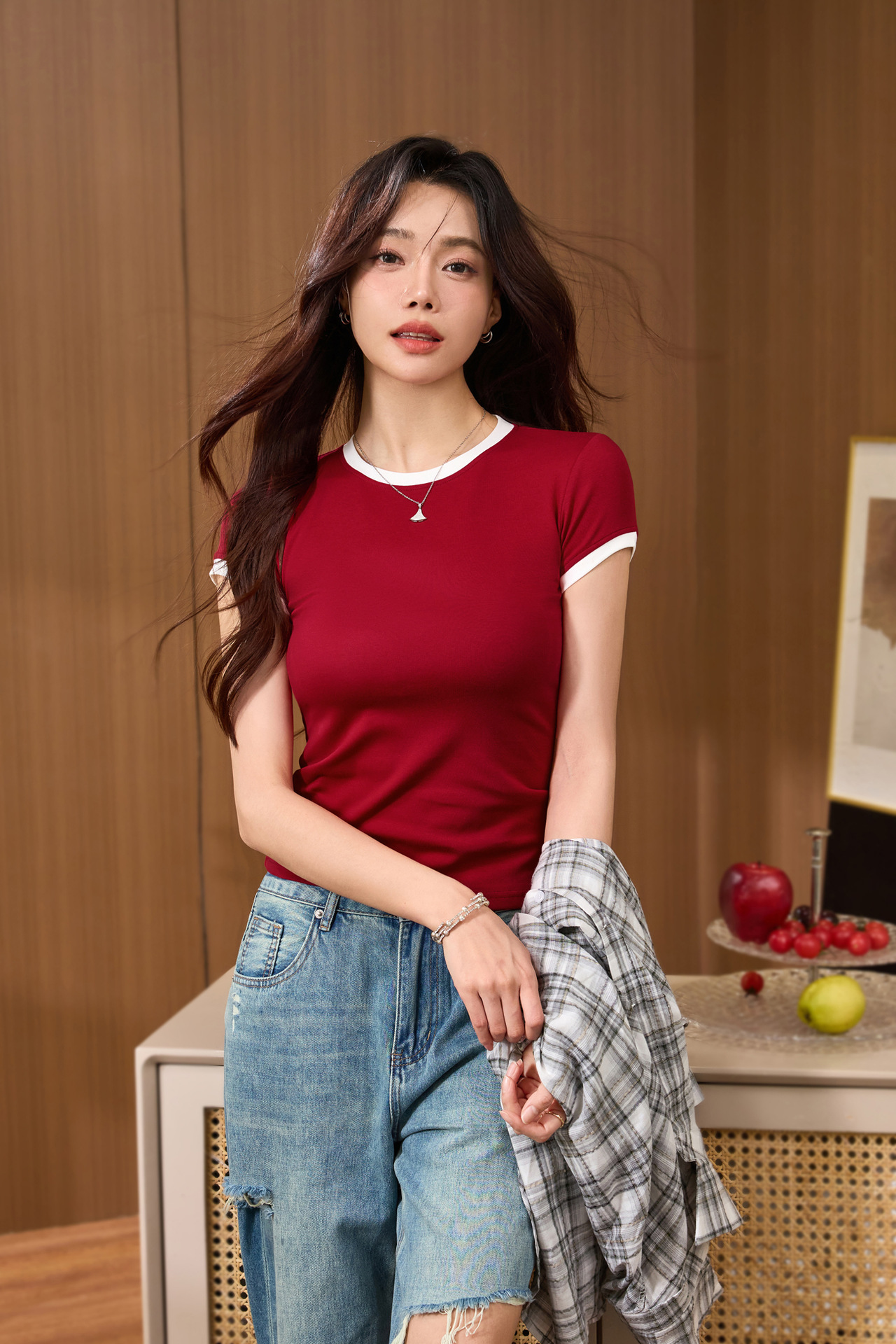 Pack collar sticker & 40 230g combed cotton T-shirts women's color matching short-sleeved slim-fitting and thin versatile round neck bottoming top