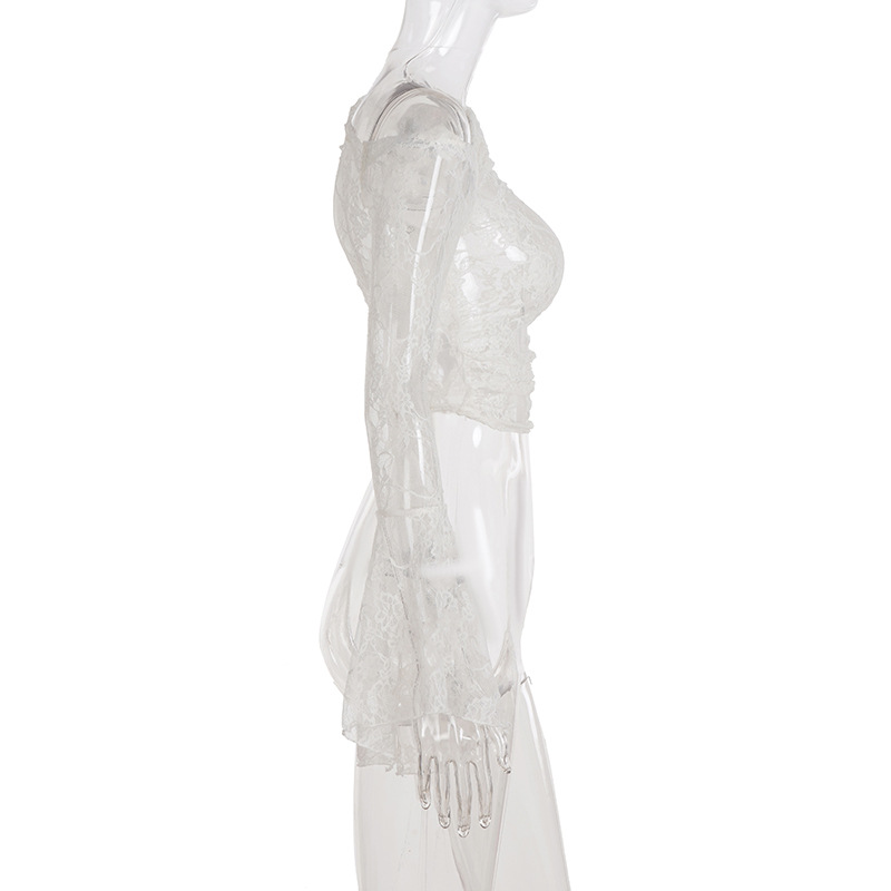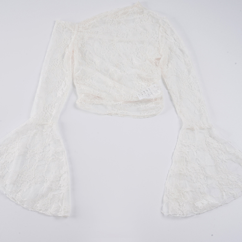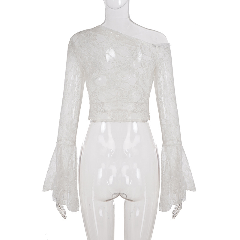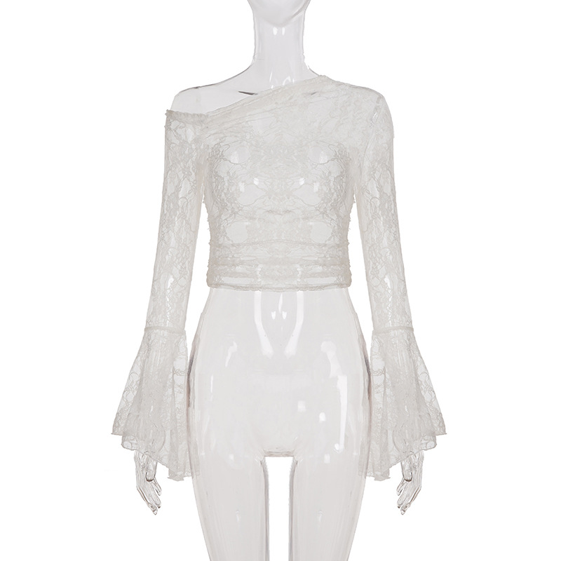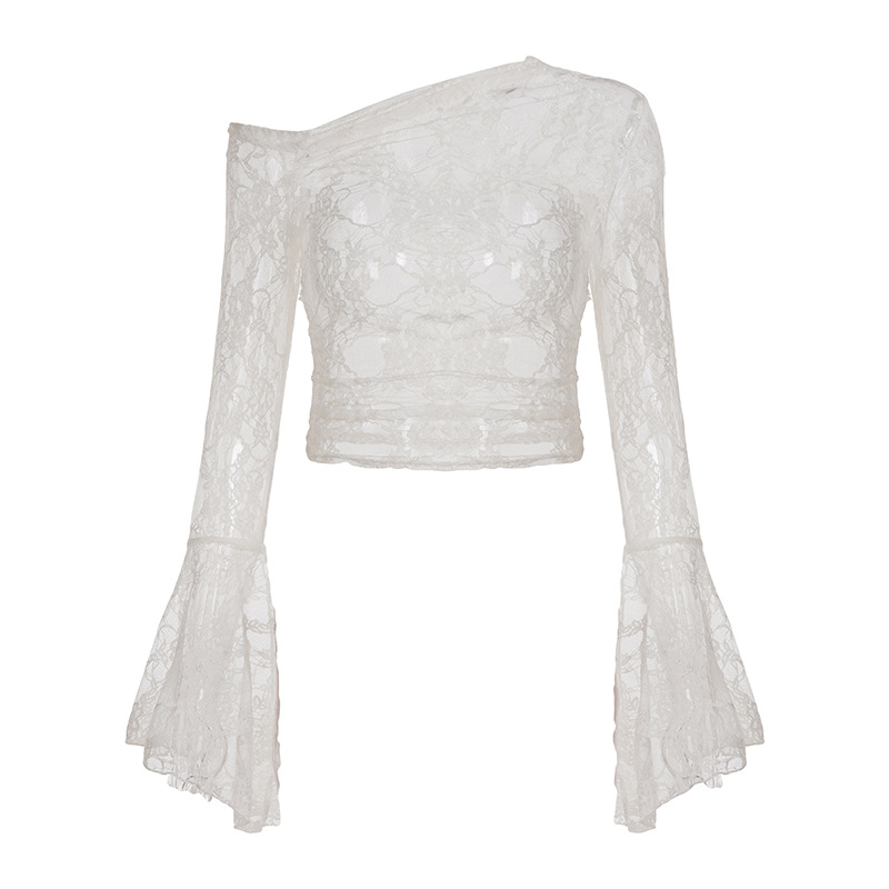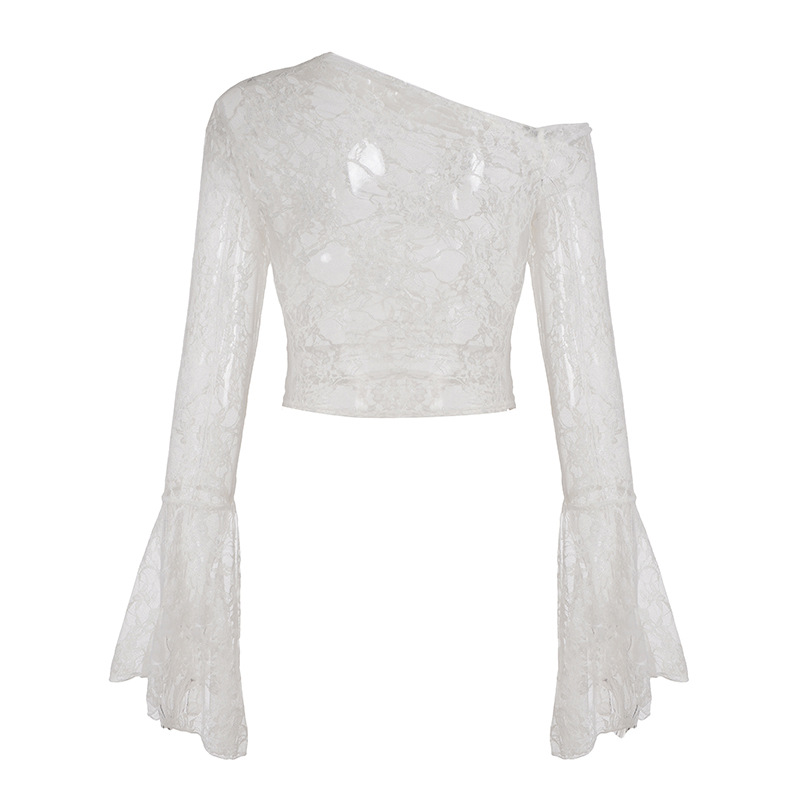 Pure desire sexy see-through lace jacquard horn sleeve T-shirt blouse irregular diagonal neck off-the-shoulder slim-fit thin top