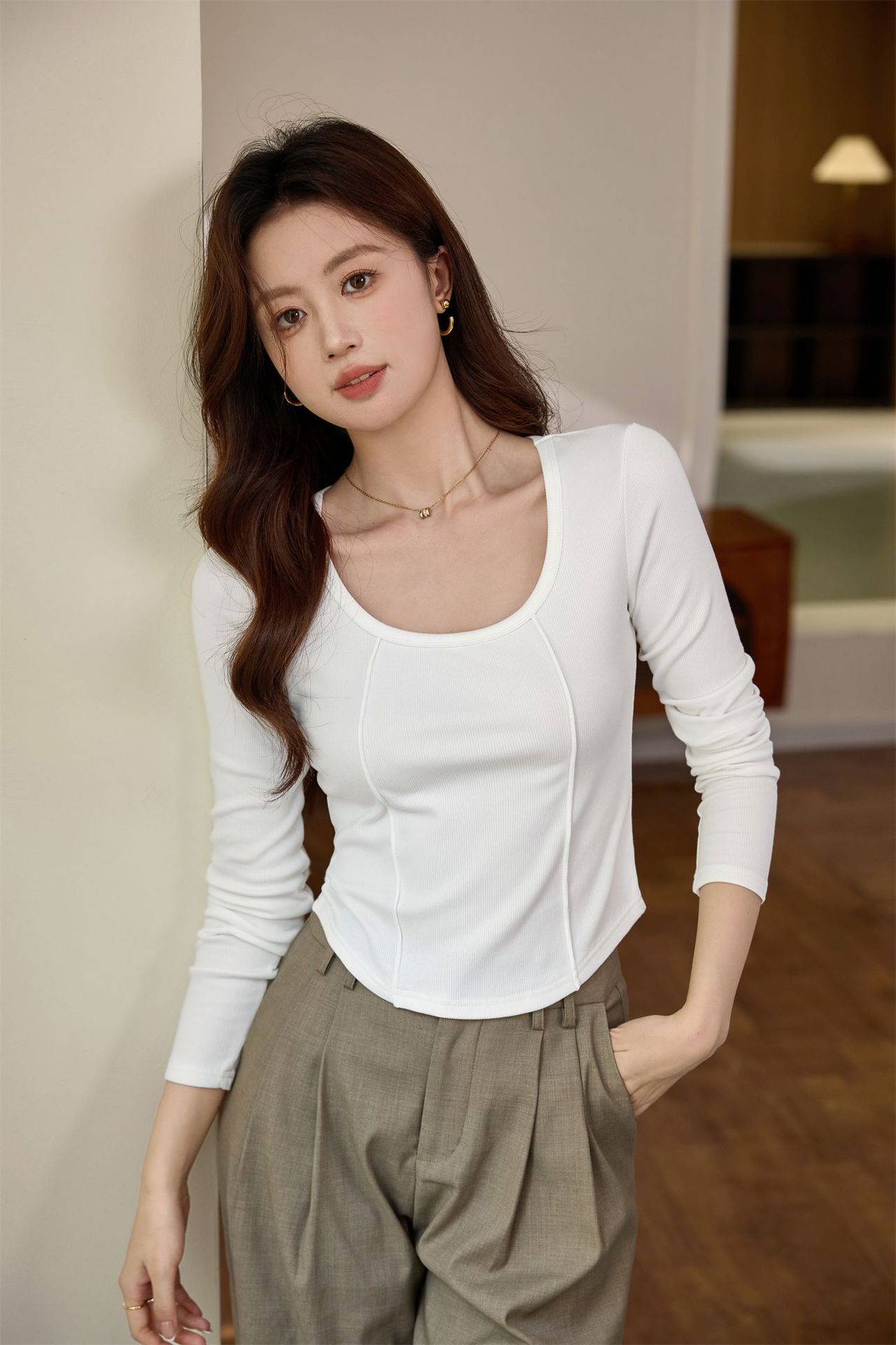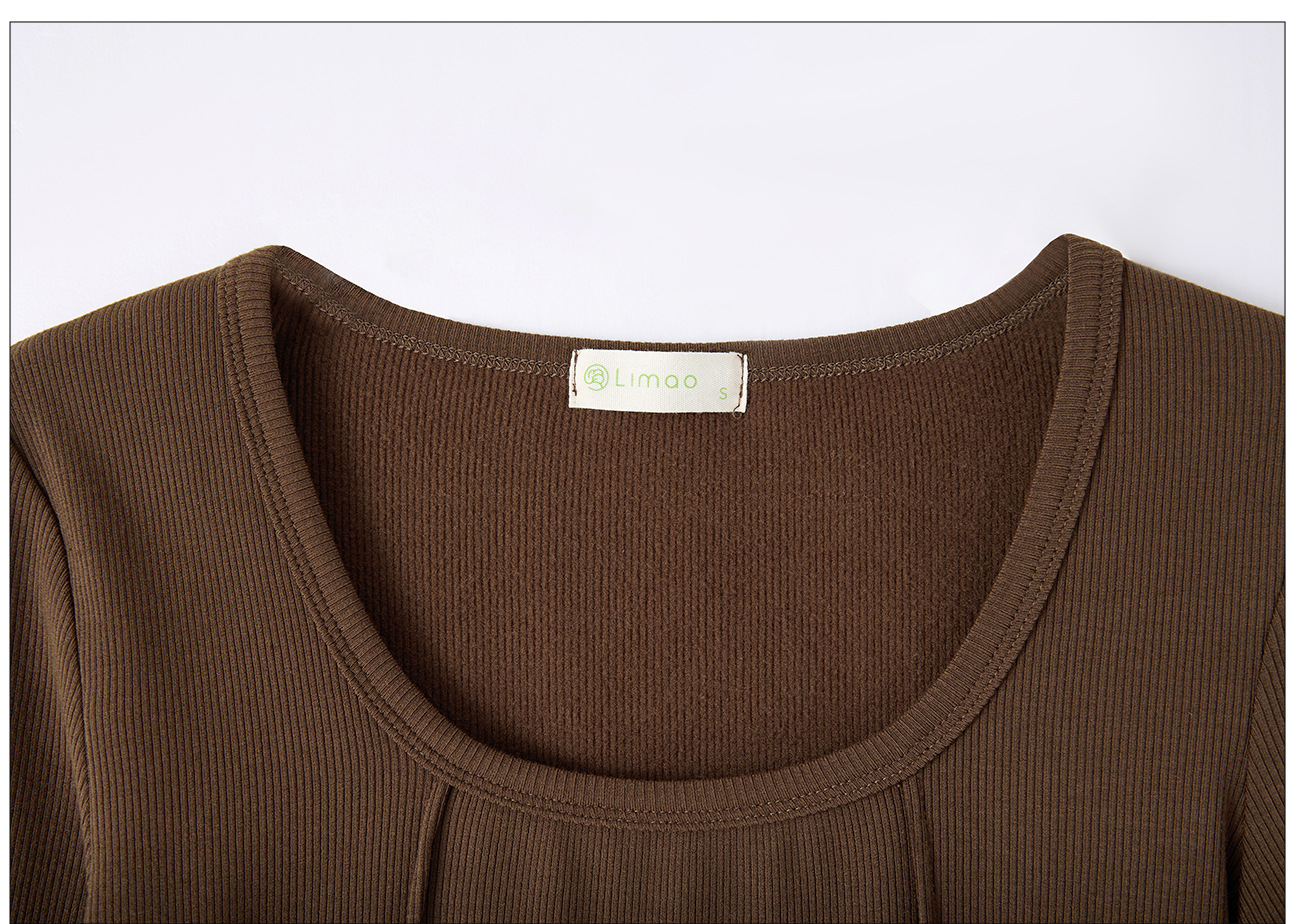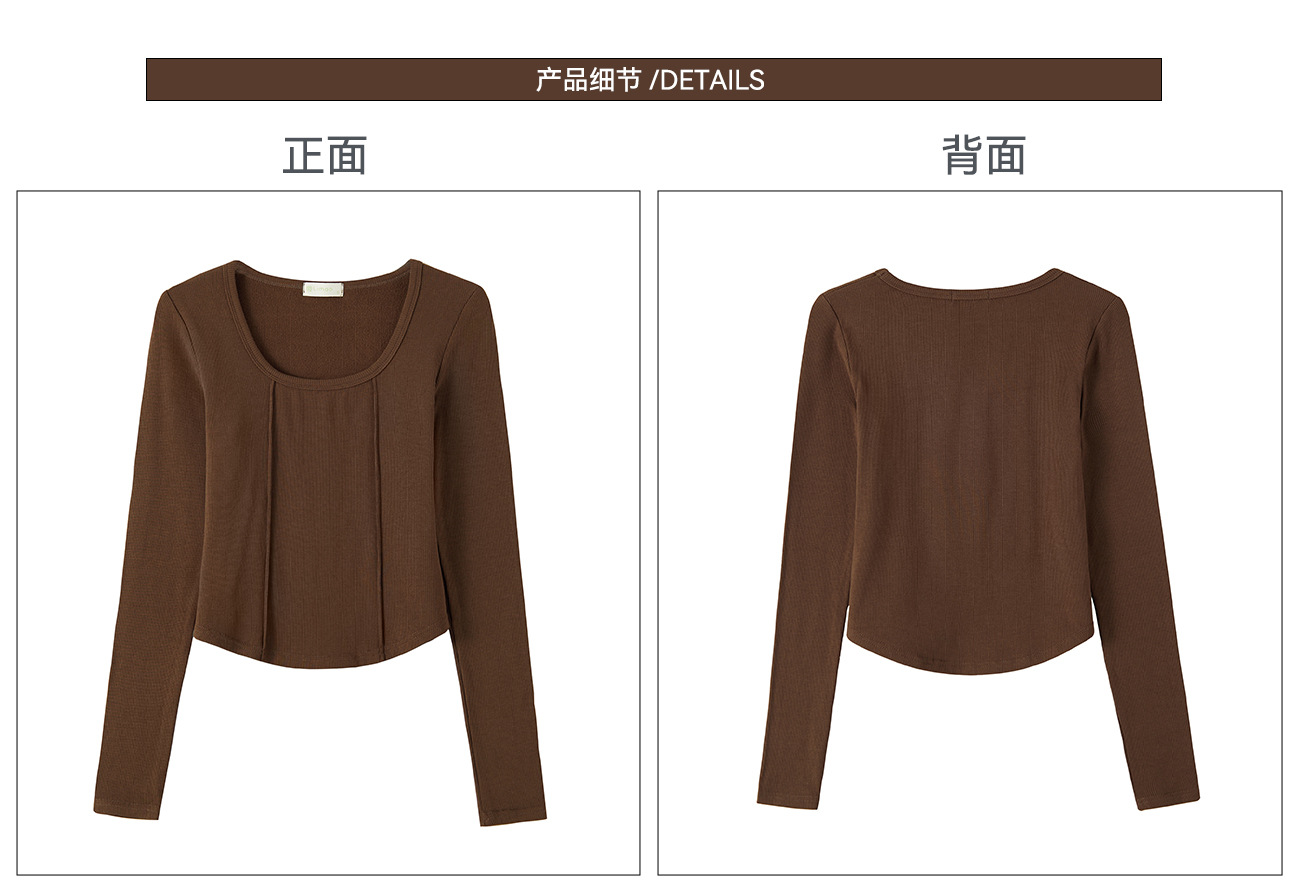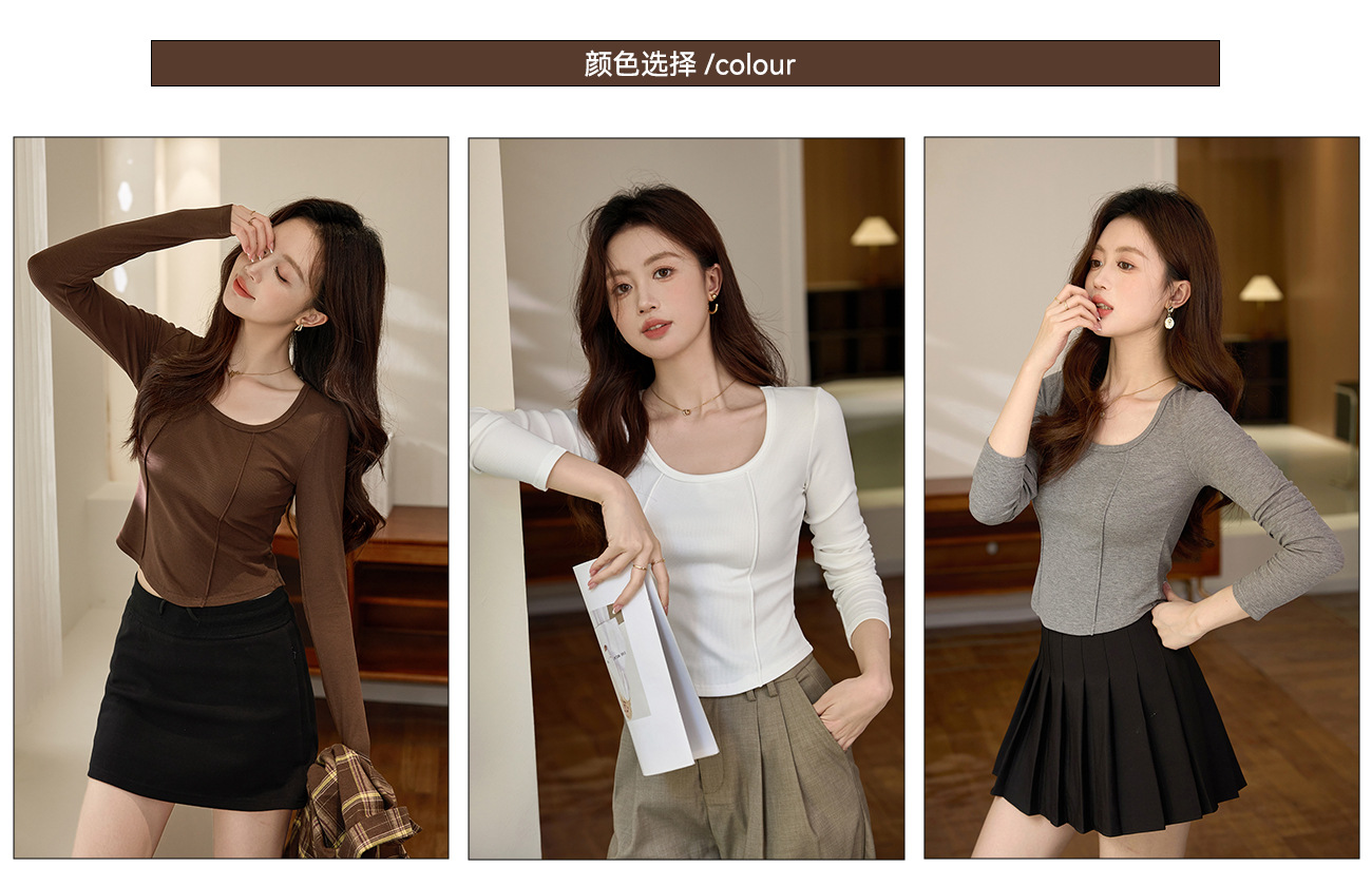 #Quality screening product #polished high-waisted short T-shirt women's big U-neck autumn new long-sleeved Spice Girl exposed navel thin velvet top