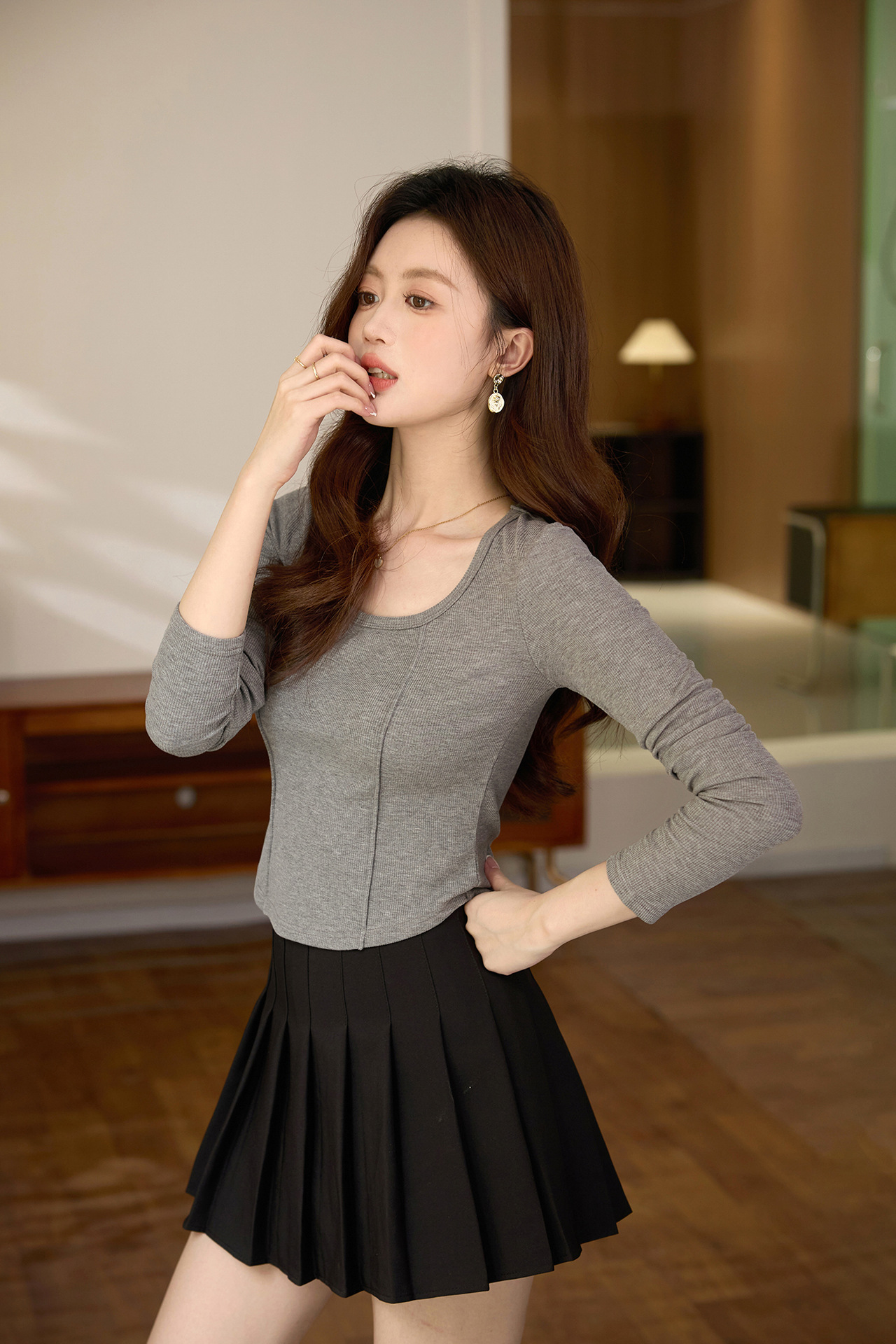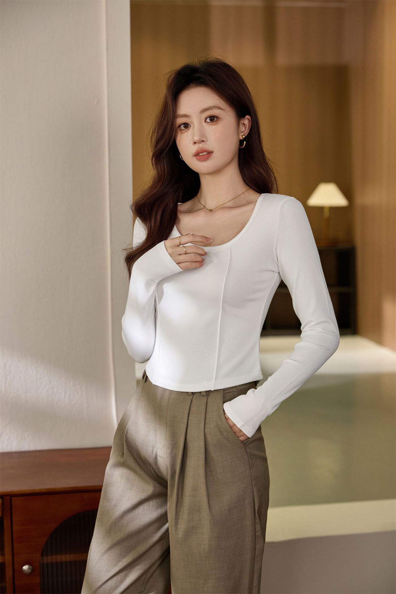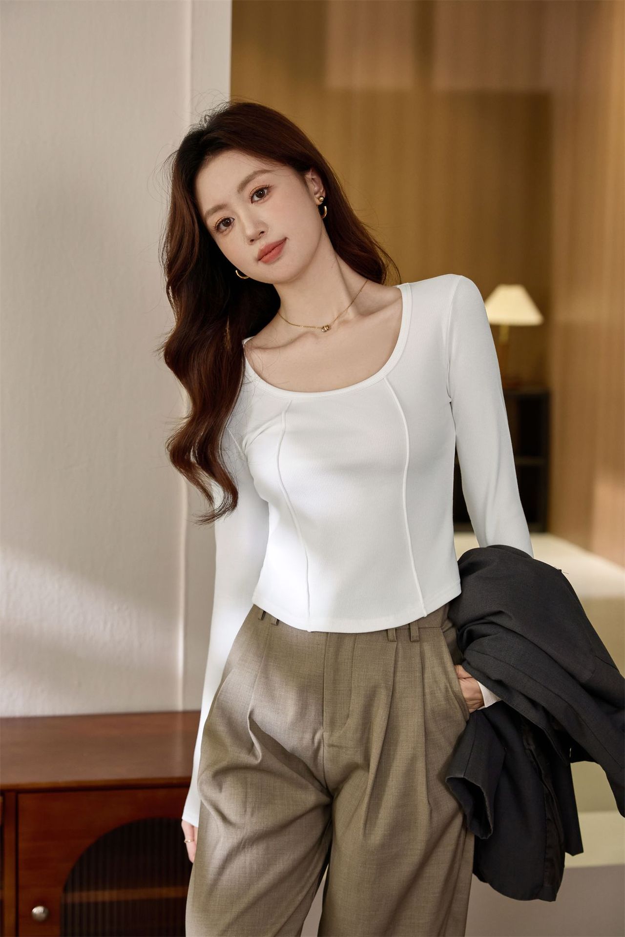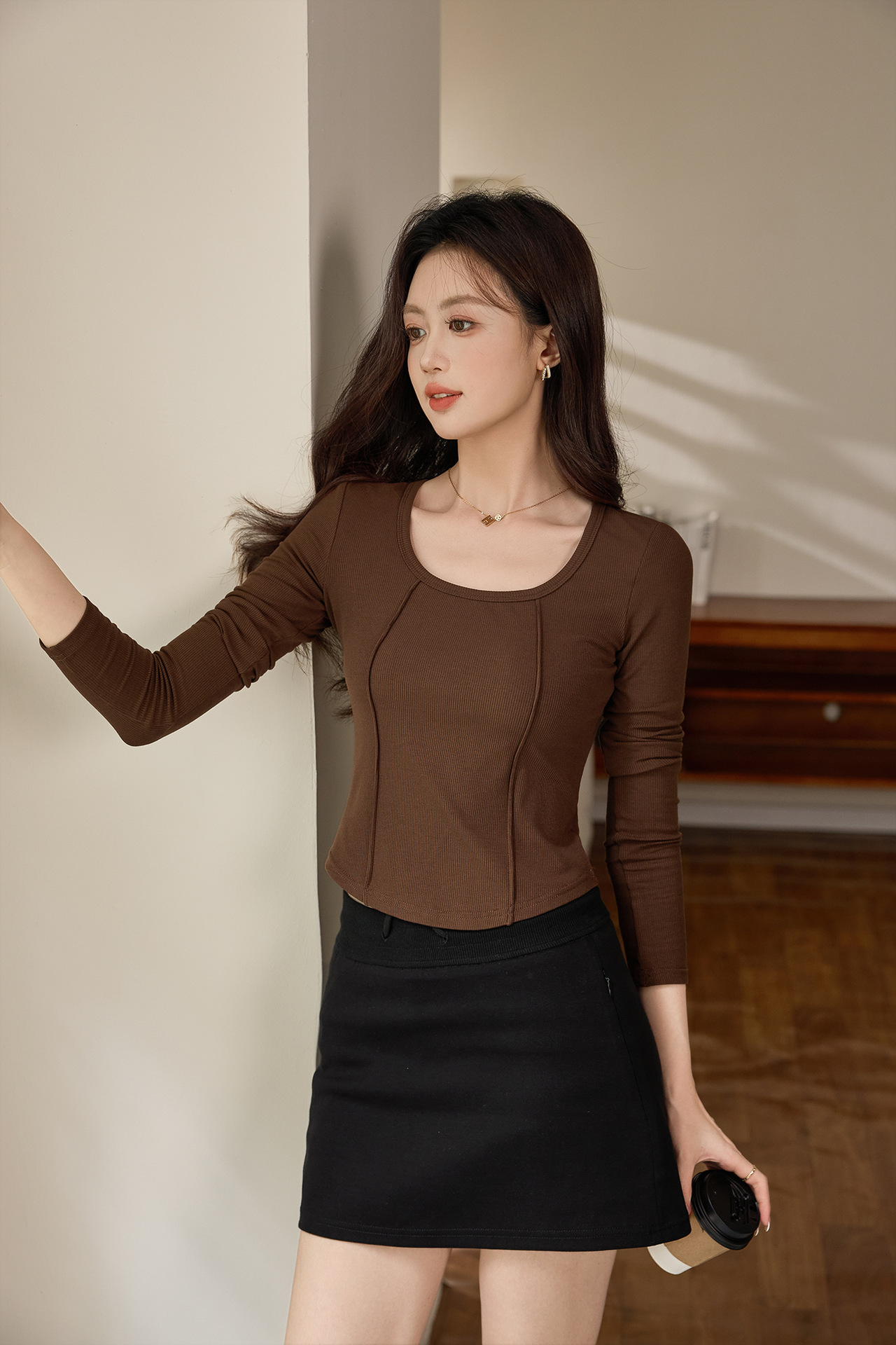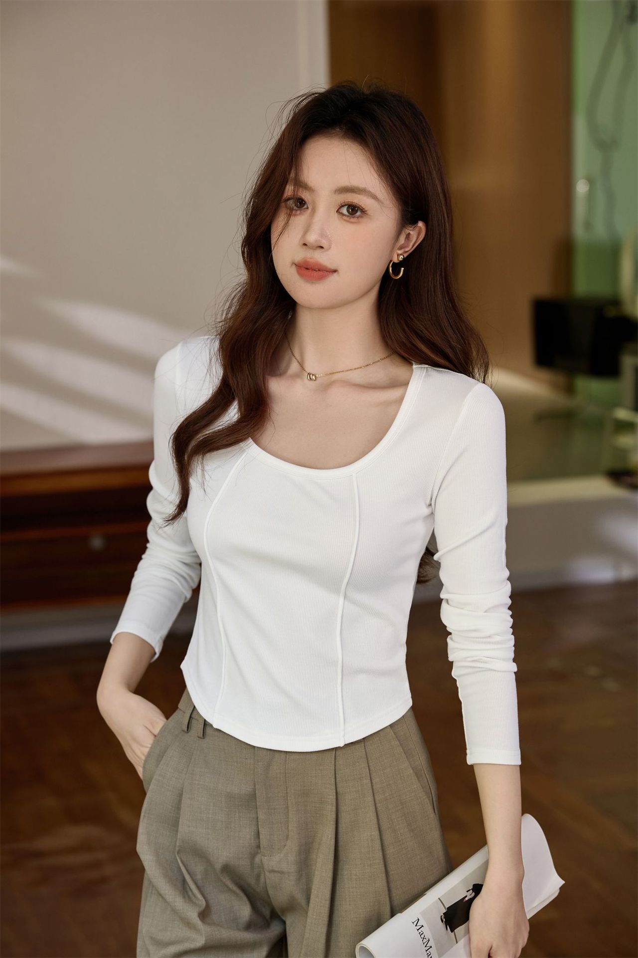 #Quality screening product #polished high-waisted short T-shirt women's big U-neck autumn new long-sleeved Spice Girl exposed navel thin velvet top