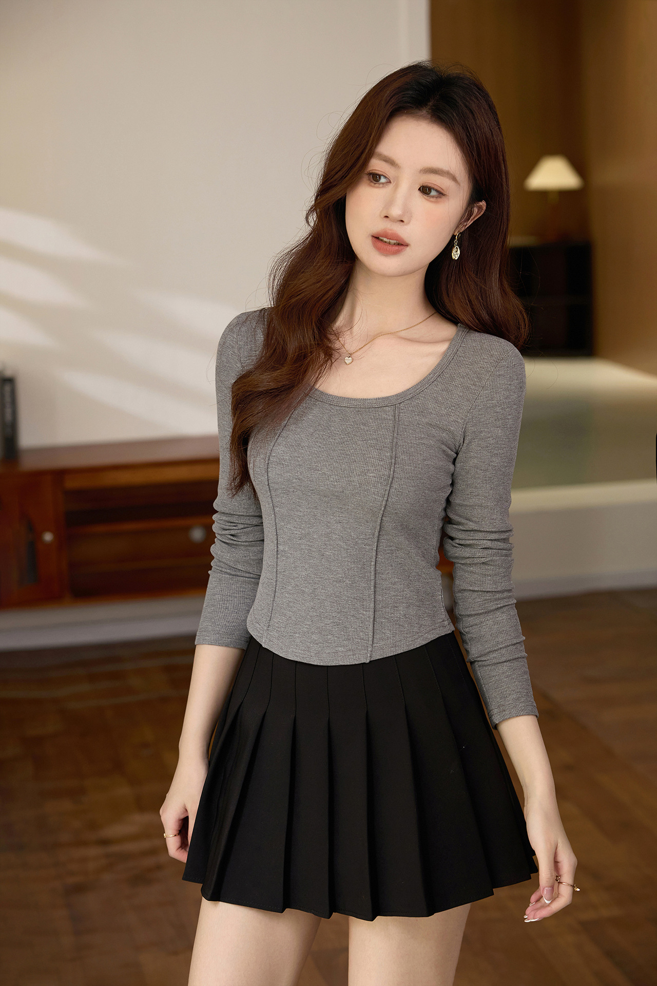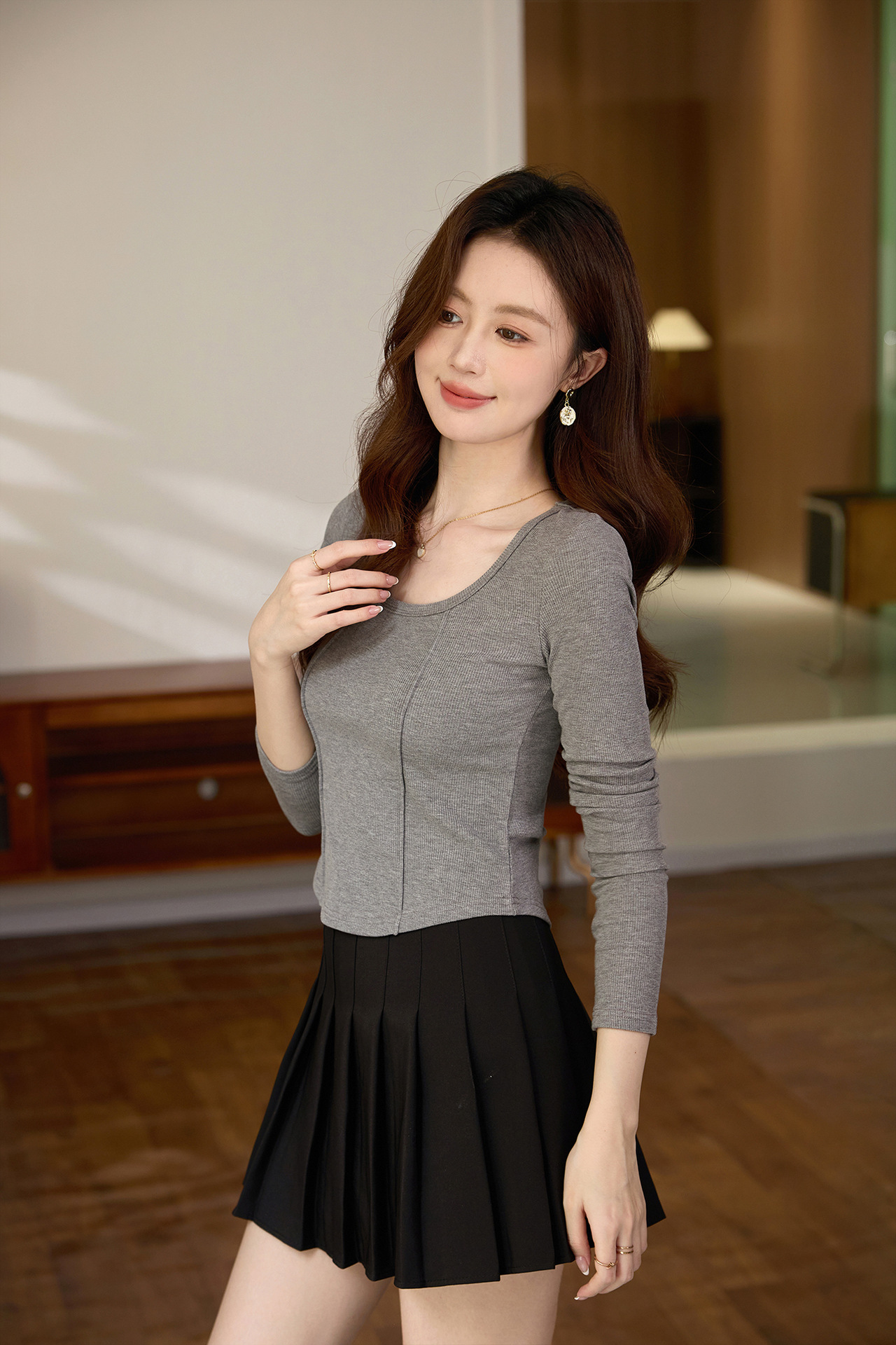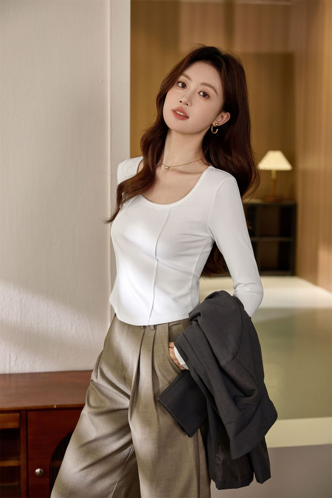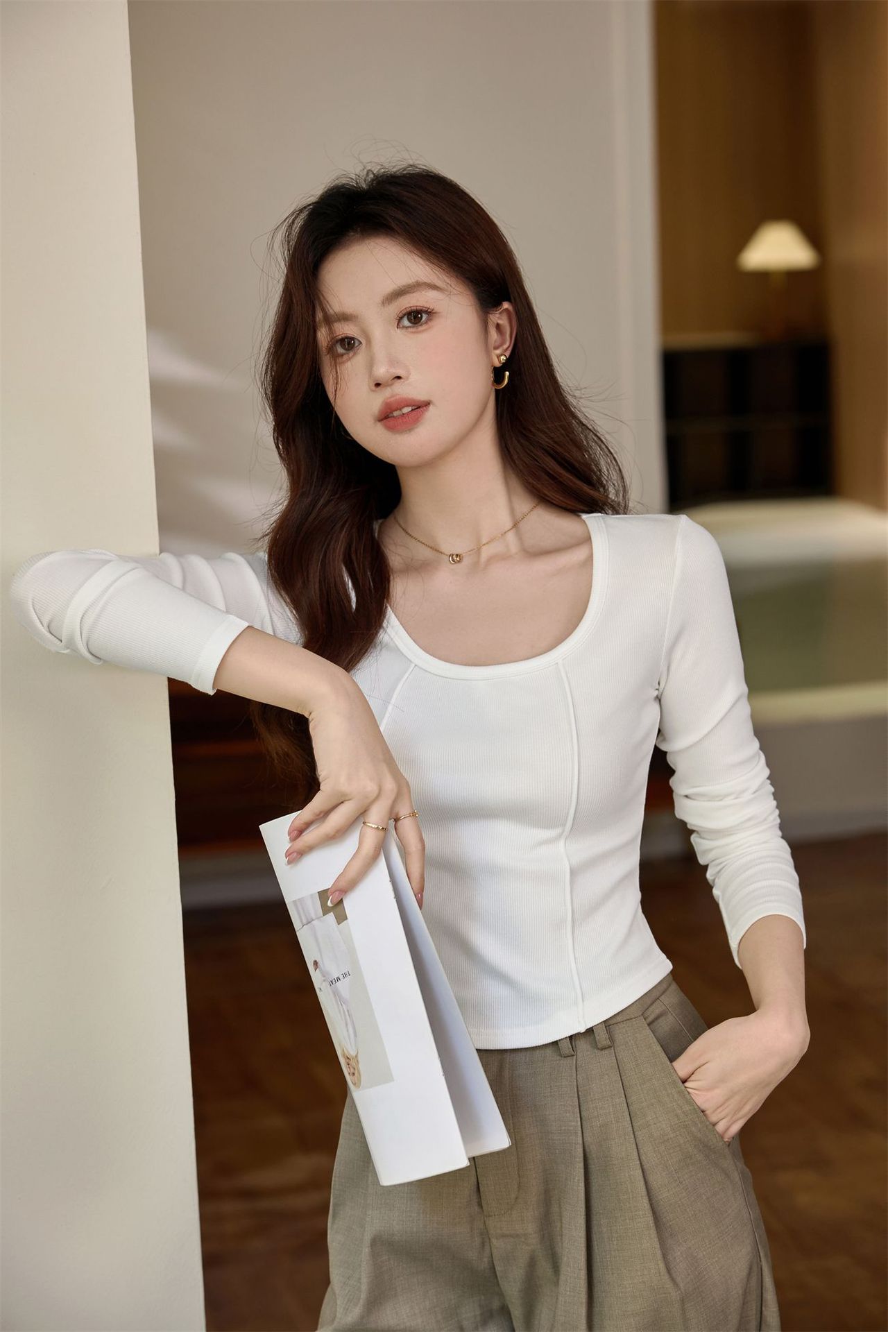 #Quality screening product #polished high-waisted short T-shirt women's big U-neck autumn new long-sleeved Spice Girl exposed navel thin velvet top