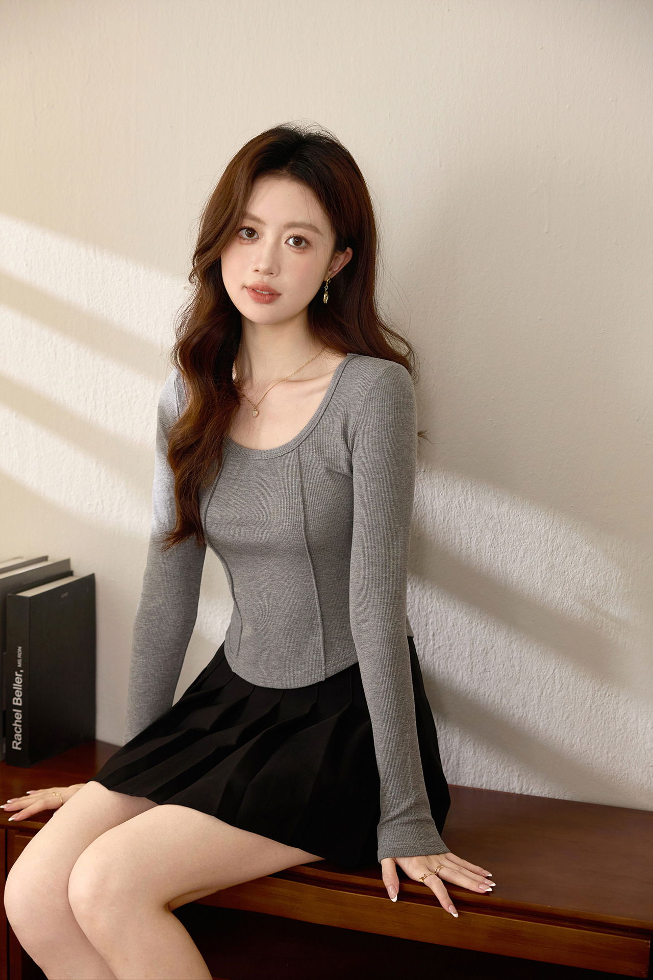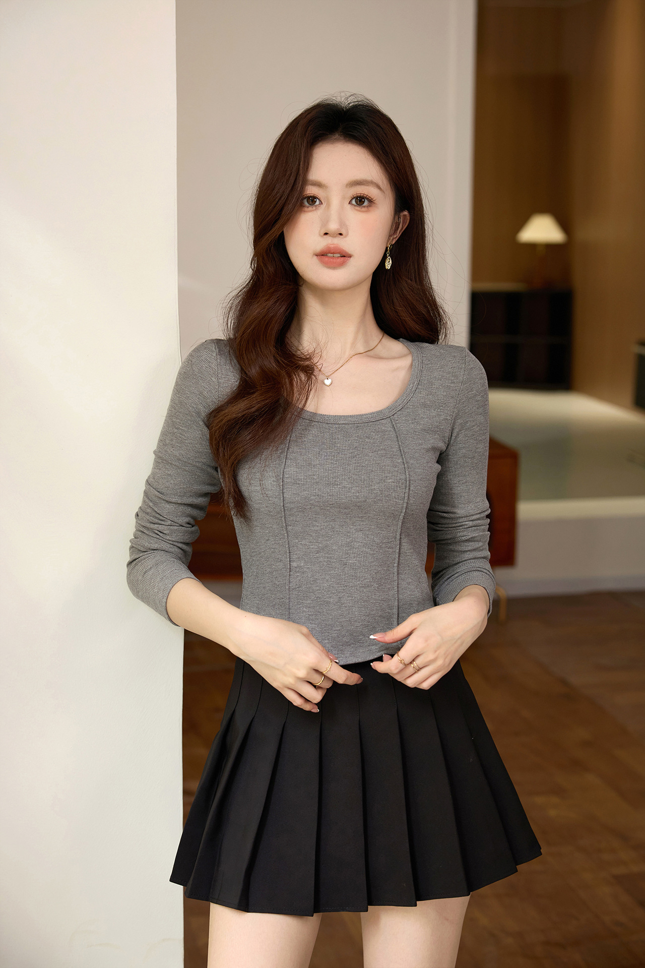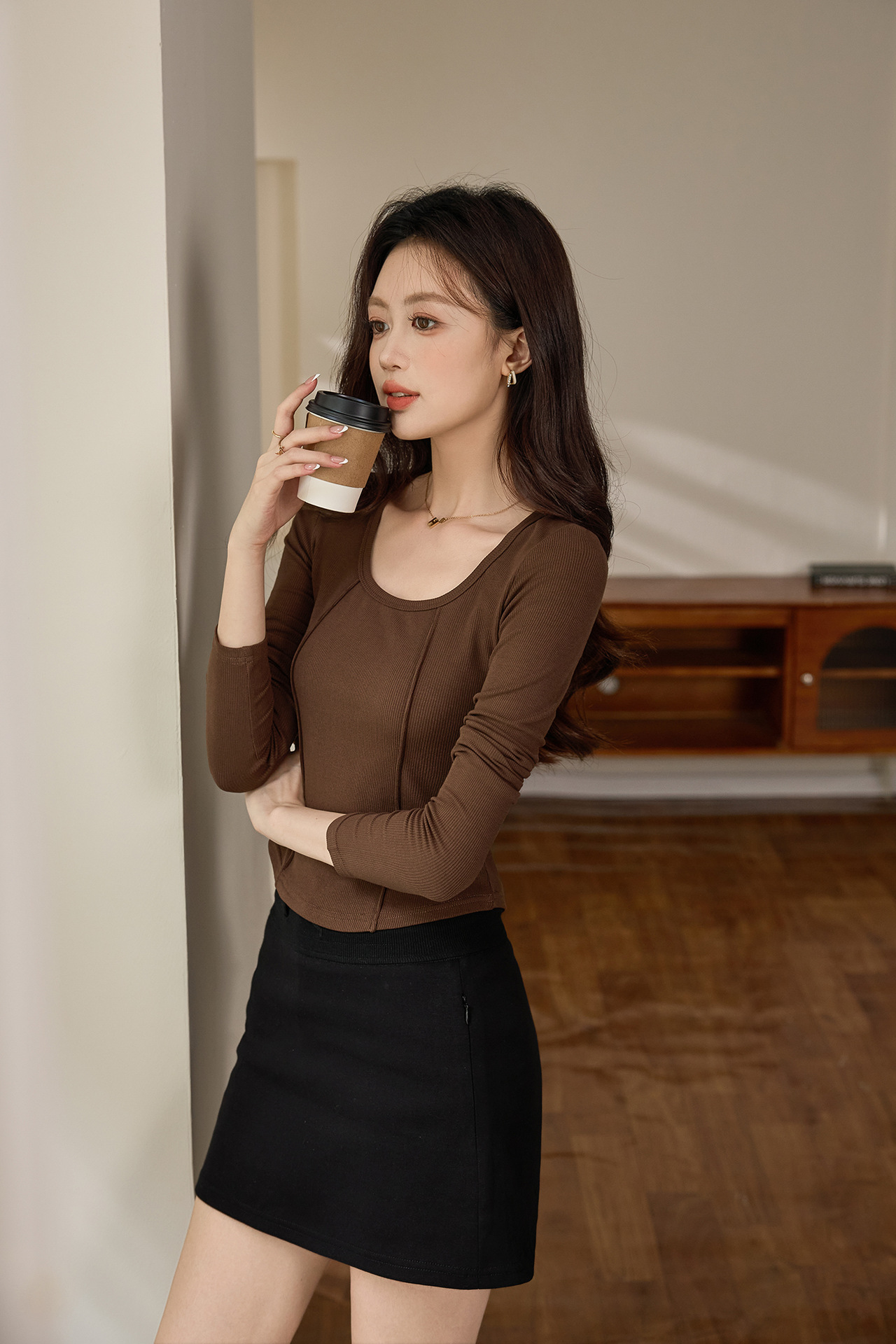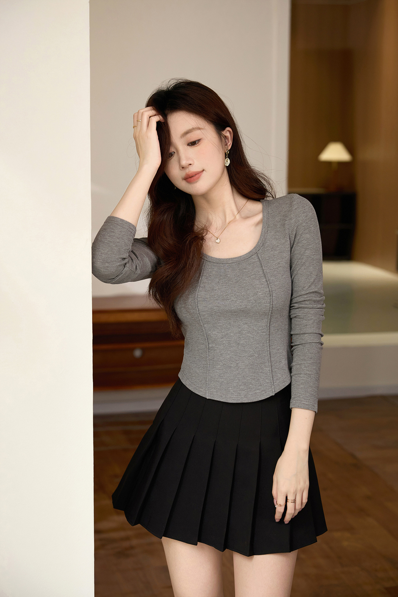 #Quality screening product #polished high-waisted short T-shirt women's big U-neck autumn new long-sleeved Spice Girl exposed navel thin velvet top