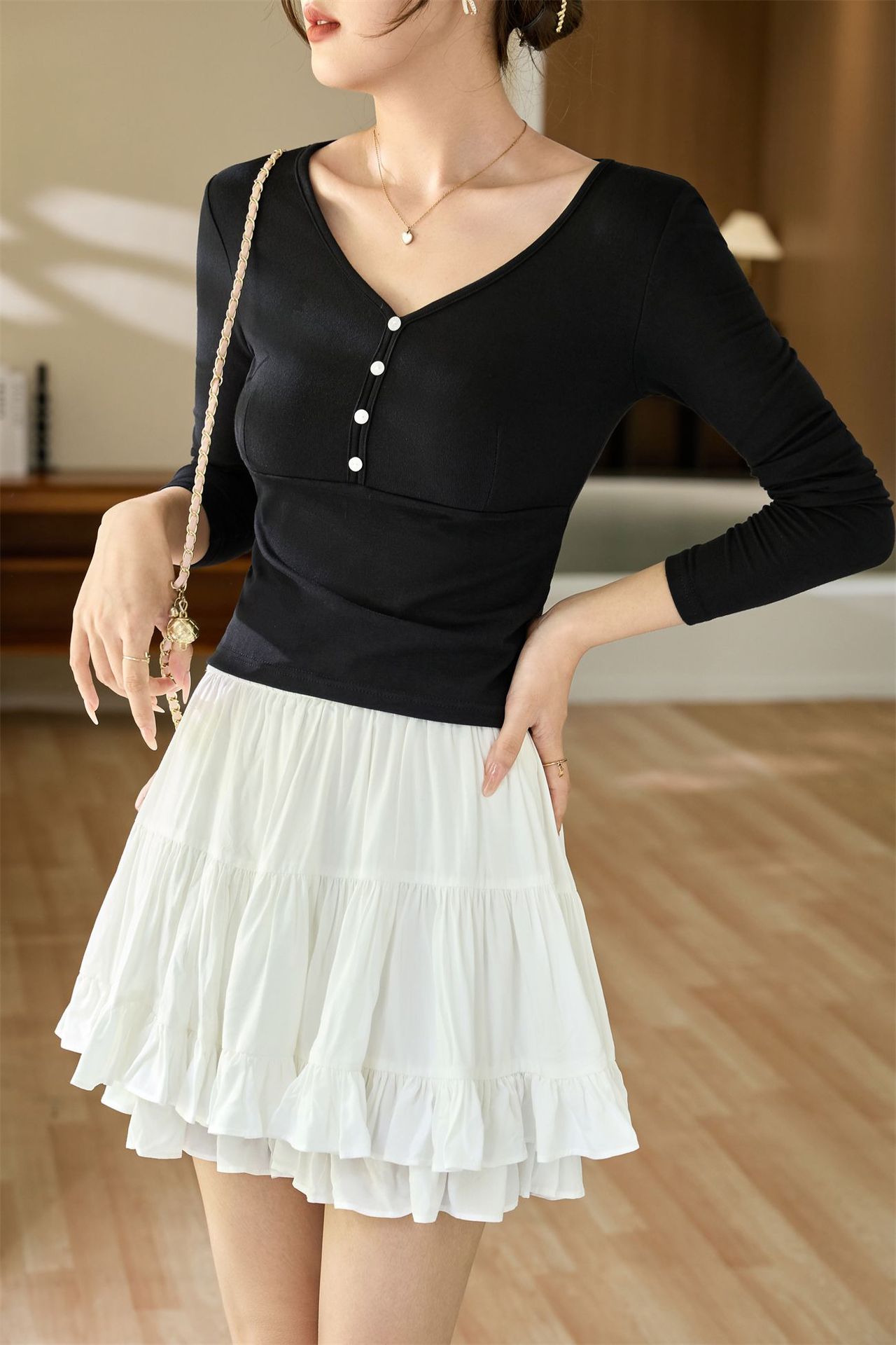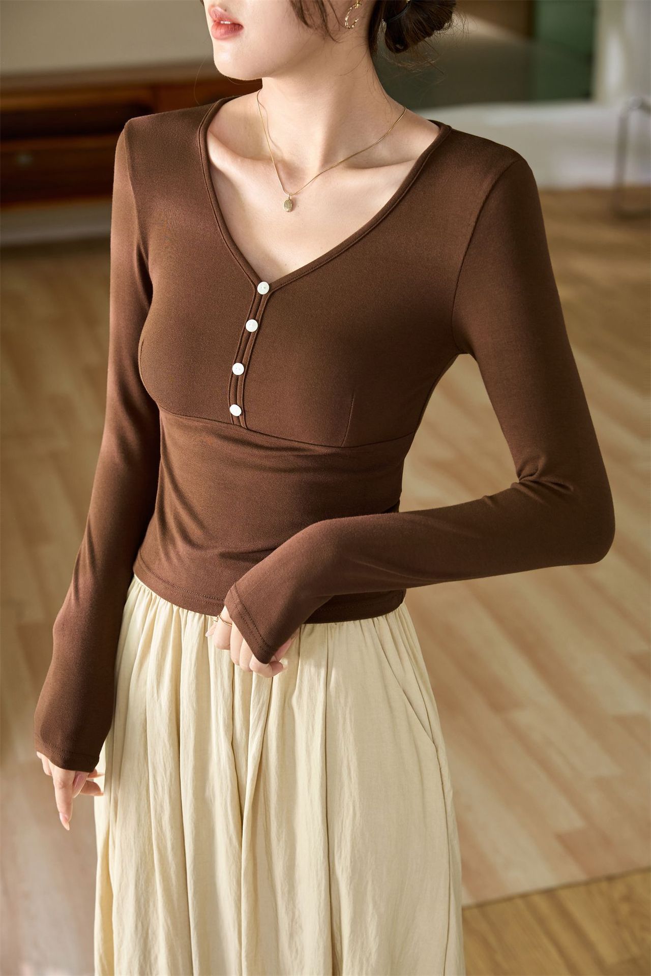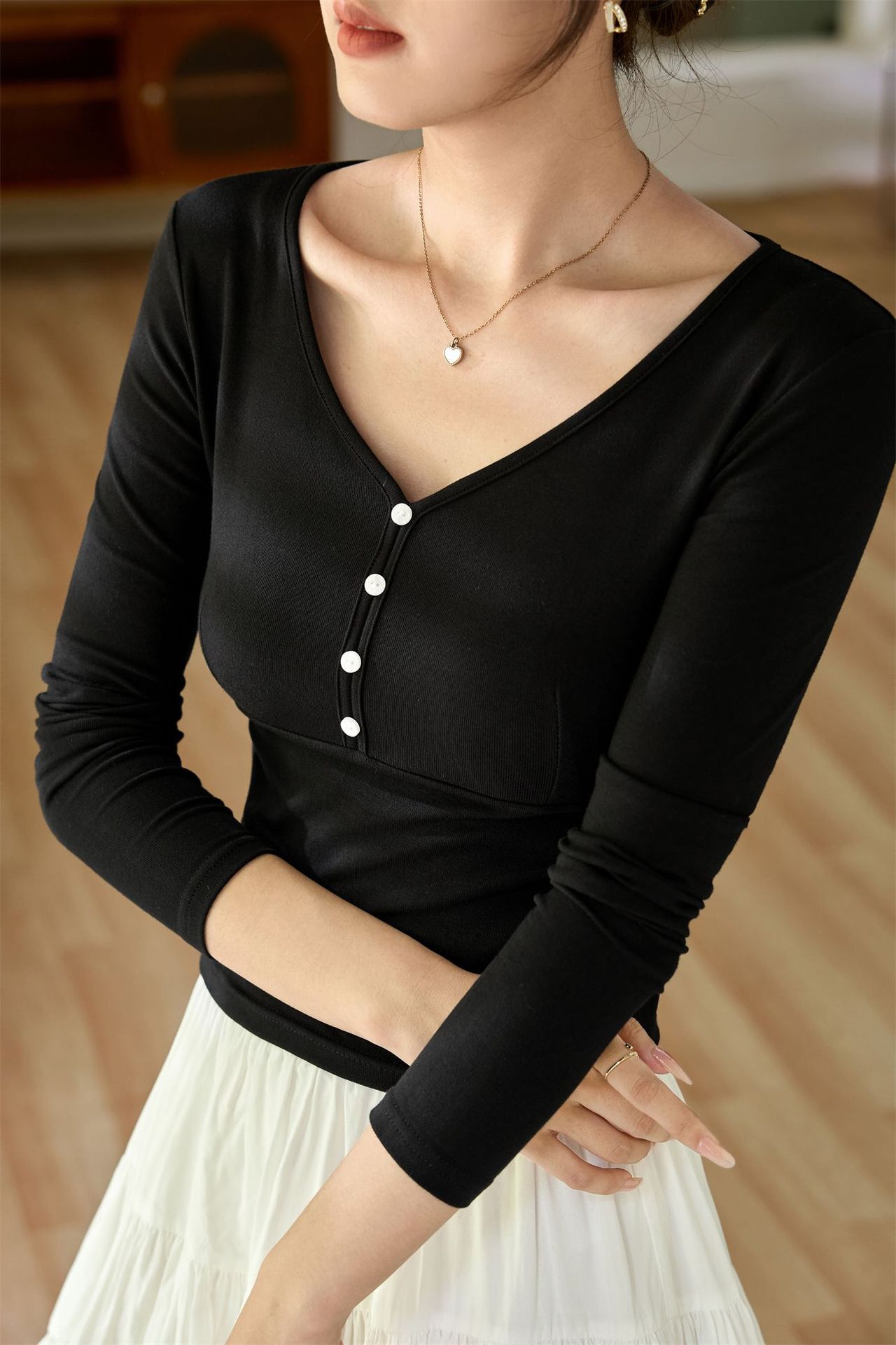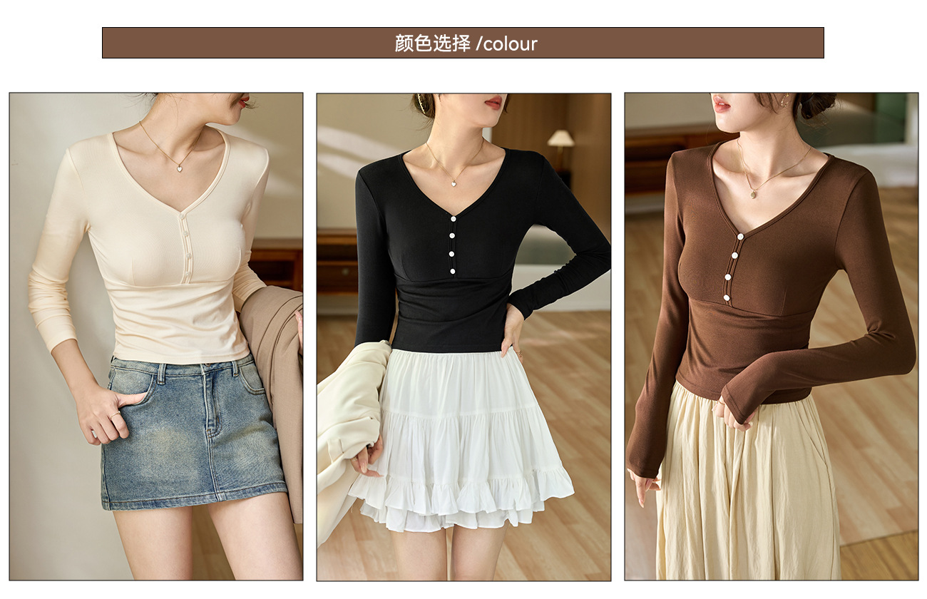 #Quality to do high quality #temperament age reduction design sense T-shirt women's long sleeves 2026 autumn clothes new shell buckle pure desire top