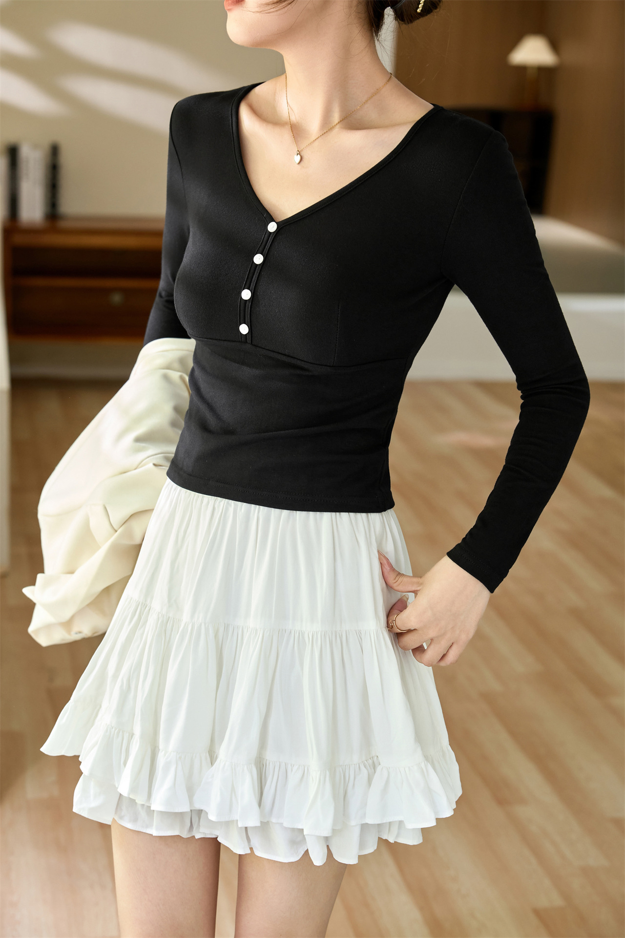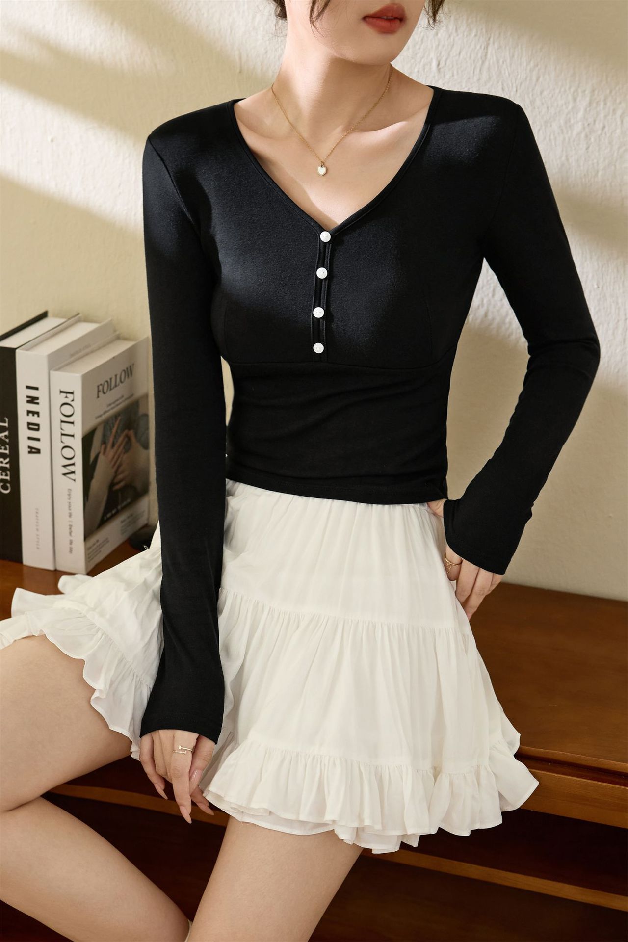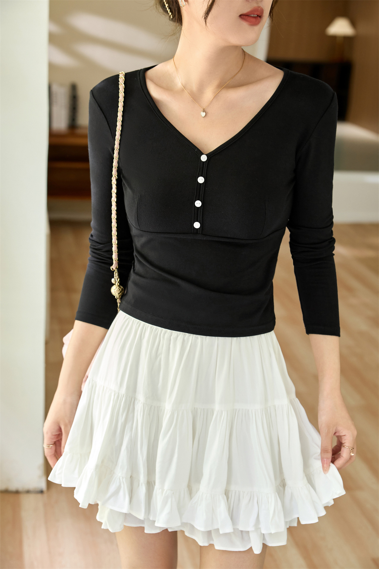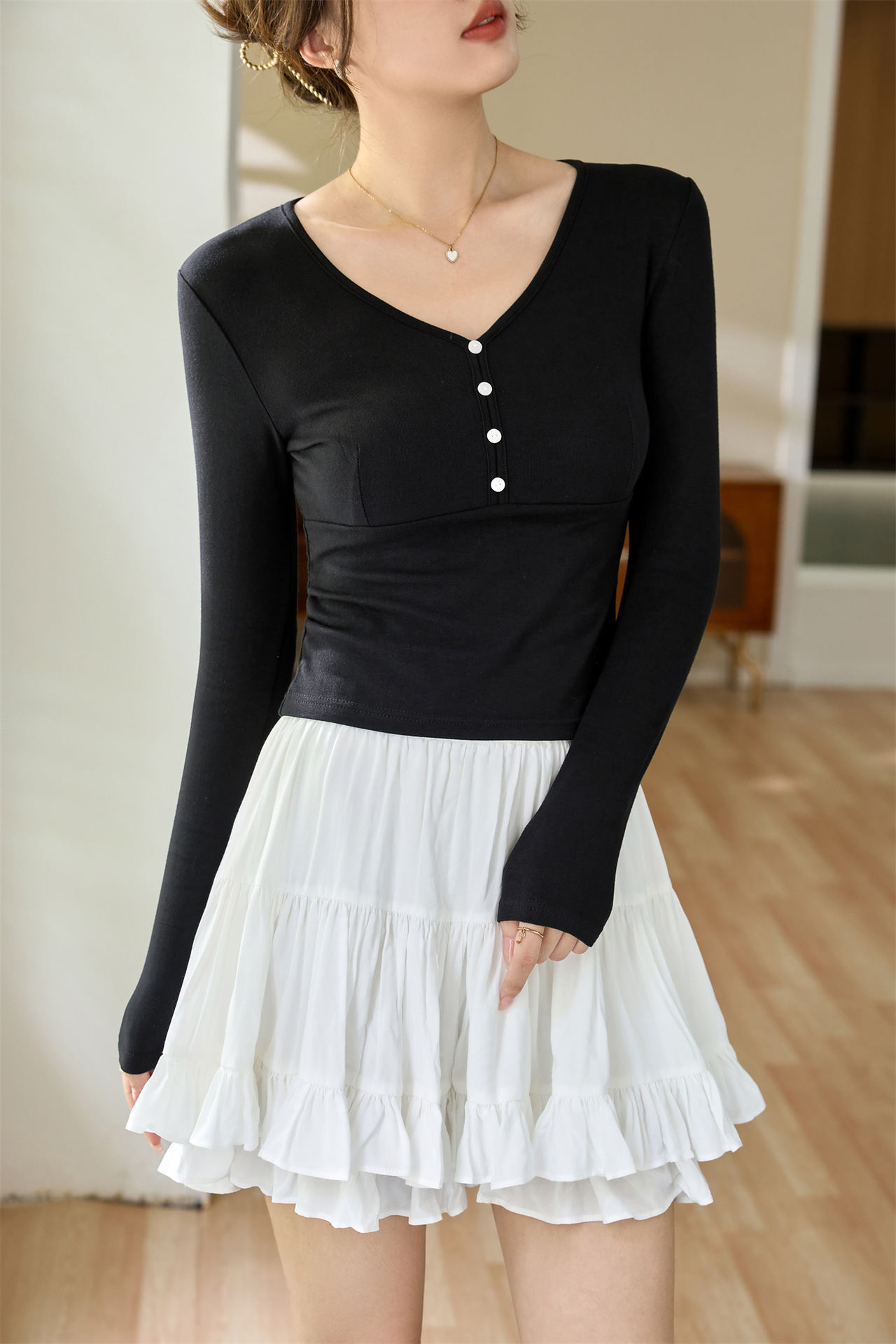 #Quality to do high quality #temperament age reduction design sense T-shirt women's long sleeves 2026 autumn clothes new shell buckle pure desire top