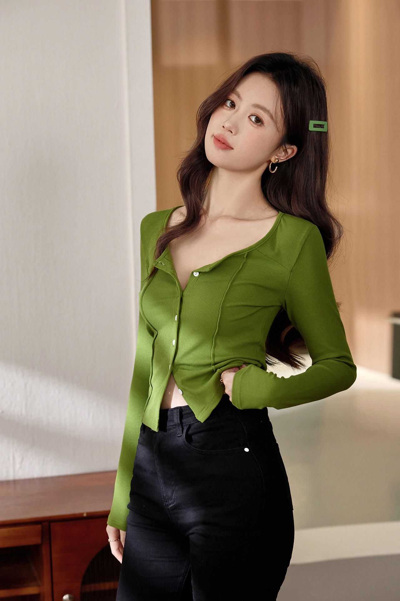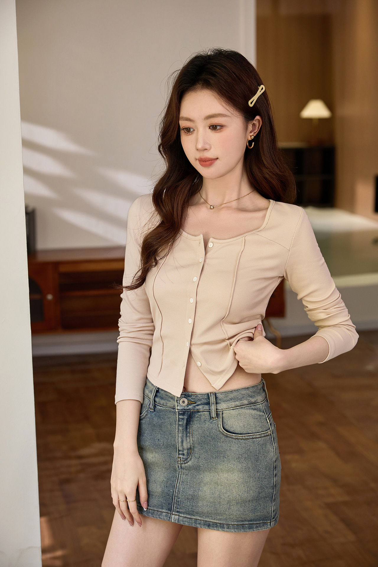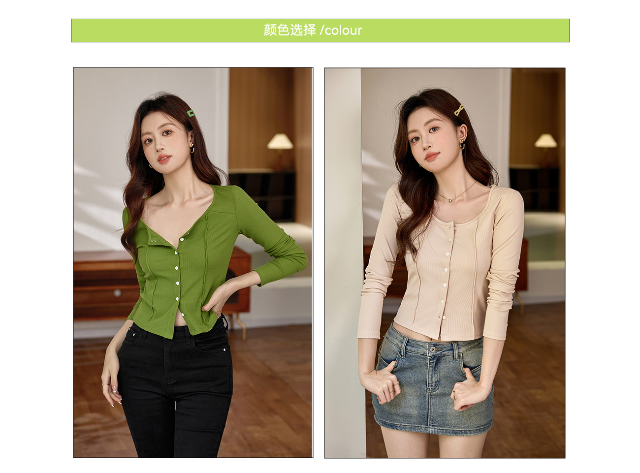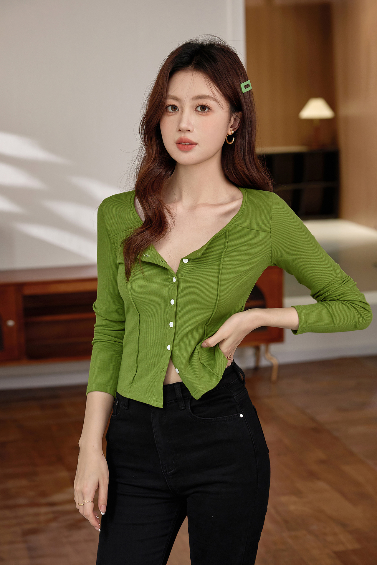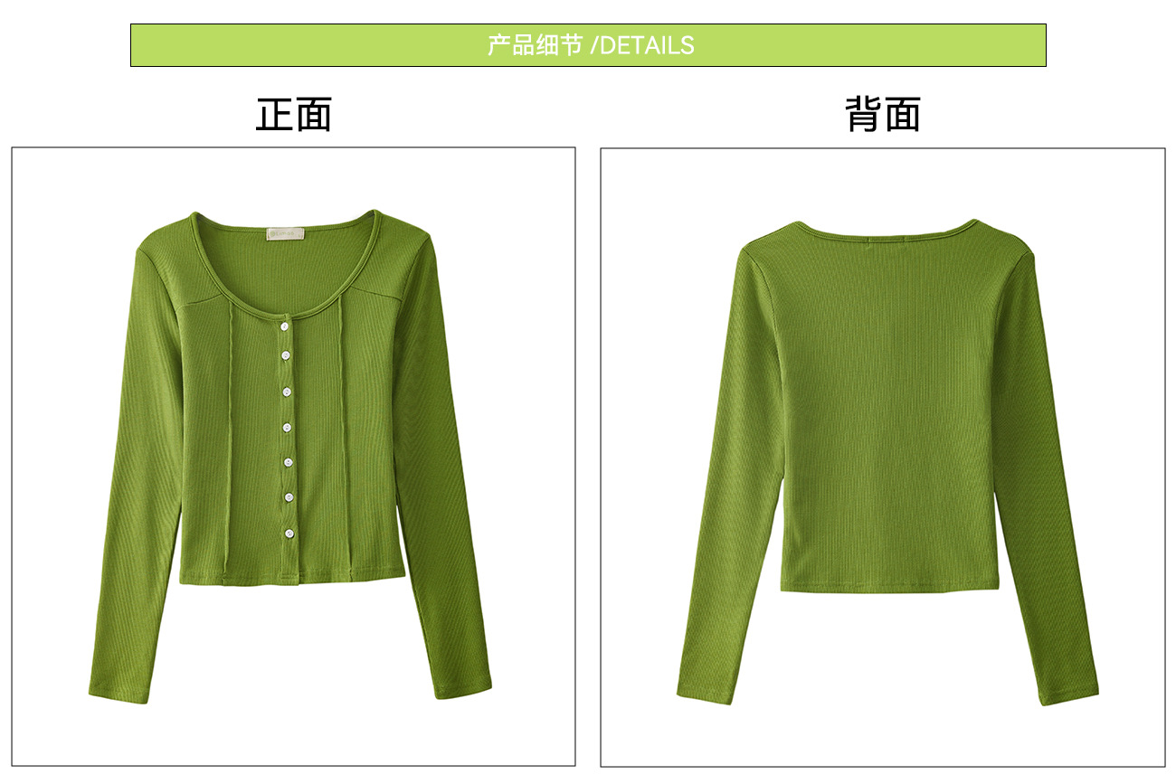 #Quality to make high-quality #shell button high-waisted short T-shirt Spice Girl Navel Sexy Long Sleeve Temperament Pure Cotton Top