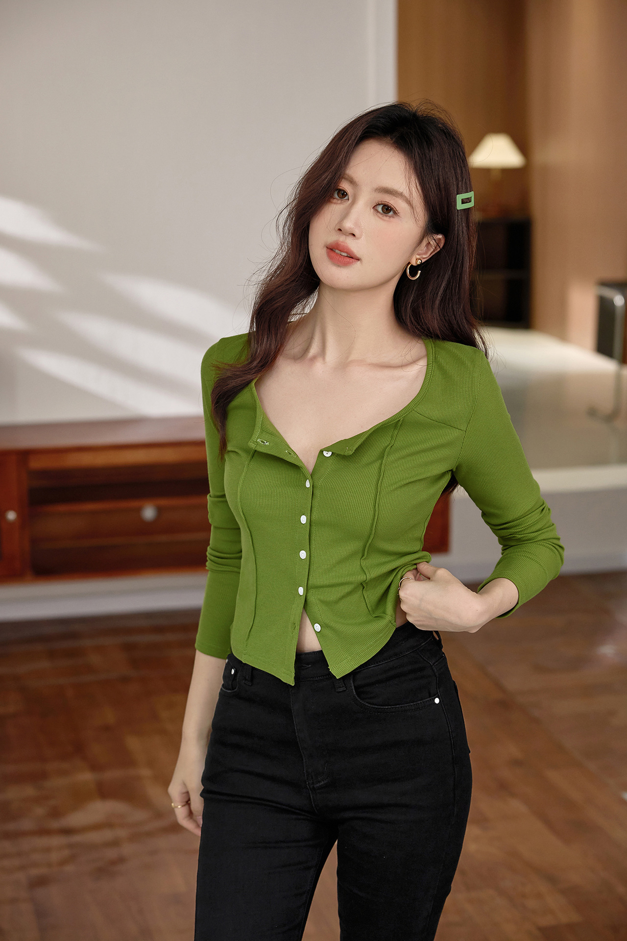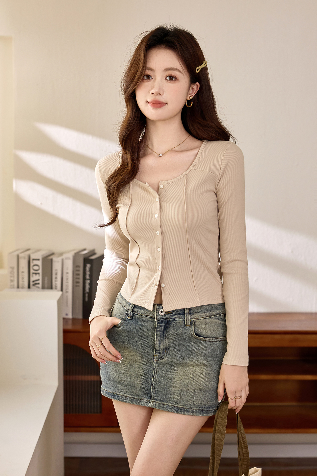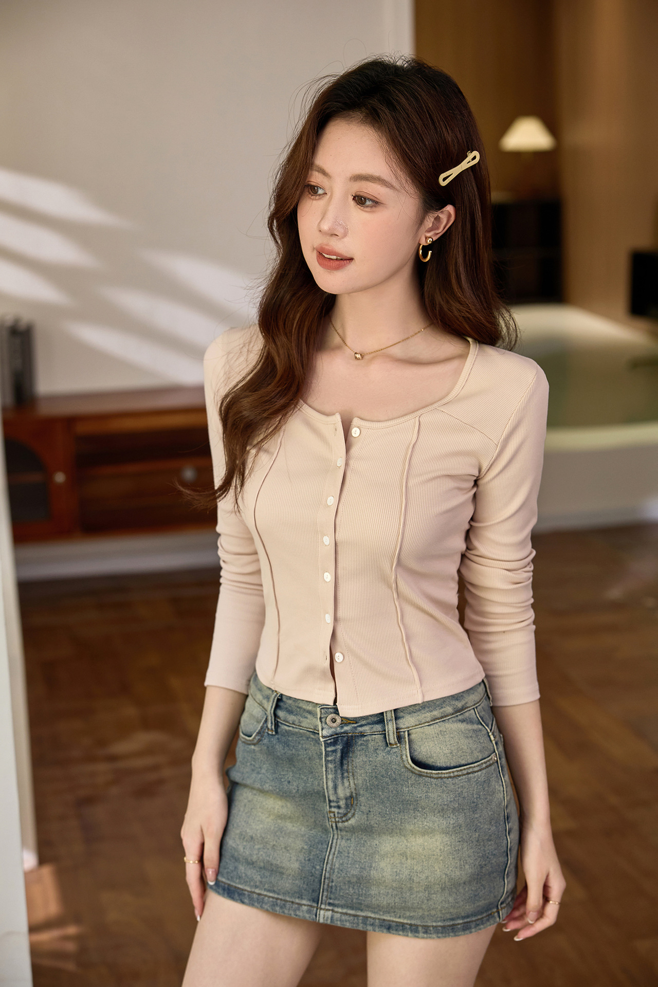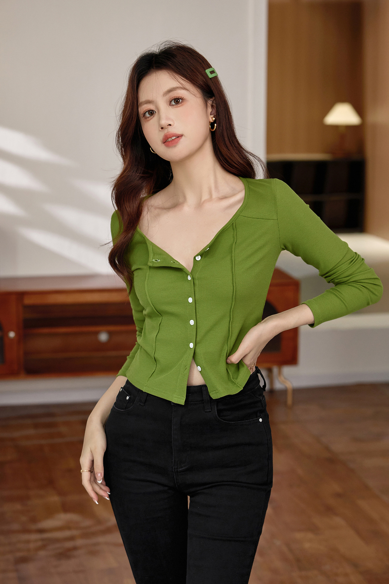 #Quality to make high-quality #shell button high-waisted short T-shirt Spice Girl Navel Sexy Long Sleeve Temperament Pure Cotton Top