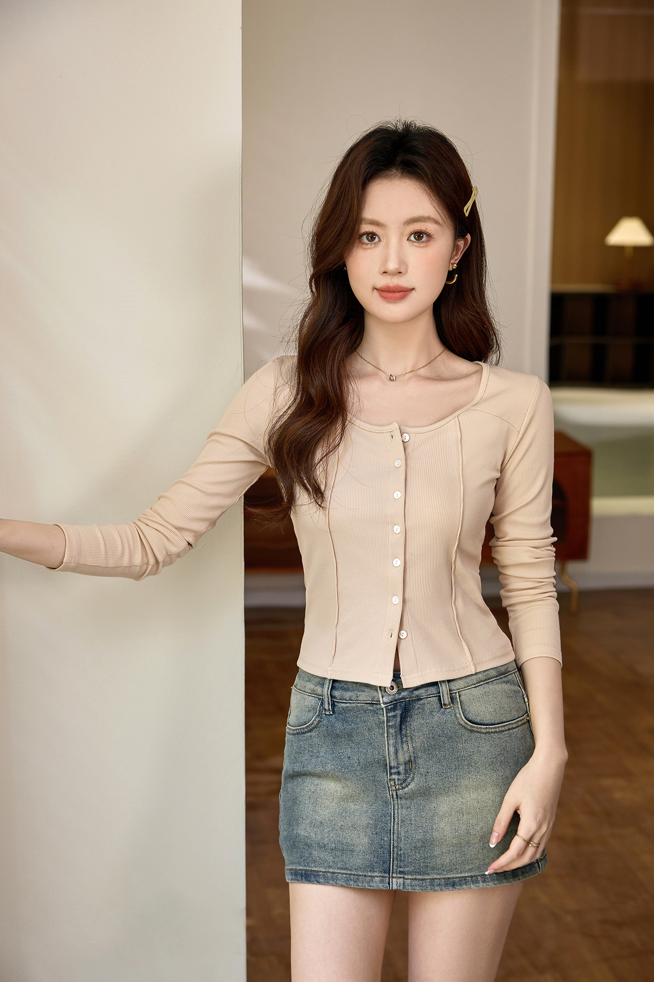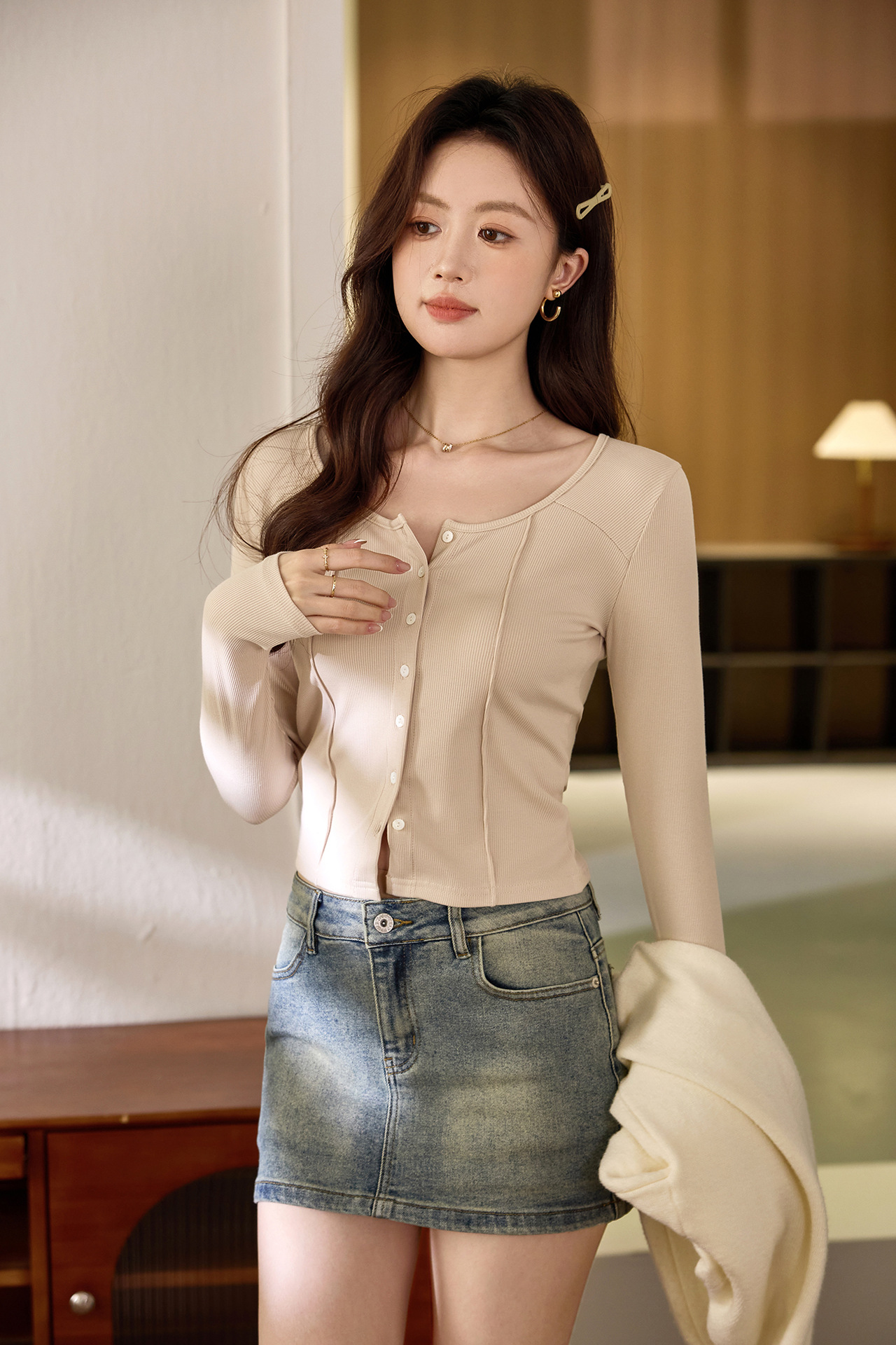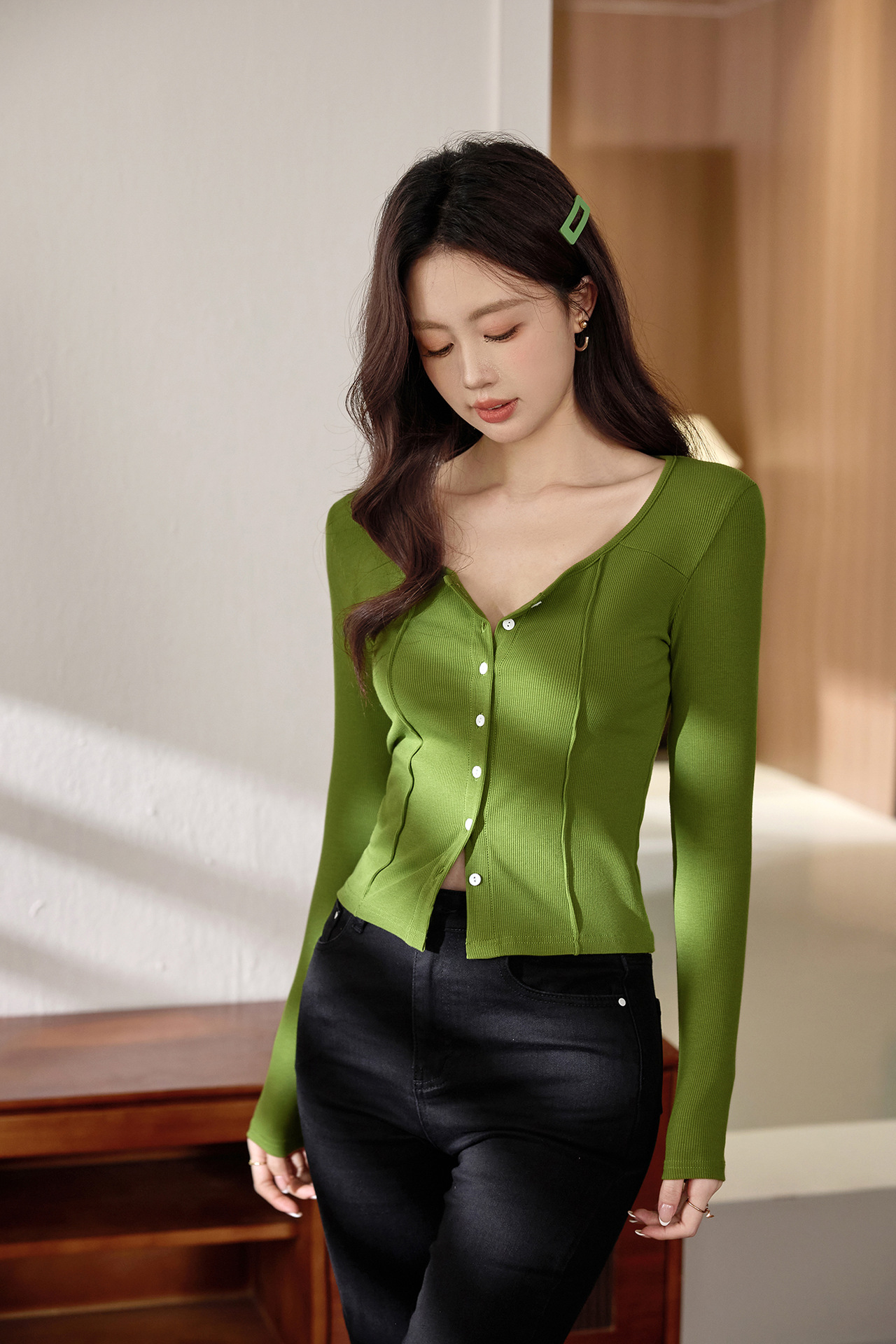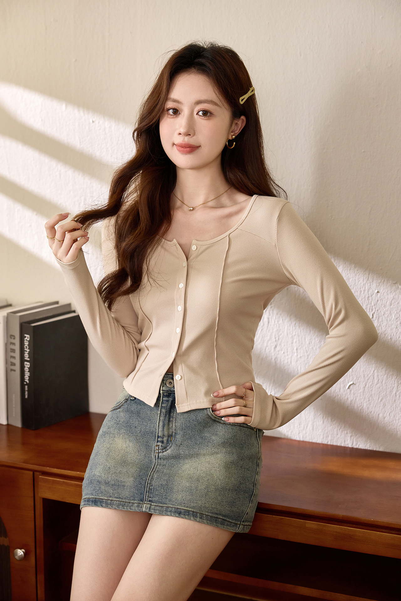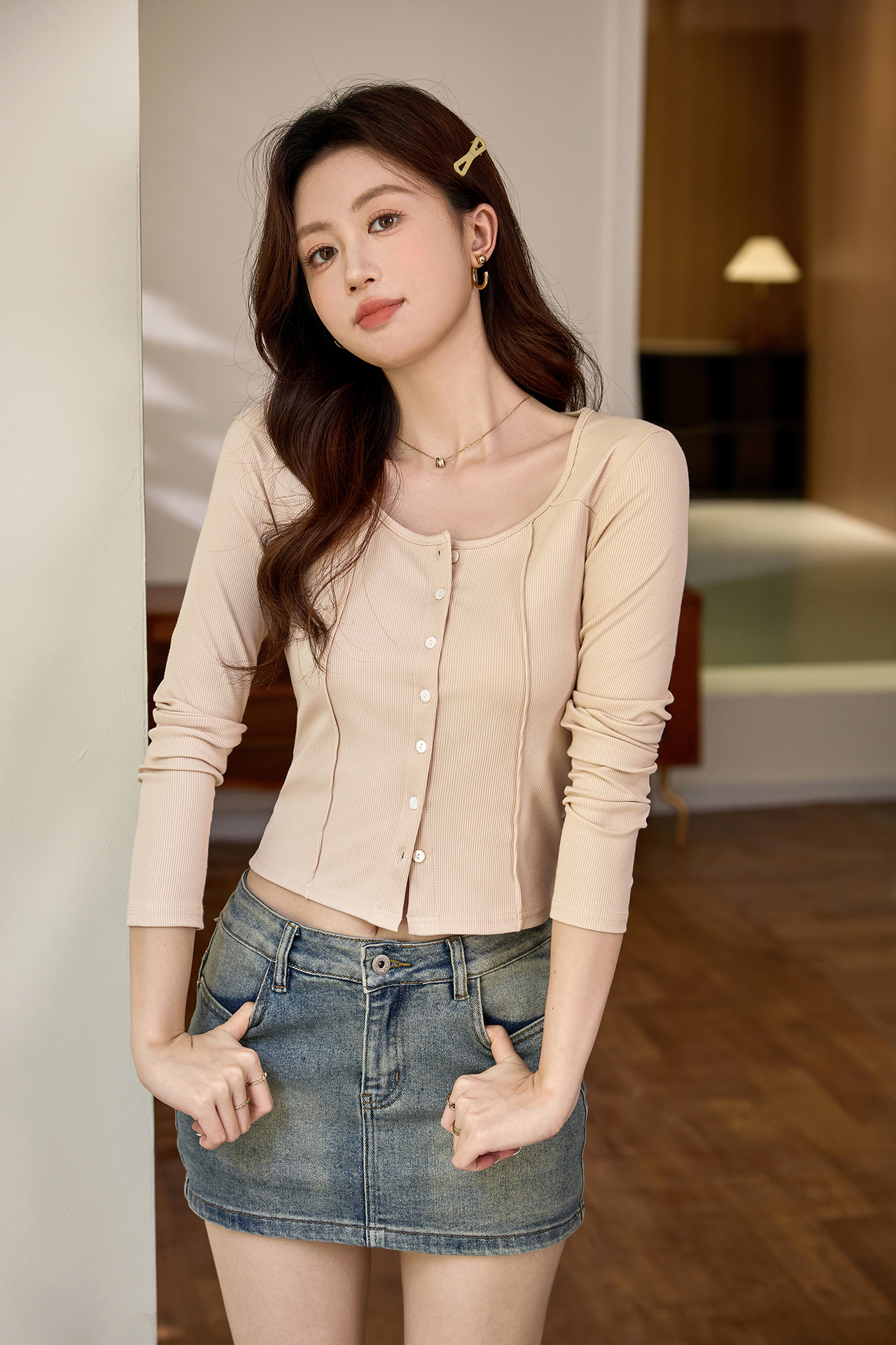 #Quality to make high-quality #shell button high-waisted short T-shirt Spice Girl Navel Sexy Long Sleeve Temperament Pure Cotton Top