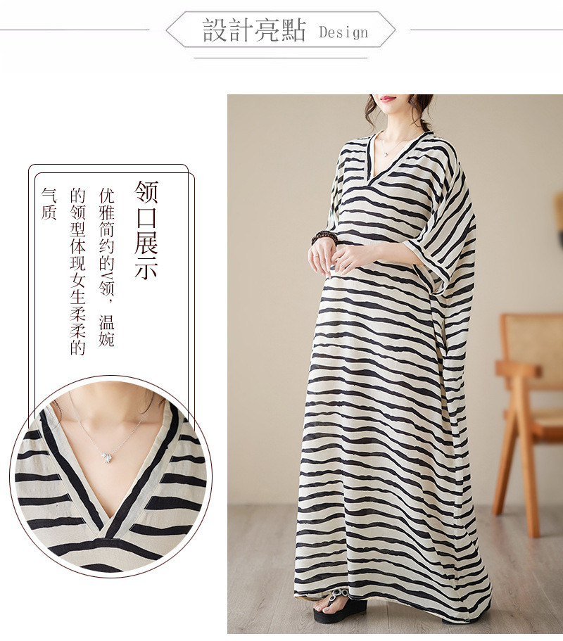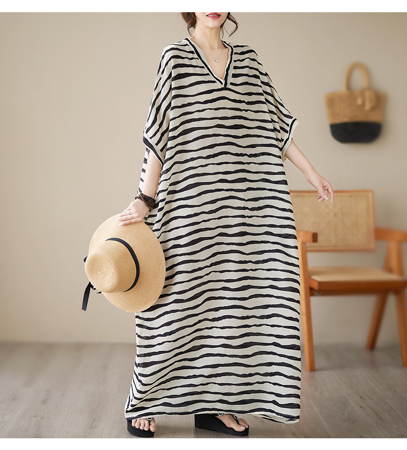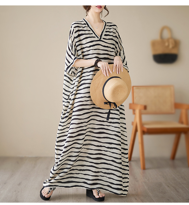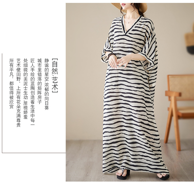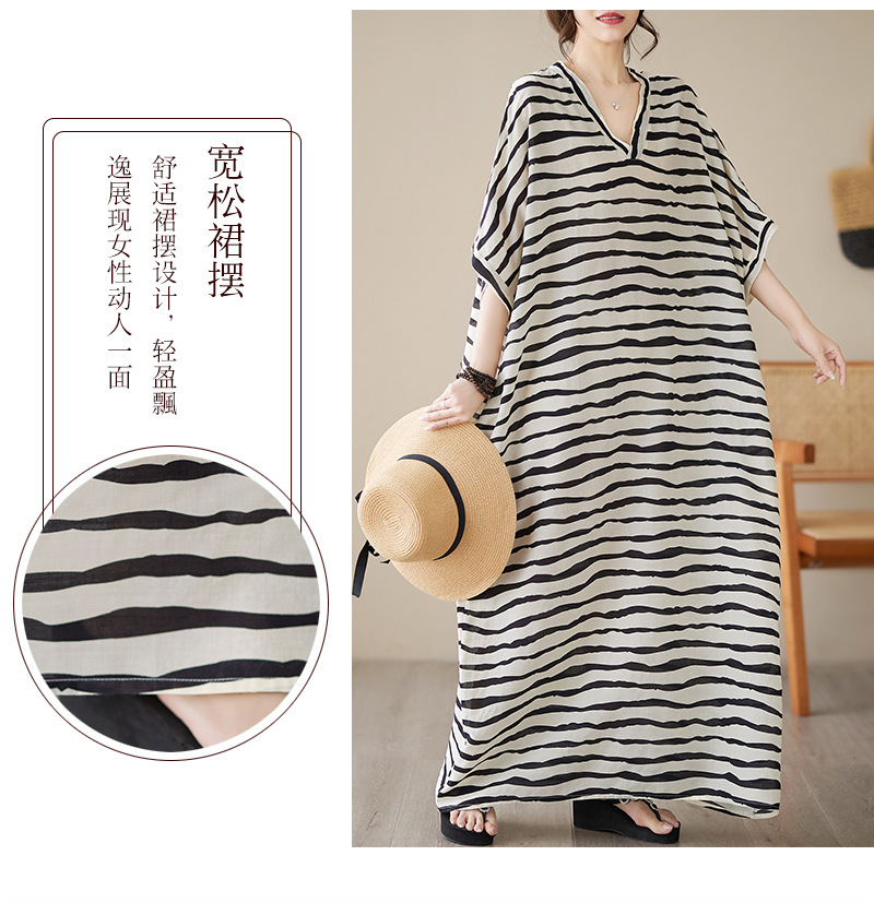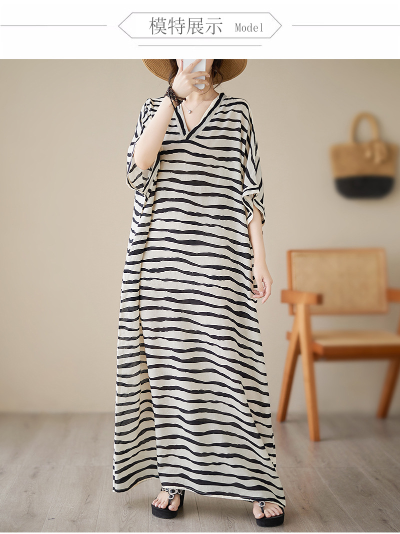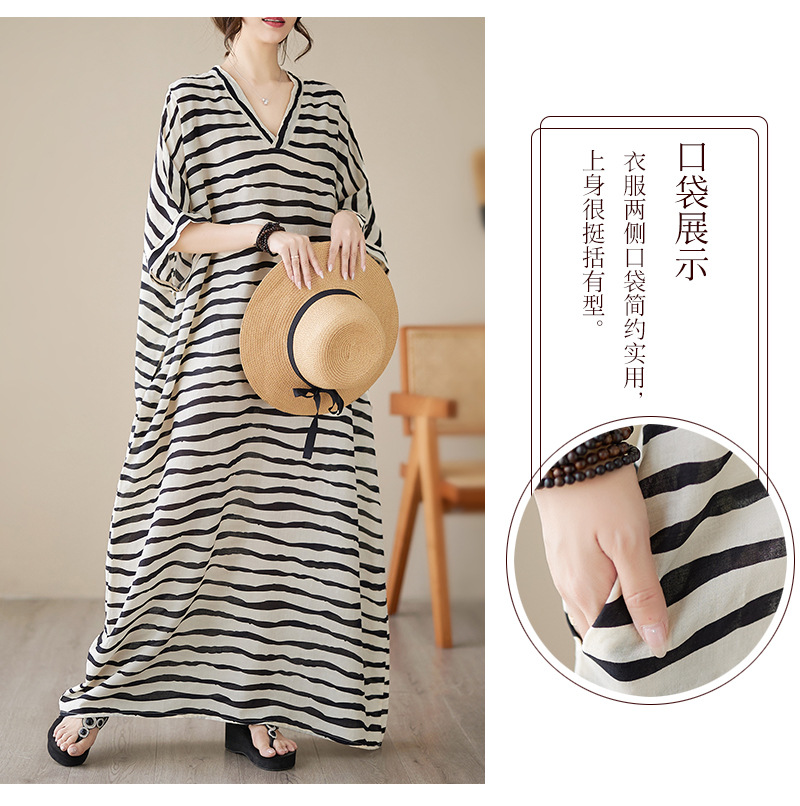 Real shot 2023 summer thin cotton and linen V-neck large size loose literary holiday style medium and long dress women