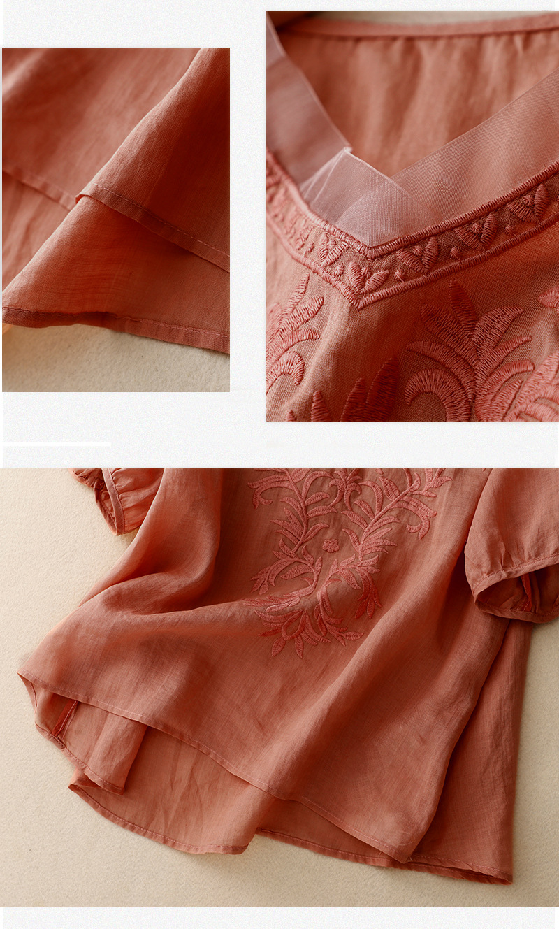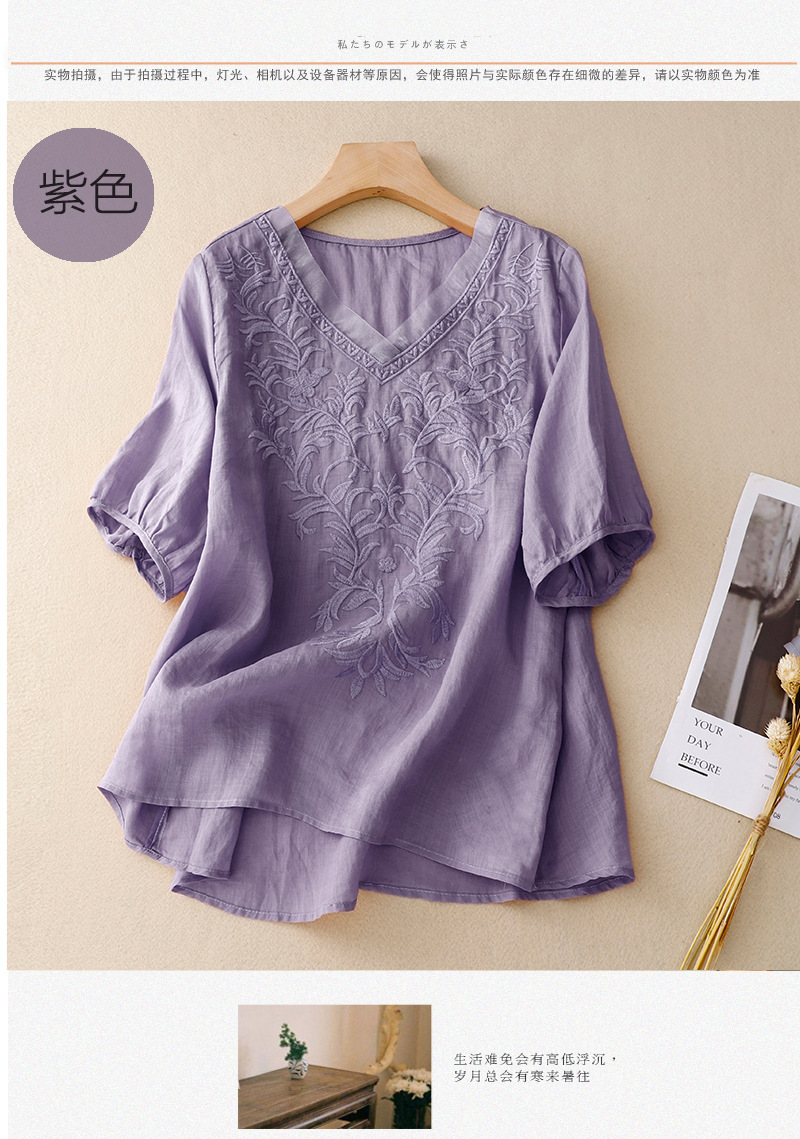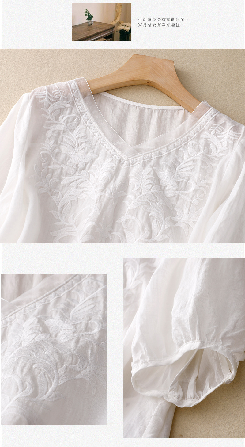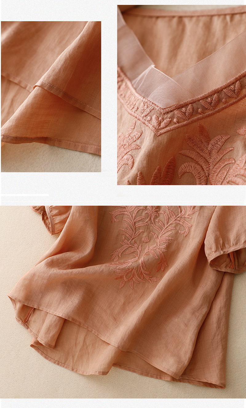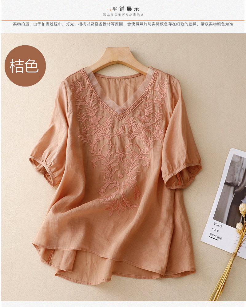 Real shot 2024 summer new cotton and linen embroidered literary and retro top T-shirt women