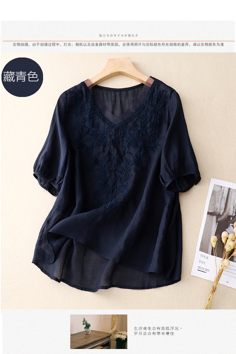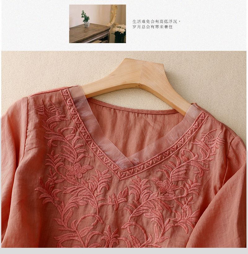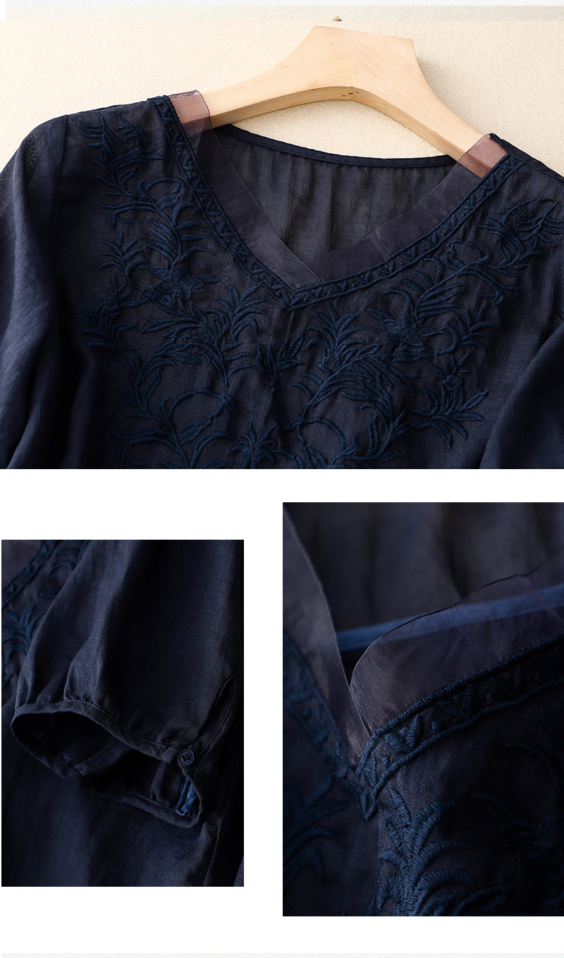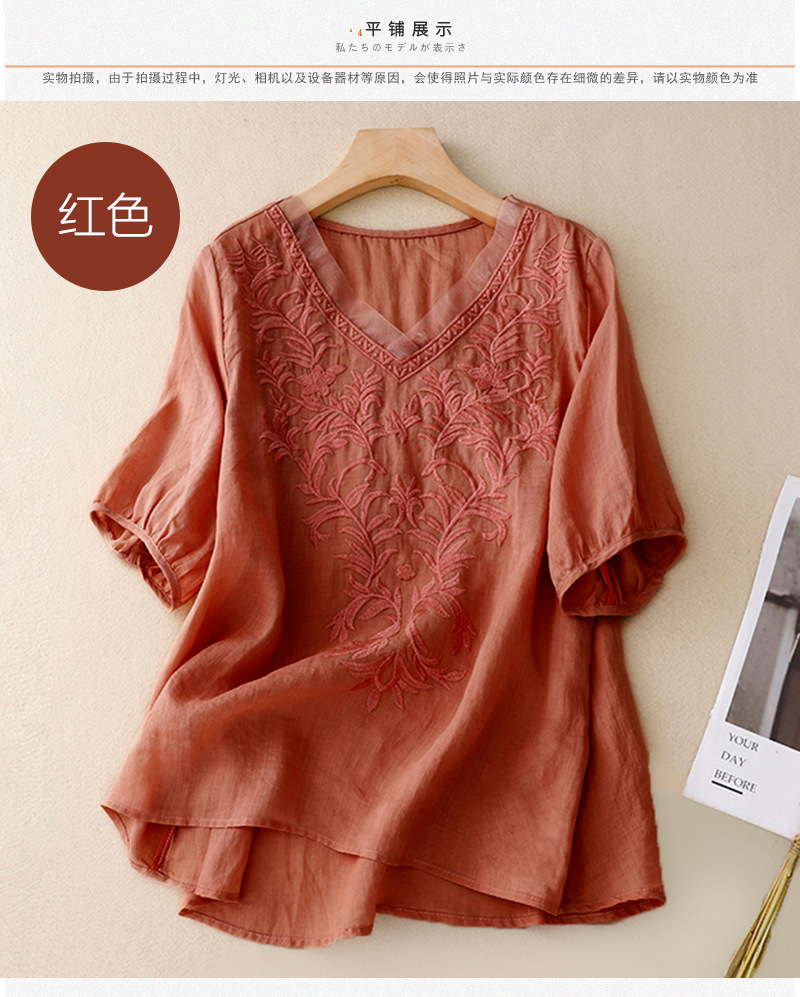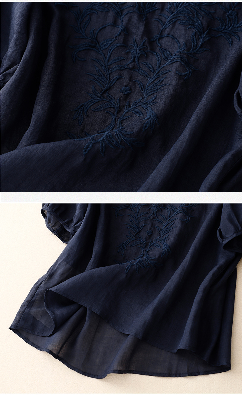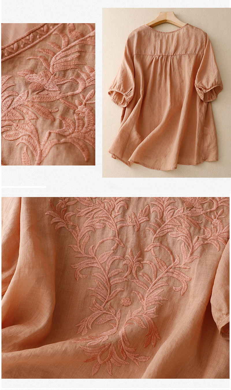 Real shot 2024 summer new cotton and linen embroidered literary and retro top T-shirt women