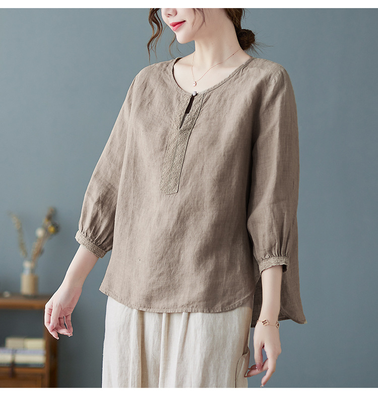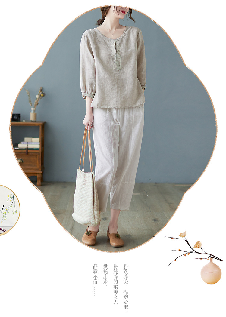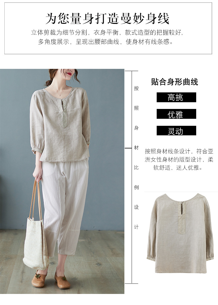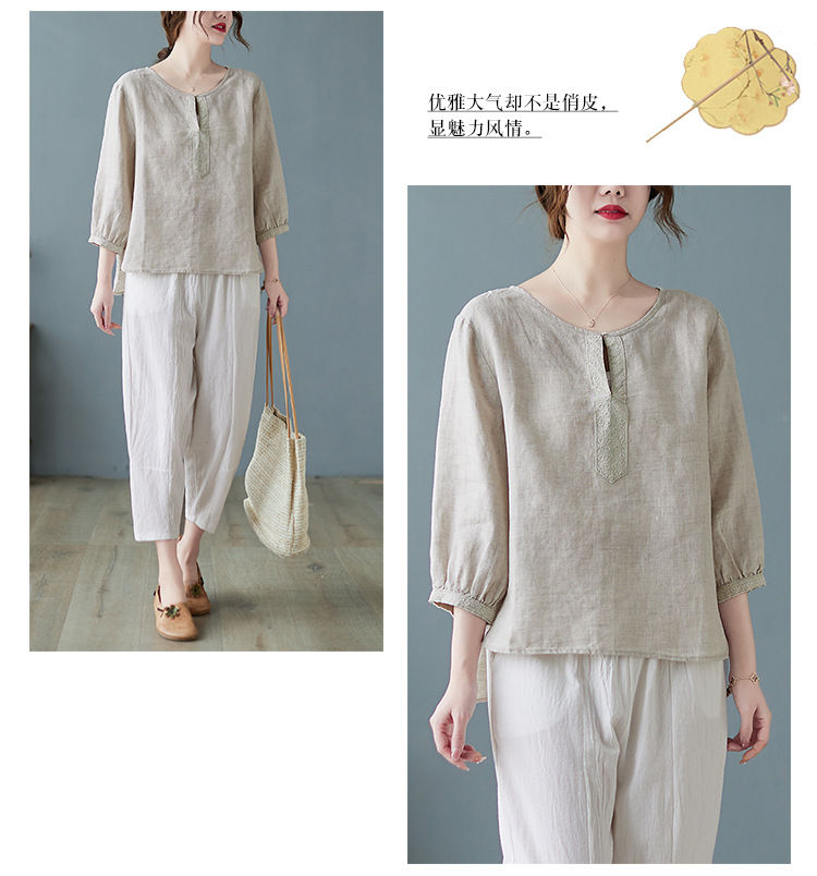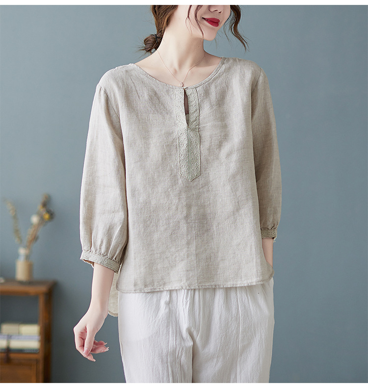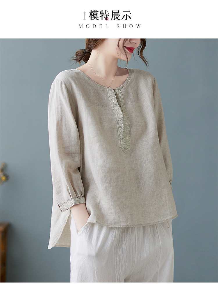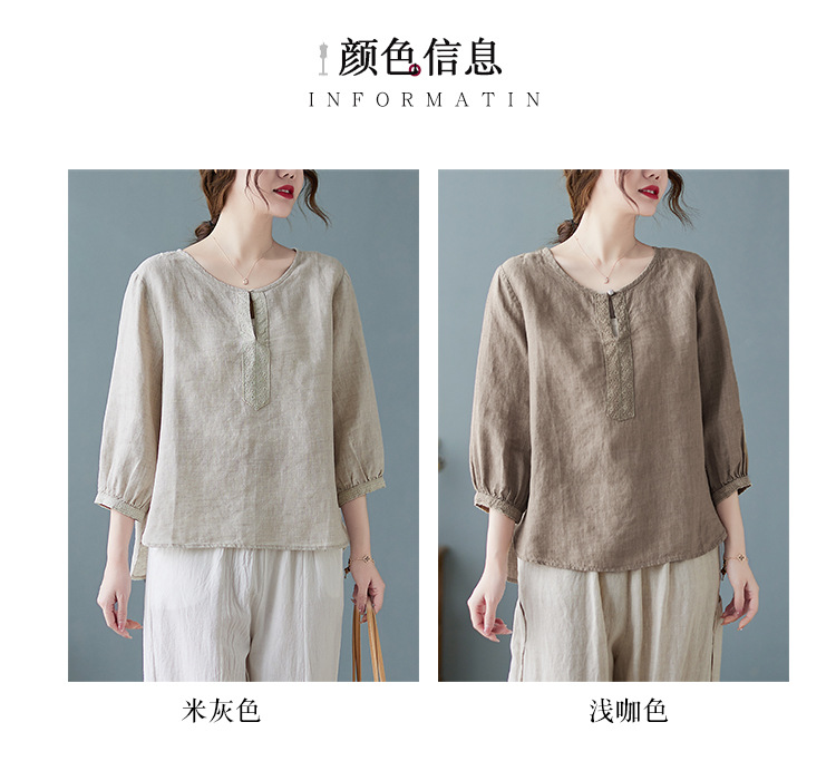 Real shot 2024 summer new cotton and linen literary and retro loose short-sleeved shirt top T-shirt women